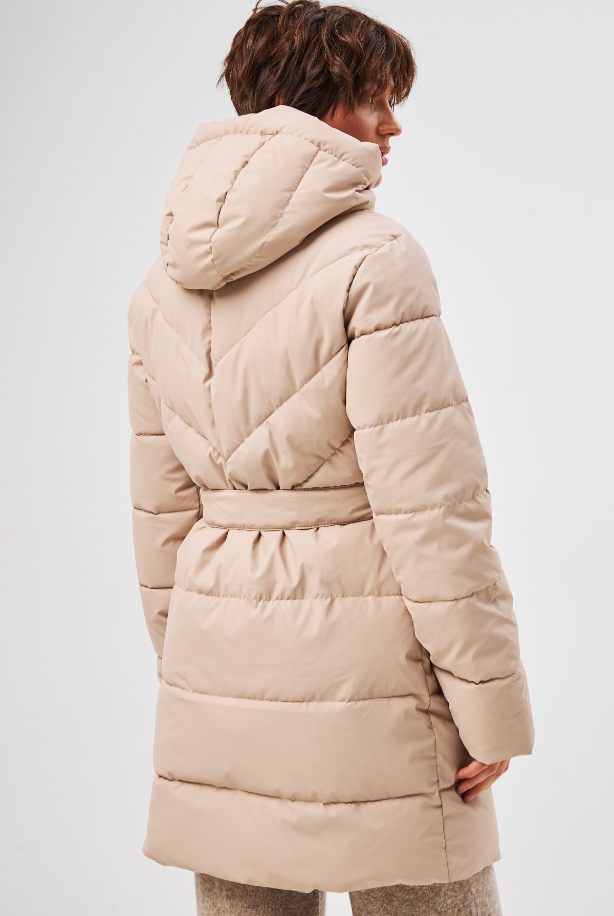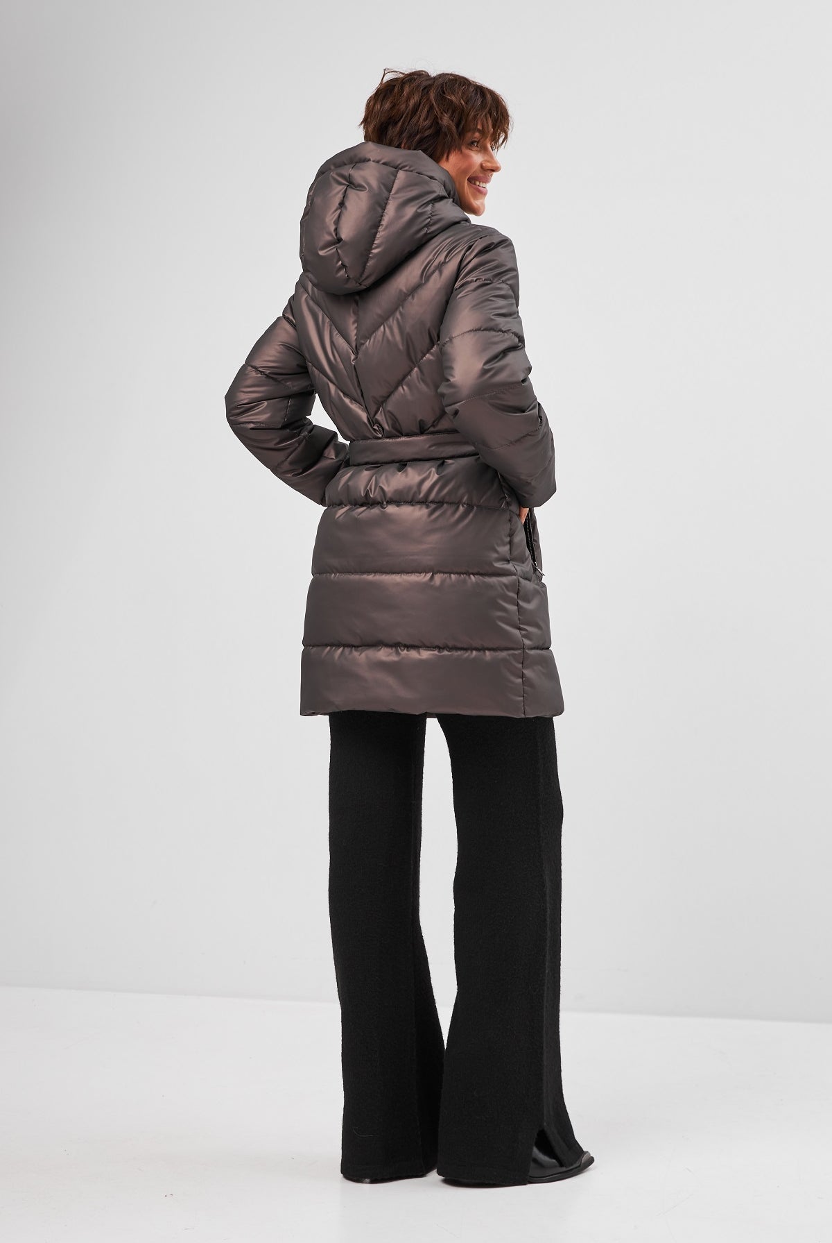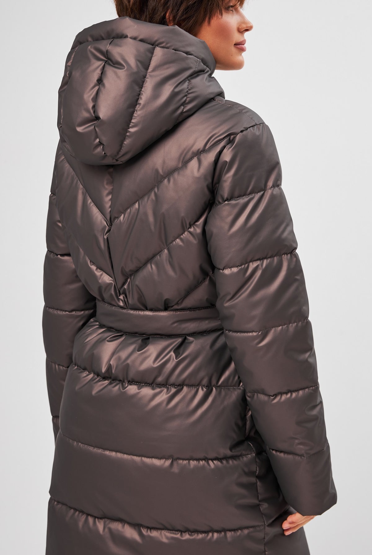Жіноче довге пальто-пуховик із капюшоном та поясом