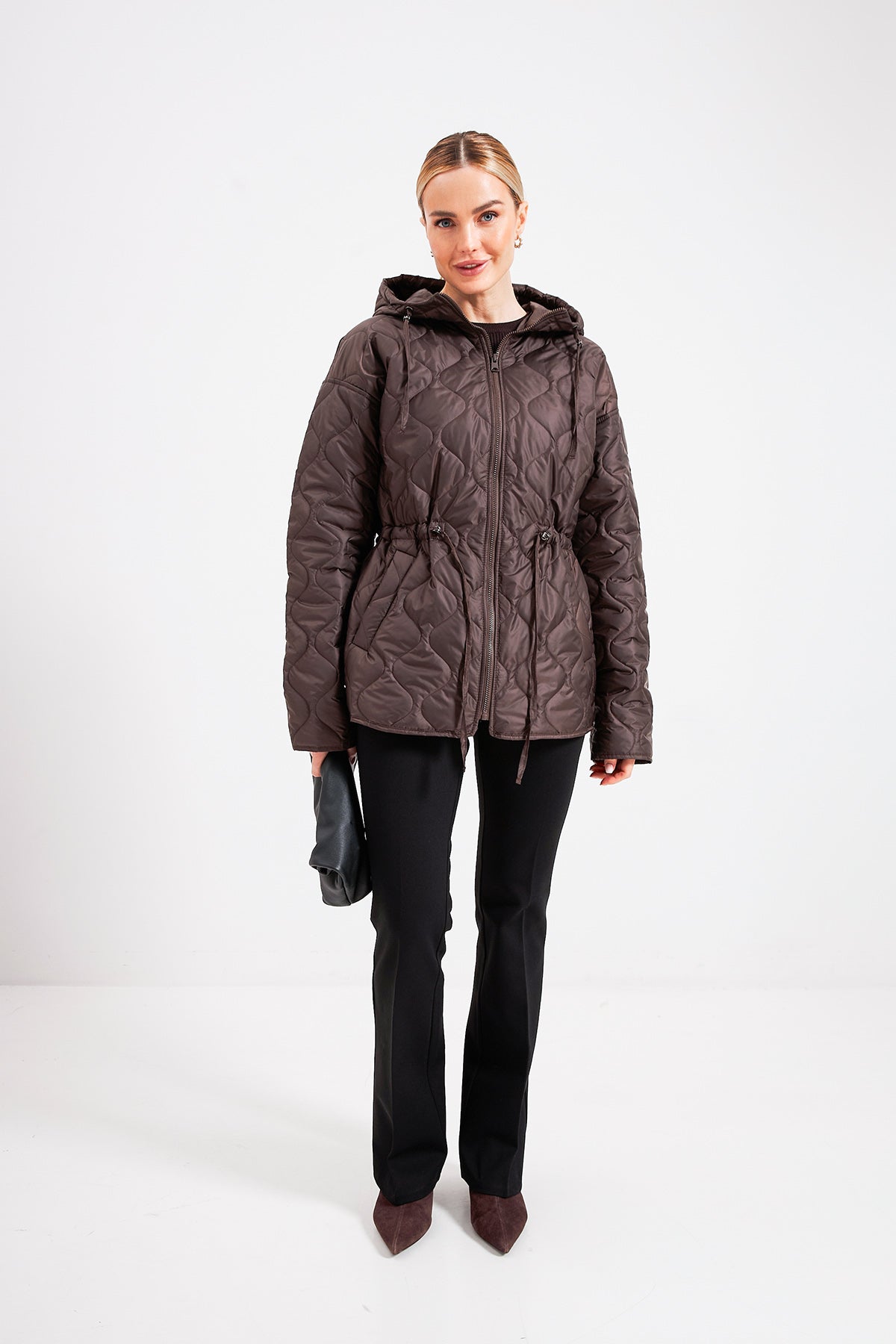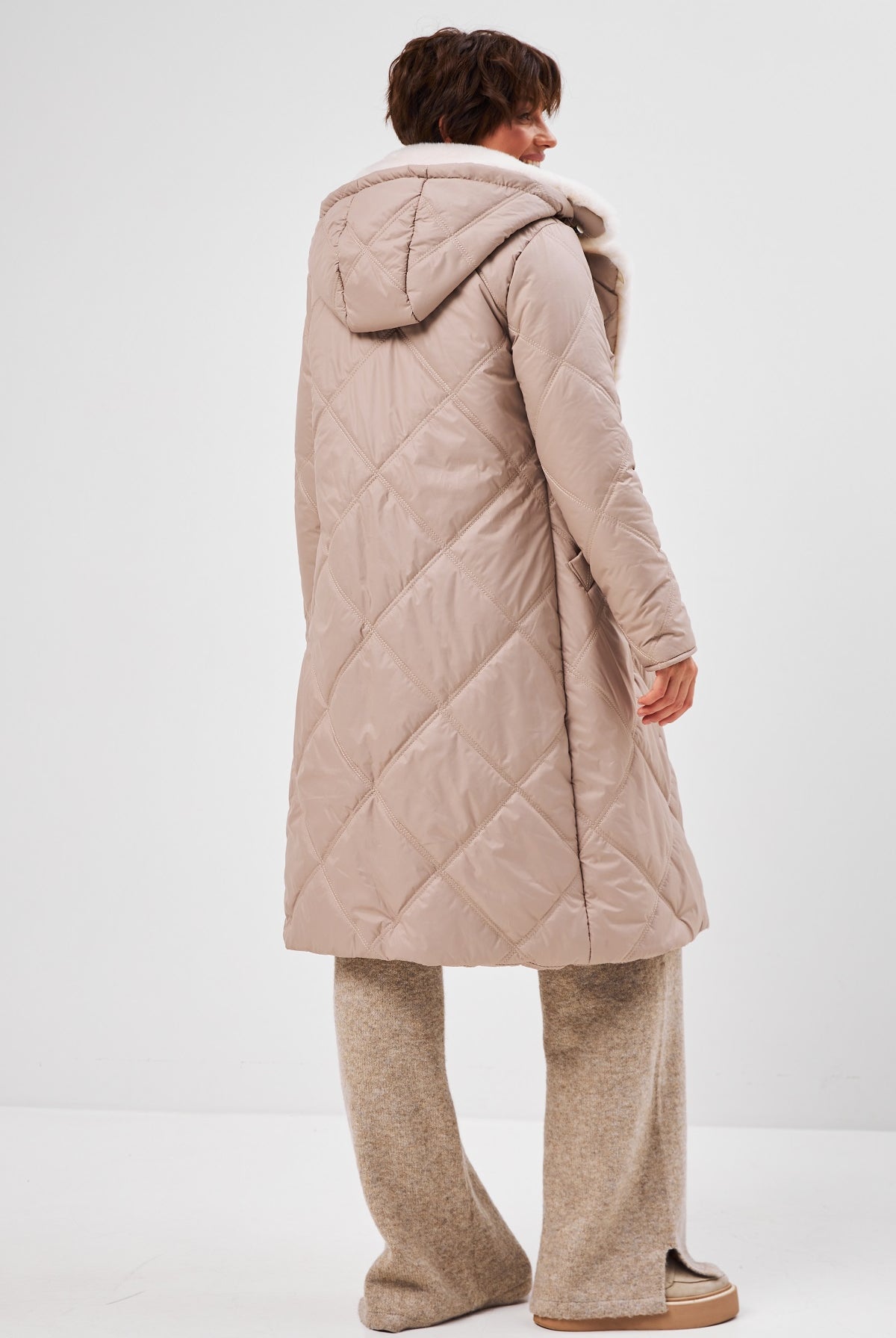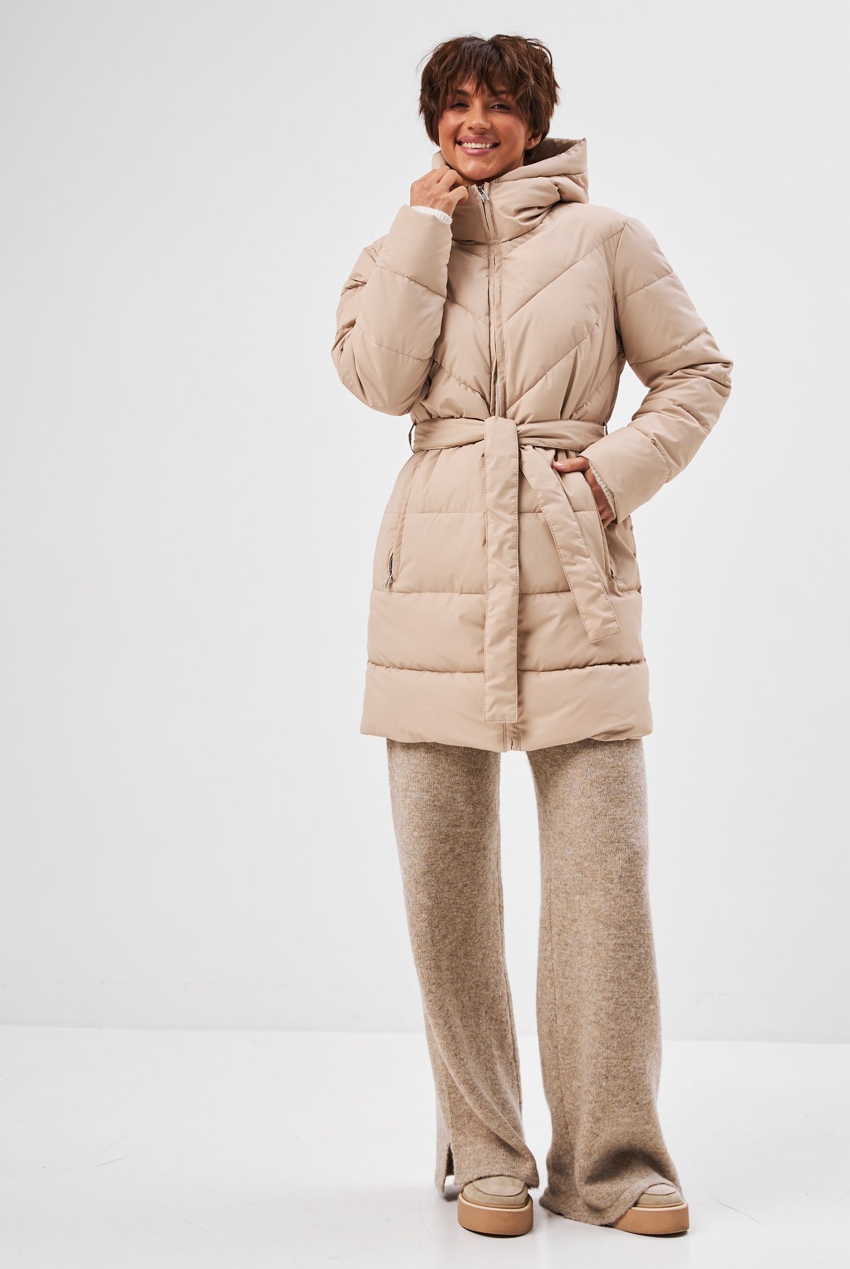 Жіноче довге пальто-пуховик із капюшоном та поясом