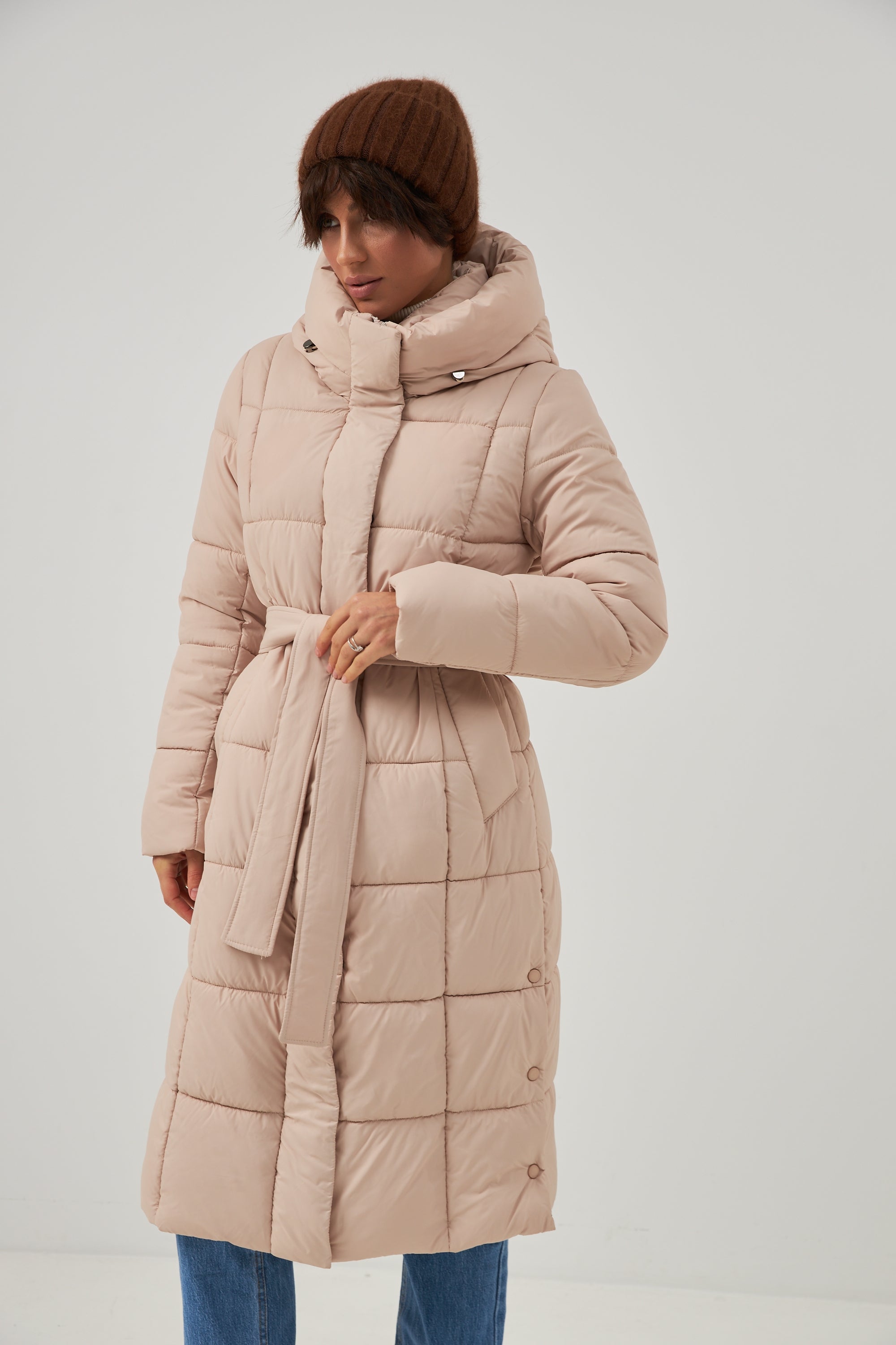 Жіноче довге пальто-пуховик із капюшоном та поясом