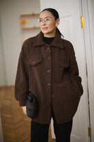 Стильна та тепла сорочка вільного крою оверсайз. Виконана з м'якого хутра Тедді насиченого кольору. Модель має відкладний комір, центральну застібку на ґудзиках та накладні кишені на грудях. Ідеальна як верхній одяг у демісезон або як багатошаровий елемент образу взимку.