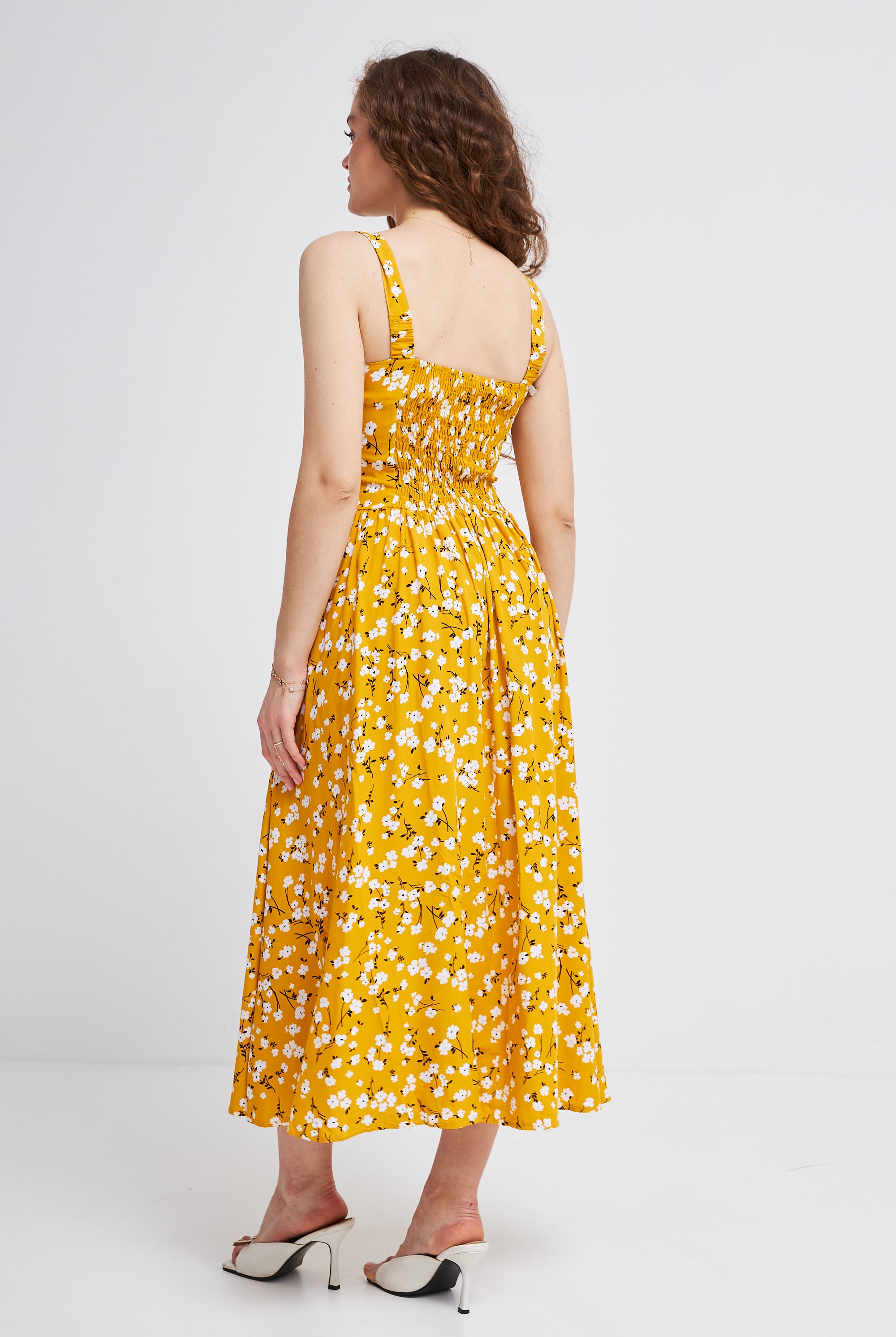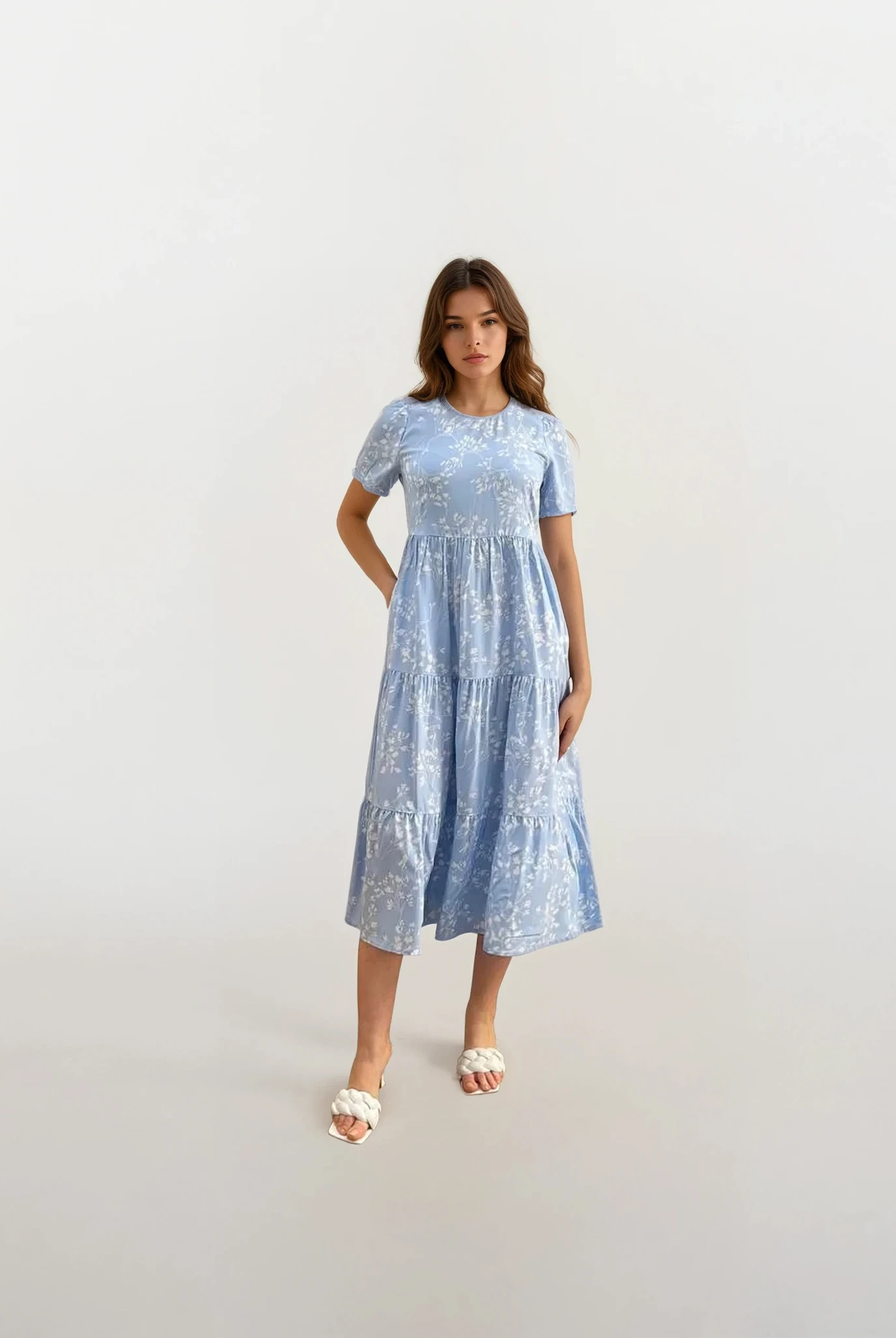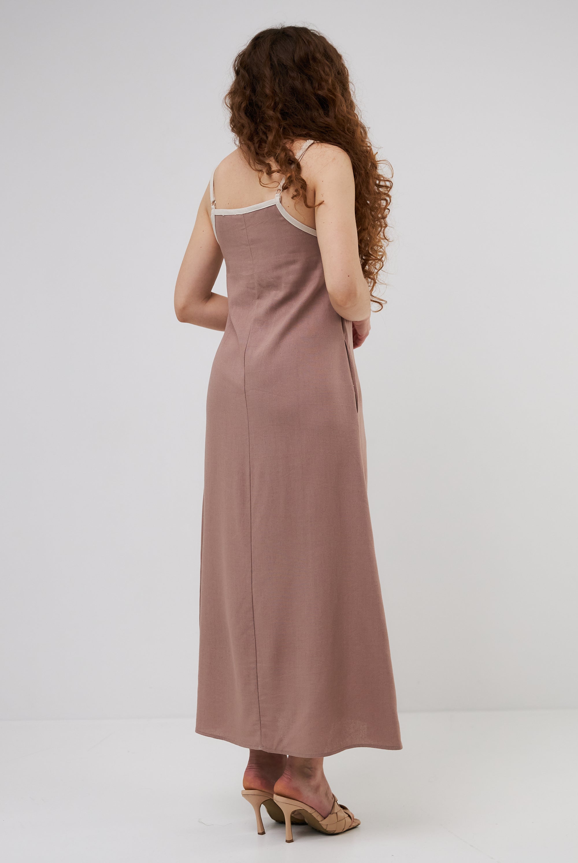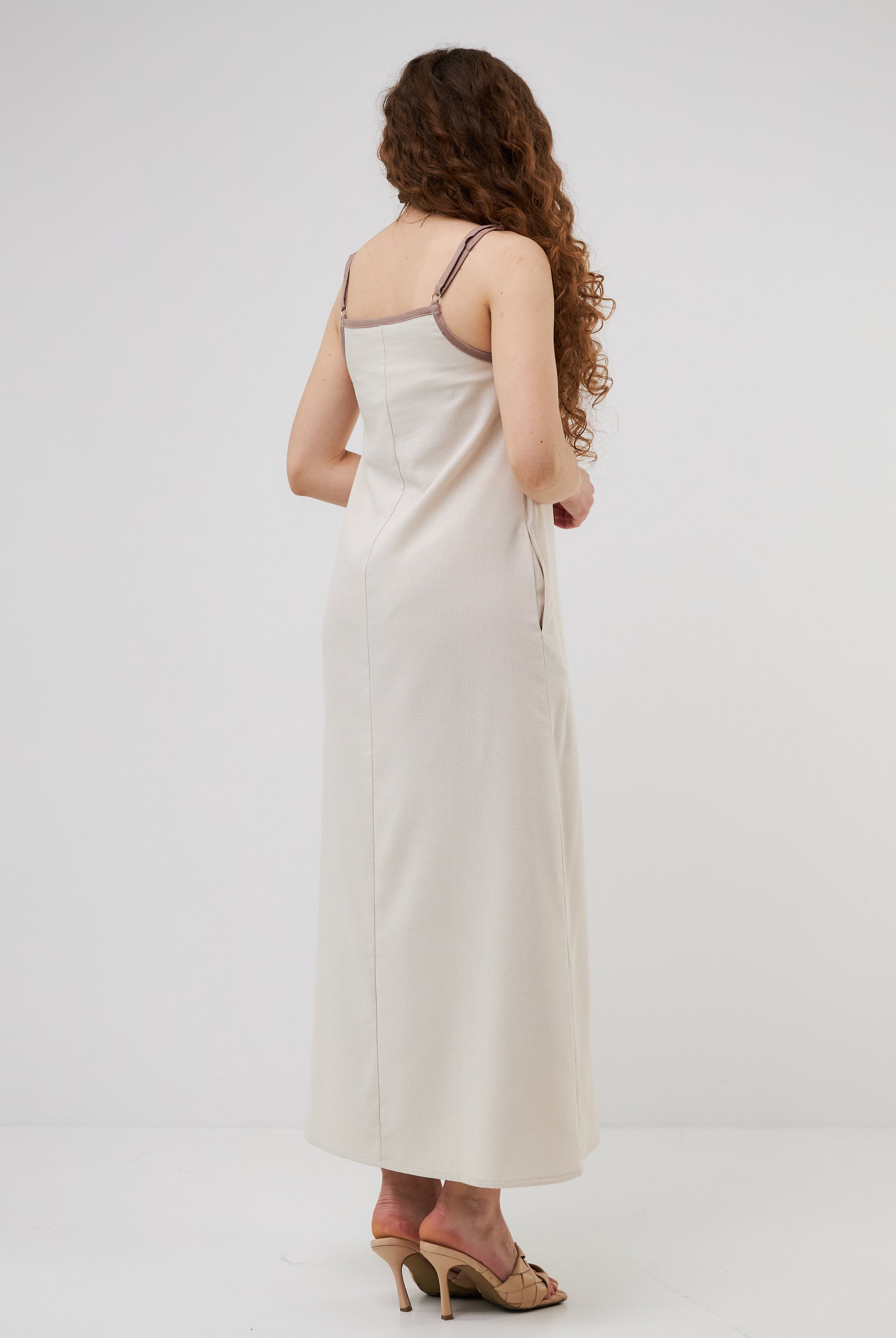 Модель має приталений ліф та розкльошену до низу спідницю, що надає образу легкості та жіночності. Круглий виріз горловини та відсутність рукавів роблять сукню ідеальною для теплої пори року, підкреслюючи витонченість плечей.