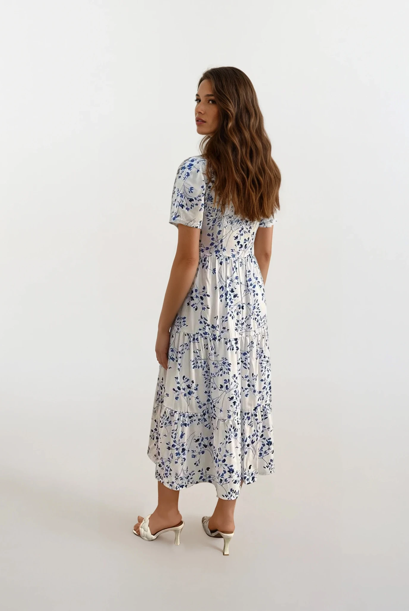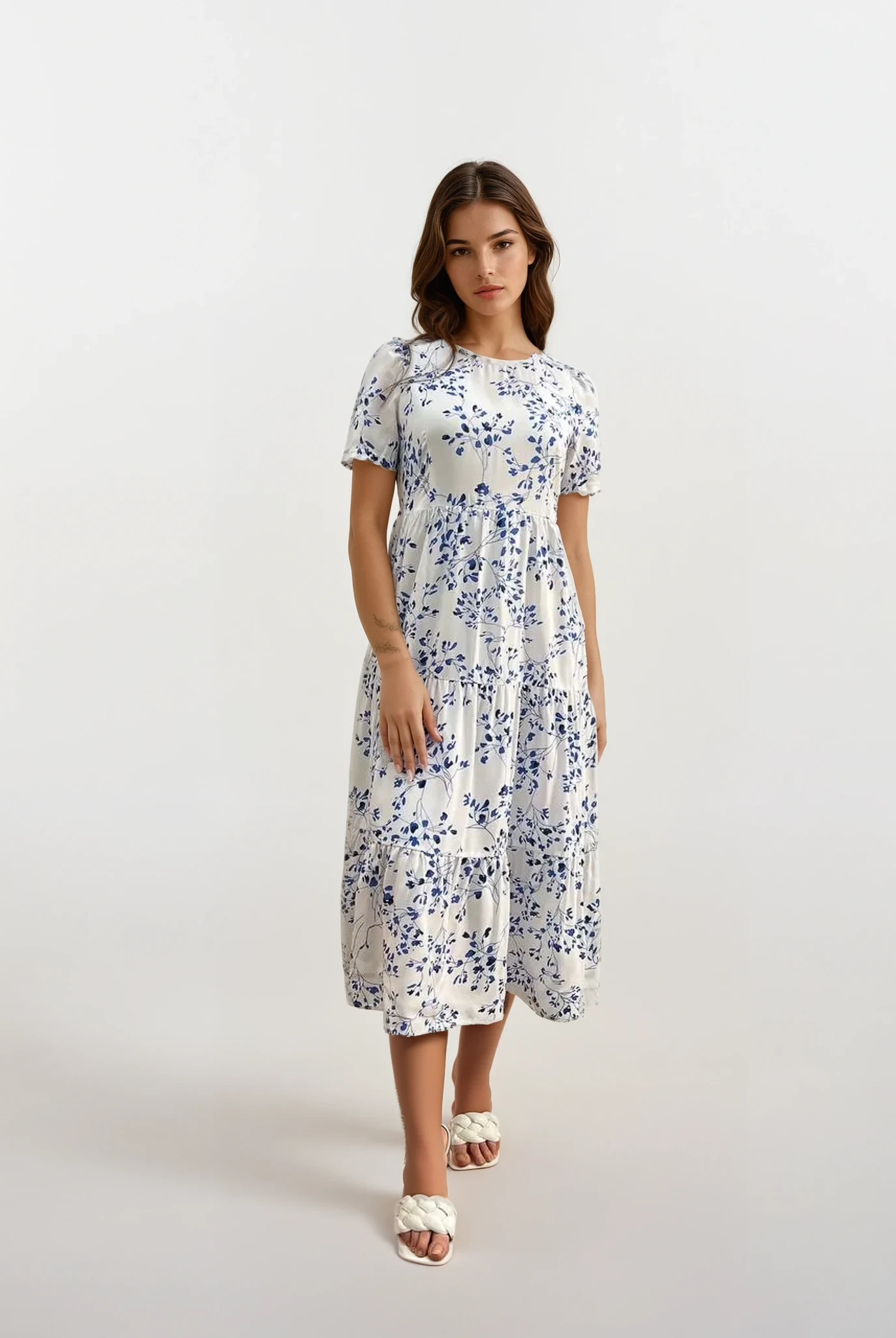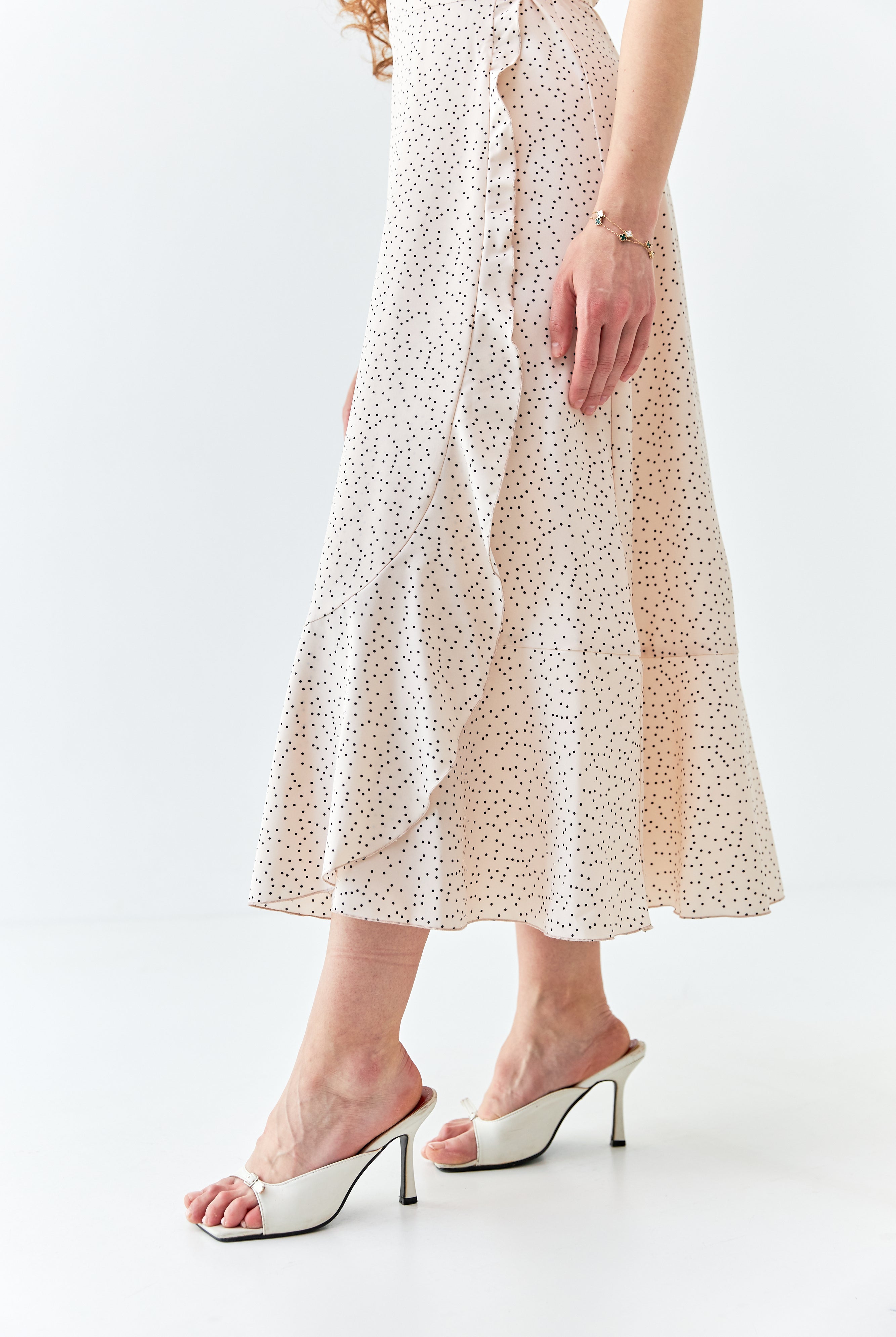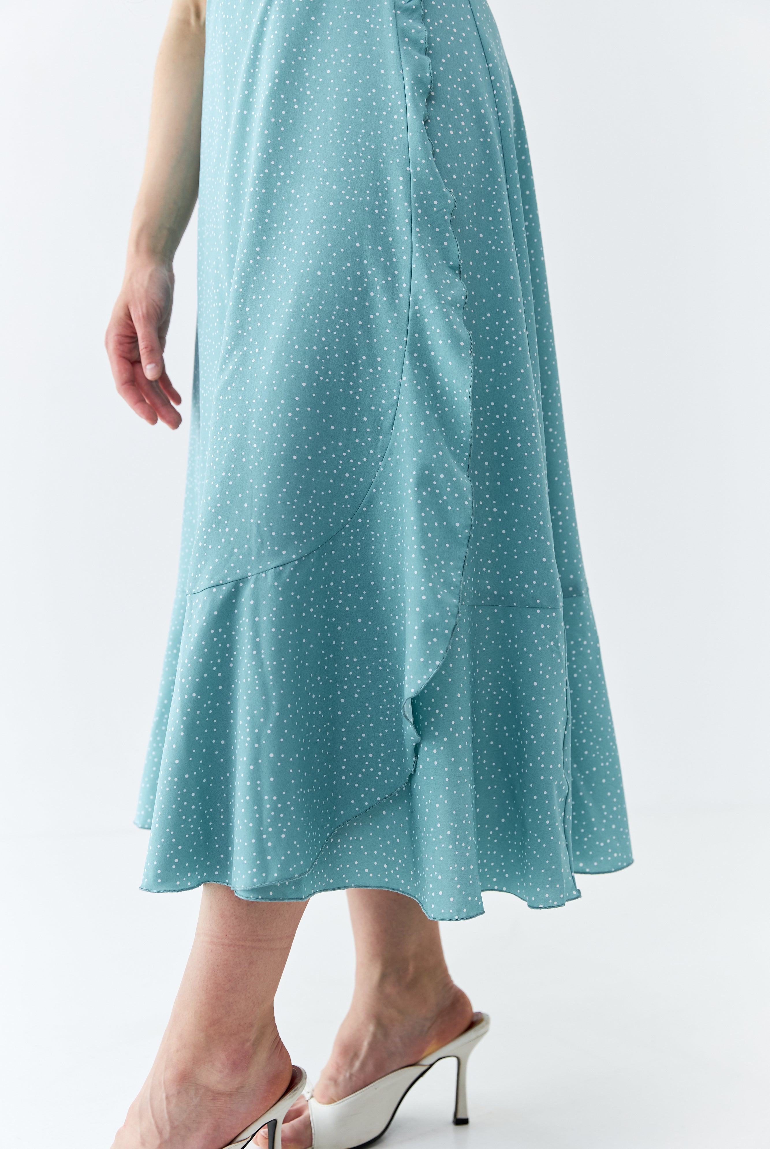Модель має приталений ліф та розкльошену до низу спідницю, що надає образу легкості та жіночності. Круглий виріз горловини та відсутність рукавів роблять сукню ідеальною для теплої пори року, підкреслюючи витонченість плечей.