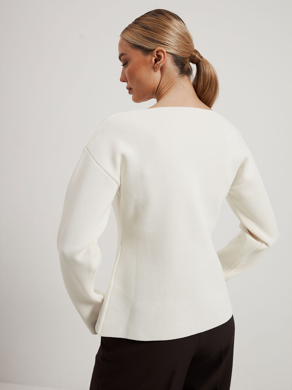 V-подібна горловина витончено подовжує шию, відкриває ключиці та додає легкості.