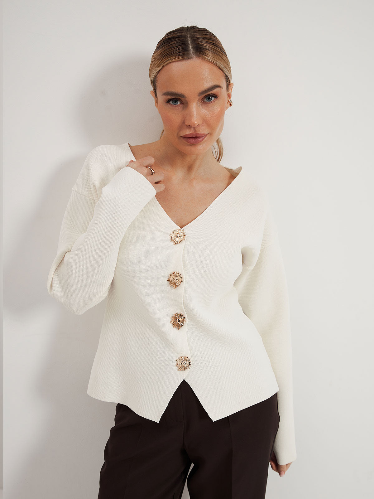 Кардиган із масивними ґудзиками — це втілення стриманої елегантності та комфорту, який відчувається з першого дотику. Модель підкреслює образ, а лаконічний крій чудово доповнює гардероб.
