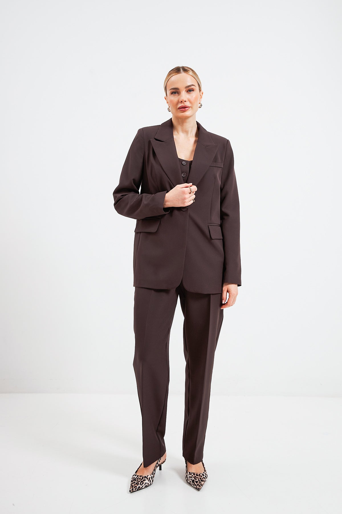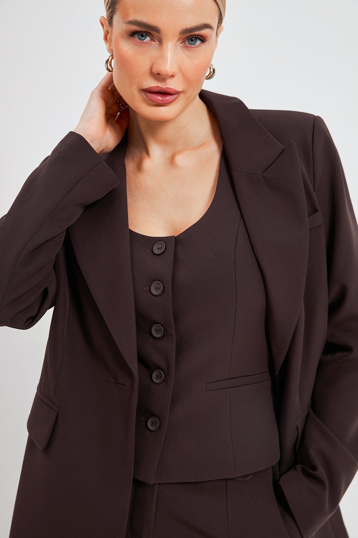 Костюмний жакет є втіленням елегантності та стилю, пропонуючи універсальну основу для створення як ділових, так і повсякденних образів. Він ідеально пасує до комплекту зі штанами або жилетом такого ж кольору, створюючи цілісний та продуманий лук.