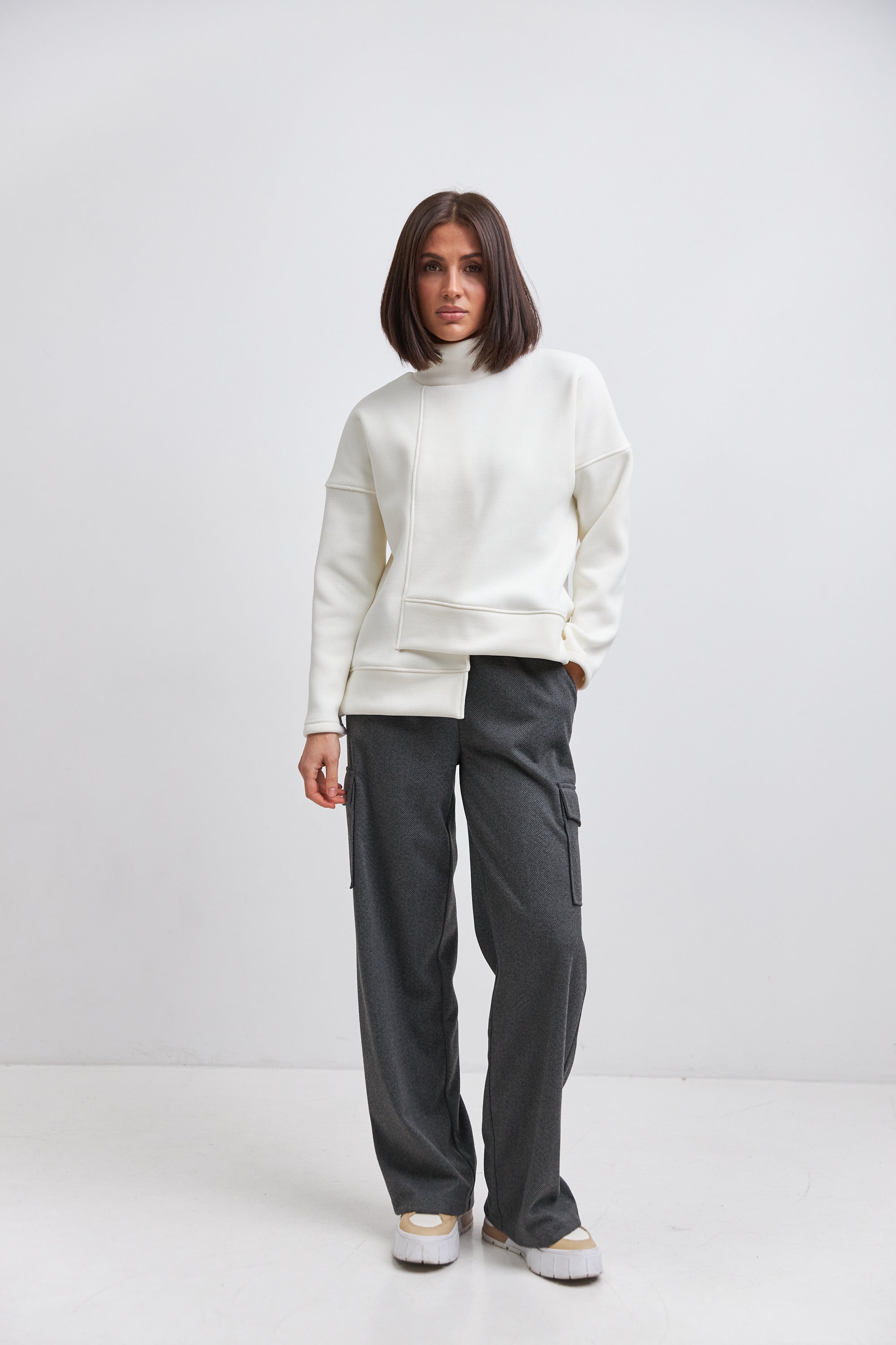 Світшот доповнений високим горлом, що не лише захищає від вітру, а й додає елегантності.