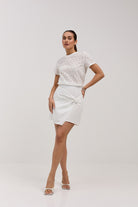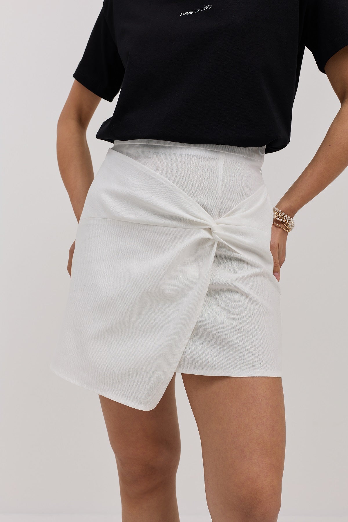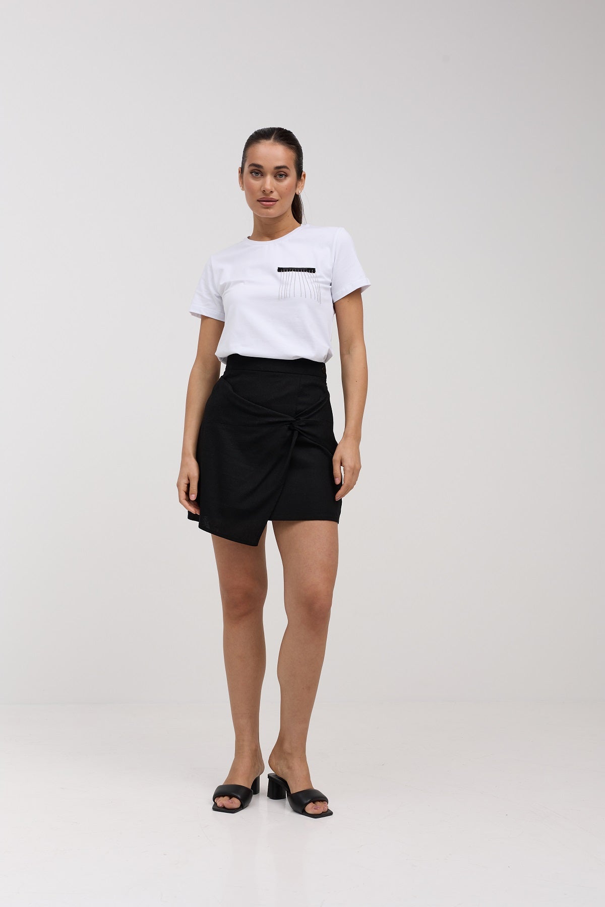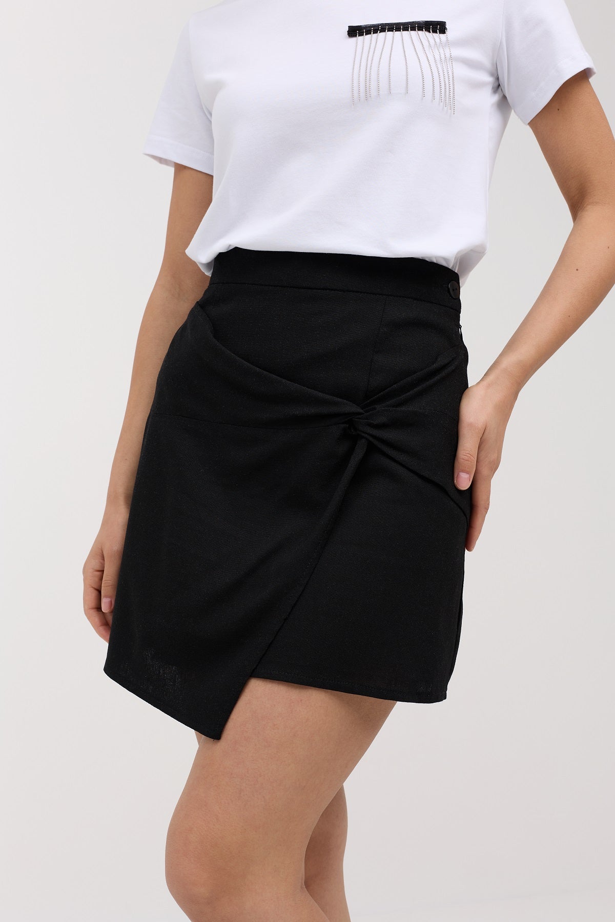 Ця стильна мініспідниця з ефектом перекруту — ідеальний вибір для сучасного гардероба. Модель виконана в класичних кольорах, які легко поєднується з будь-яким верхом. Асиметричний крій з перекрутом додає образу оригінальності та підкреслює талію. Щільна, але комфортна тканина забезпечує гарну посадку та свободу рухів. Ідеально підходить як для повсякденного стилю, так і для вечірніх виходів.