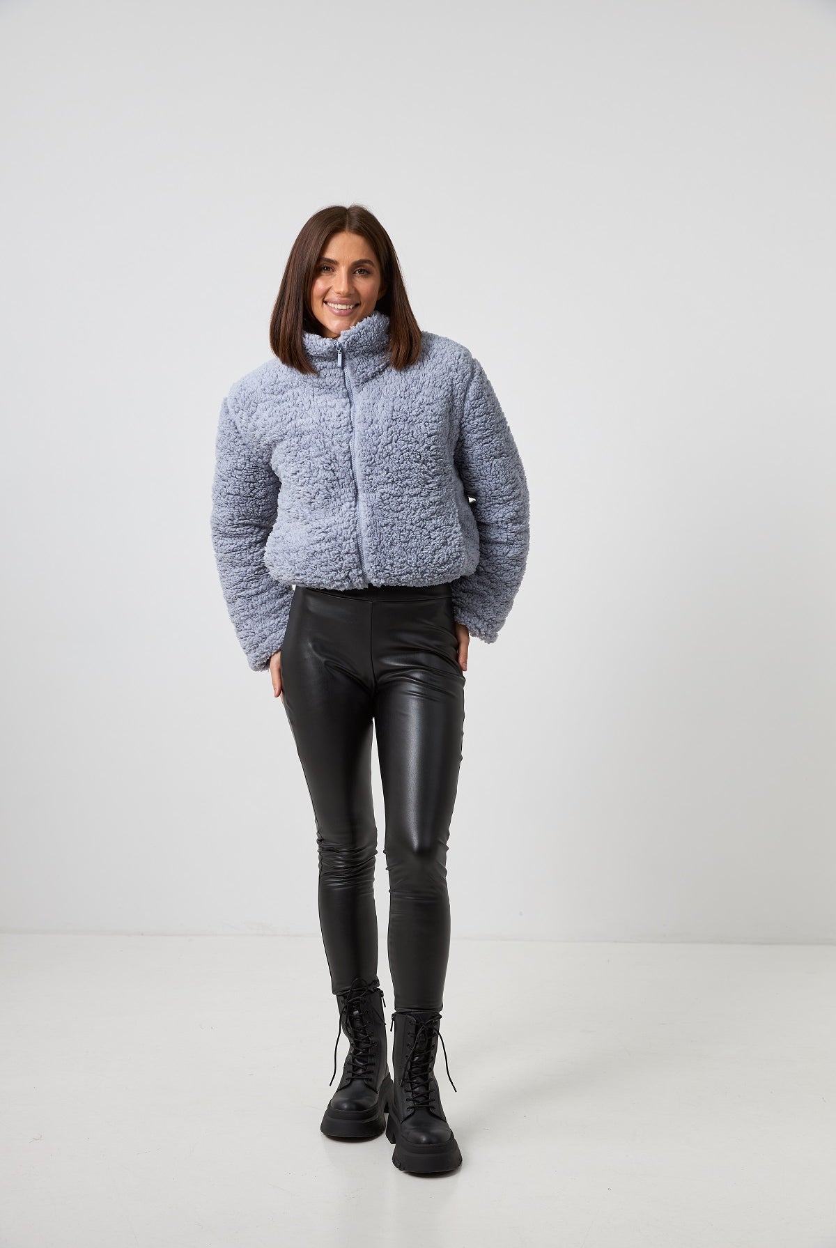 Укорочений жакет вільного крою з коміром-стійкою, що застібається на акцентну металеву блискавку.