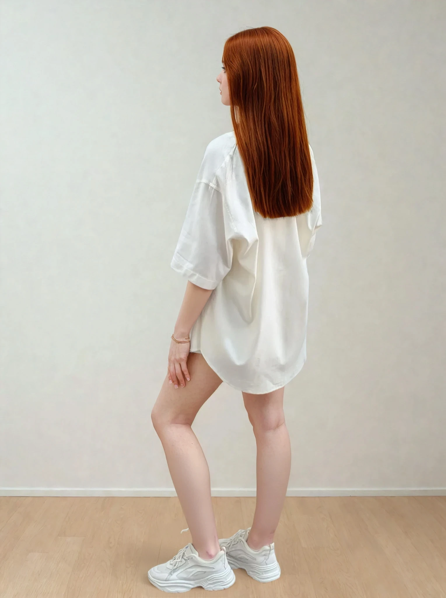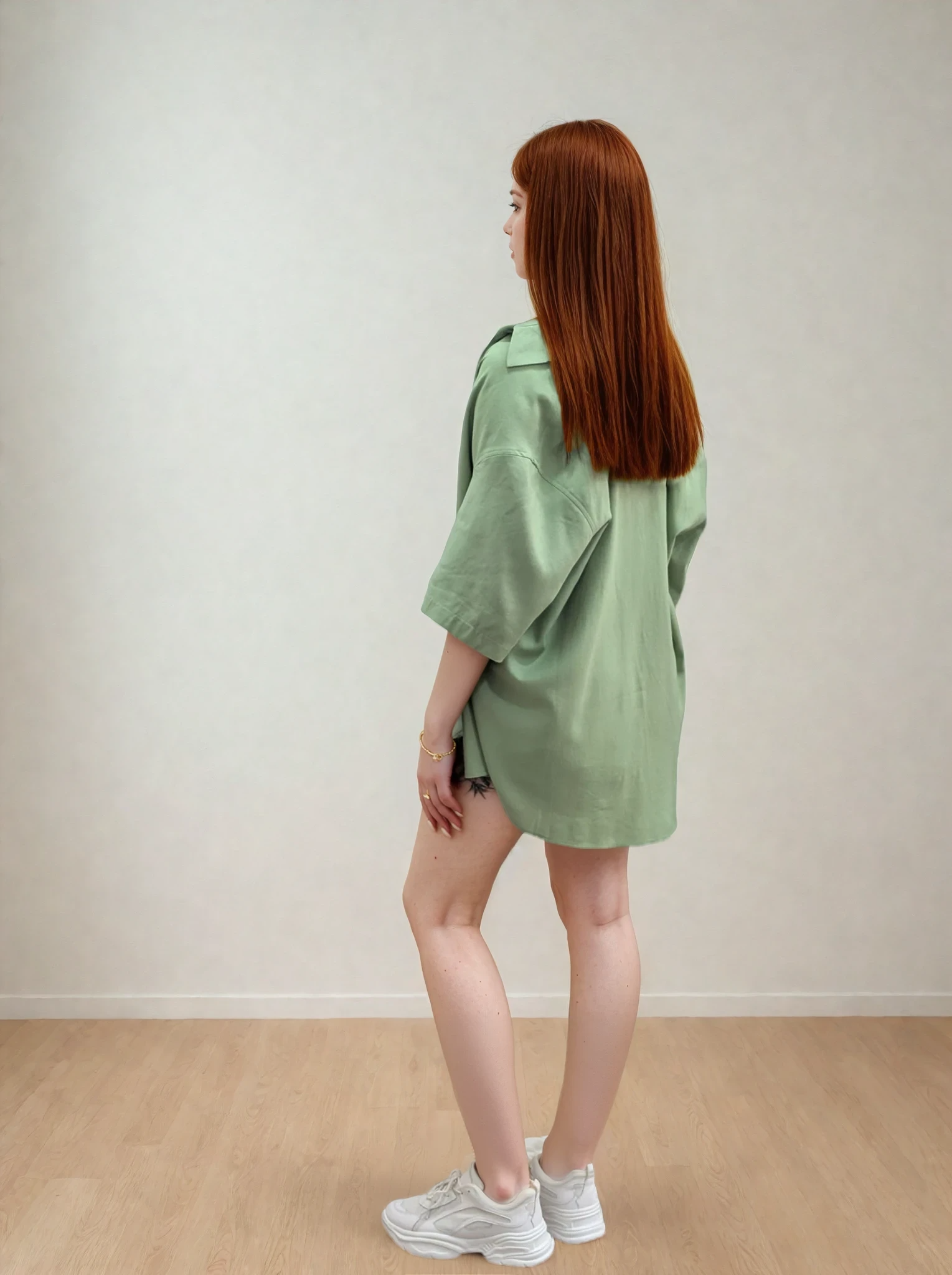 Прямий або злегка oversize крій забезпечує свободу рухів і пасує різним типам фігури. Подовжена довжина дозволяє носити сорочку як самостійну річ — наприклад, у форматі туніки, або як легку накидку поверх топів, суконь чи купальника.