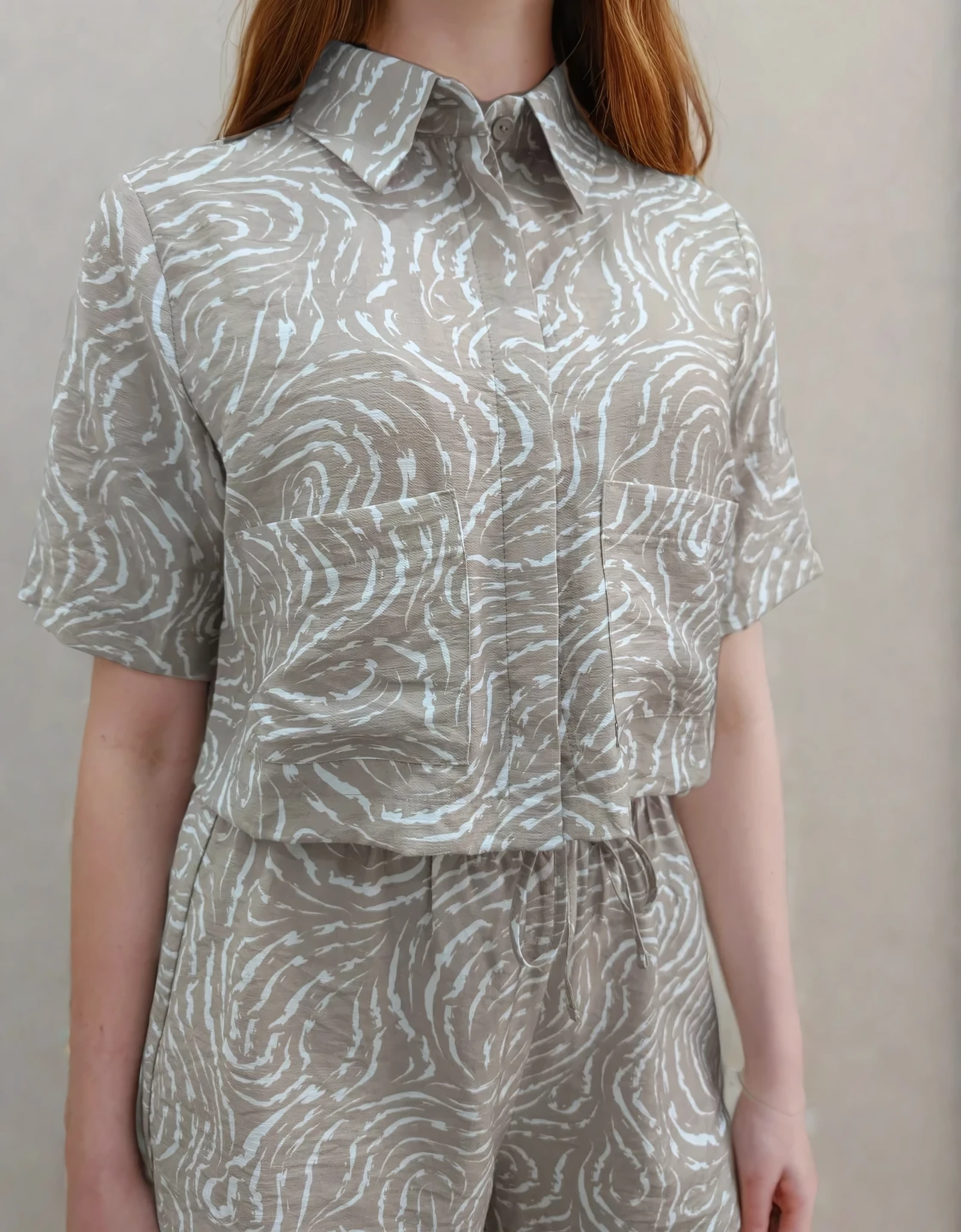 Коротка довжина додає образу сучасності та легкості, підкреслює лінію талії й чудово поєднується з високою посадкою штанів, шортів або спідниць. Вільний крій не сковує рухів, а класичний комір і планка на ґудзиках надають виробу структурності. Така сорочка однаково добре виглядає як у складі повсякденного, так і більш акцентного образу.