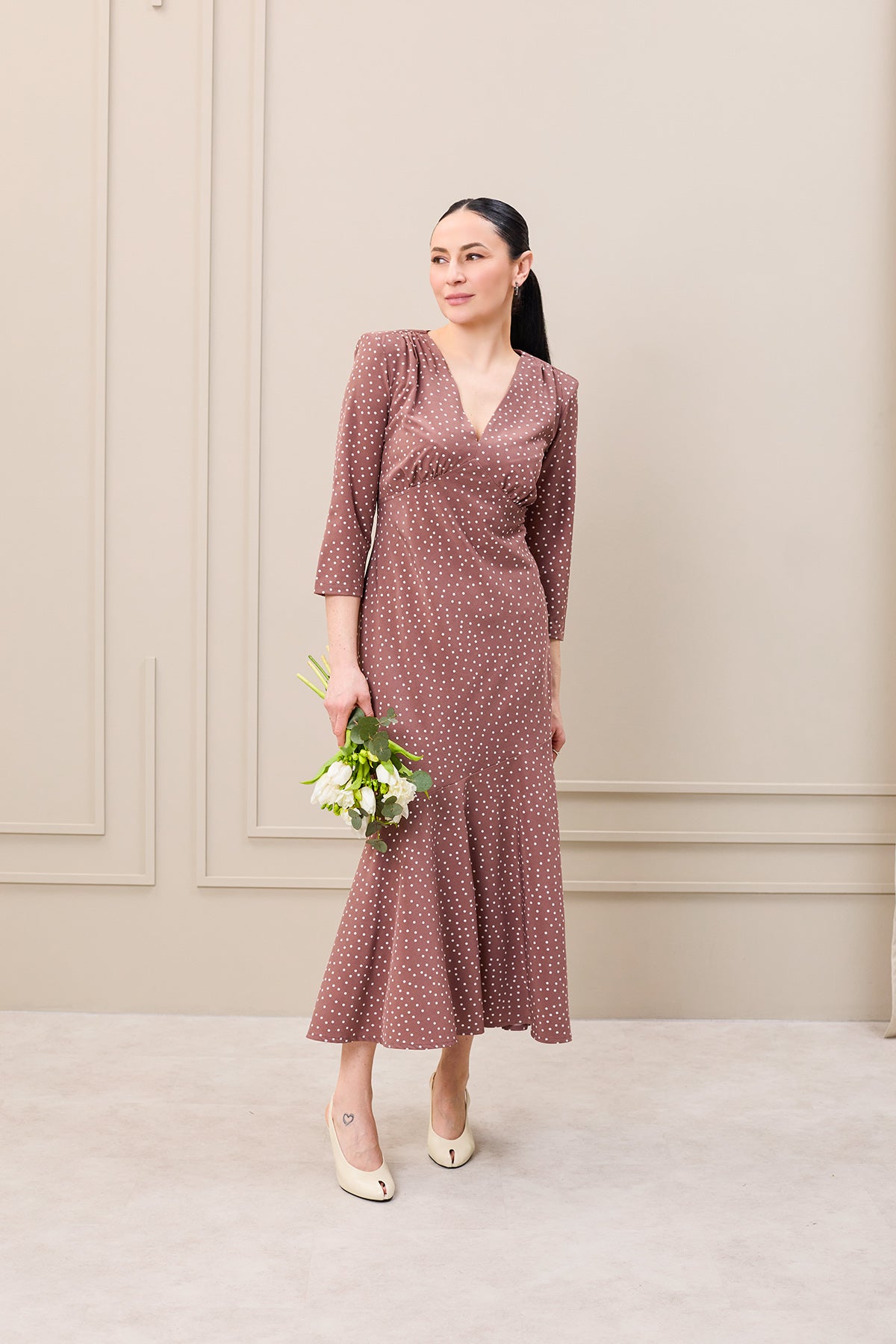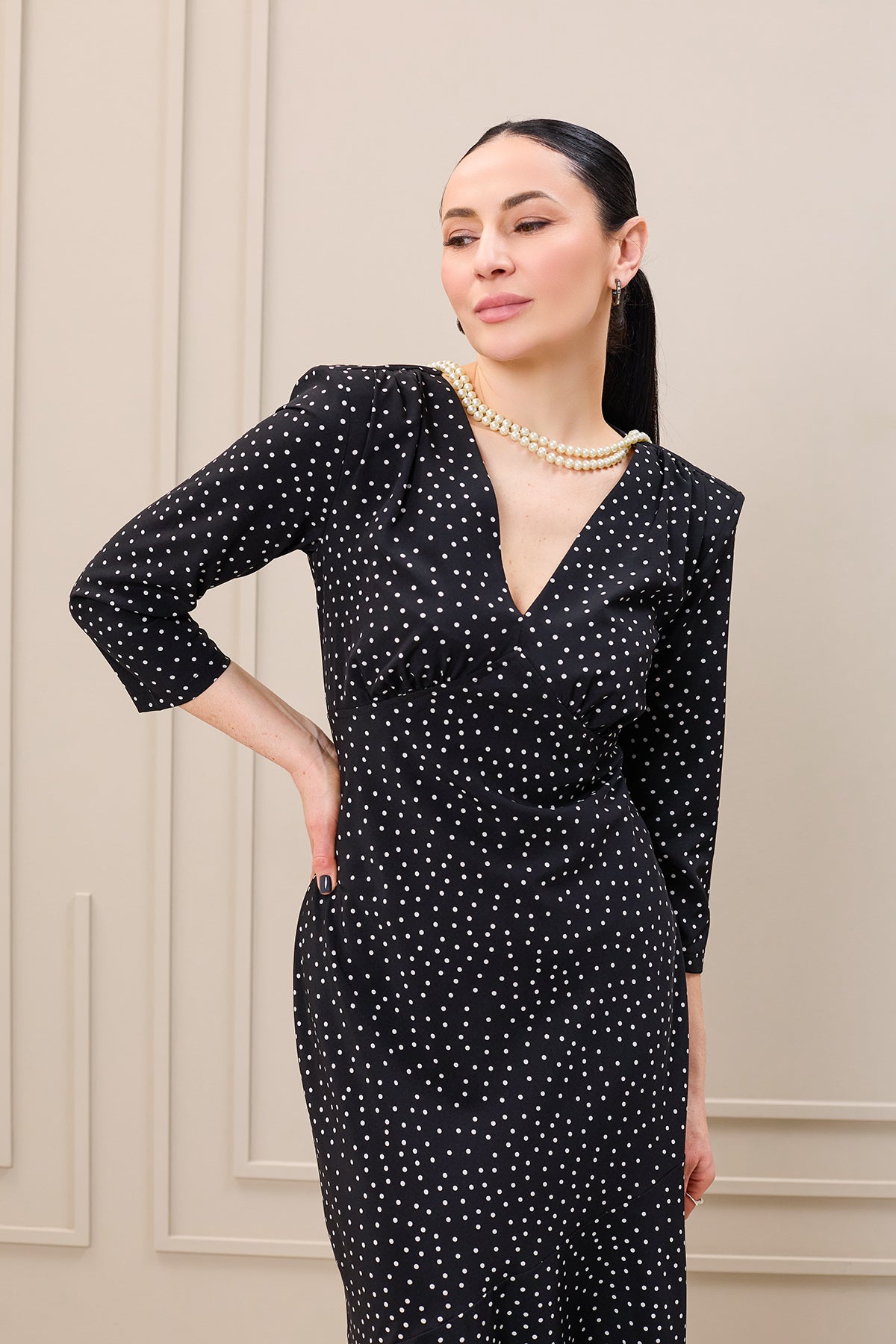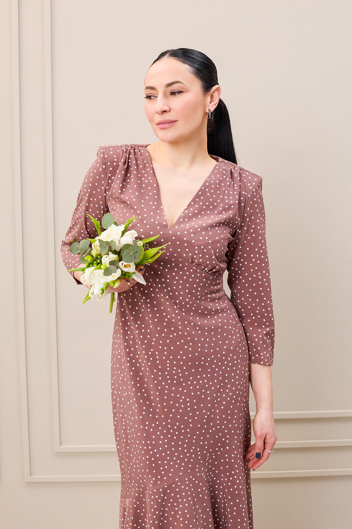 Сукня мідаксі напівприлеглого силуету, виготовлена з легкого та приємного на дотик матеріалу, стане перлиною вашого гардероба. Кожна деталь крою продумана так, щоб підкреслити фігуру, зберігаючи при цьому загадковість та витонченість.
