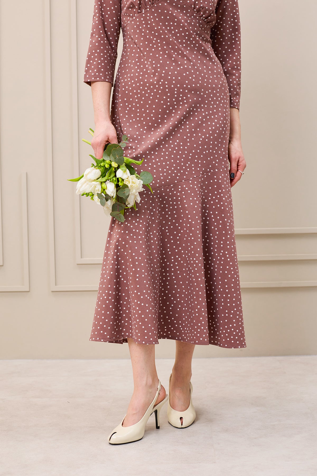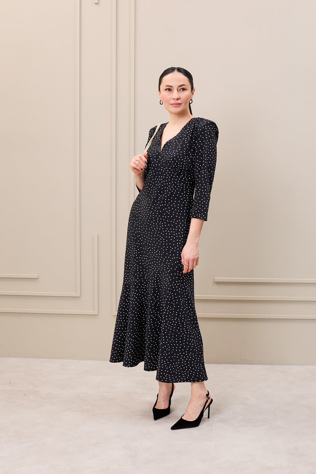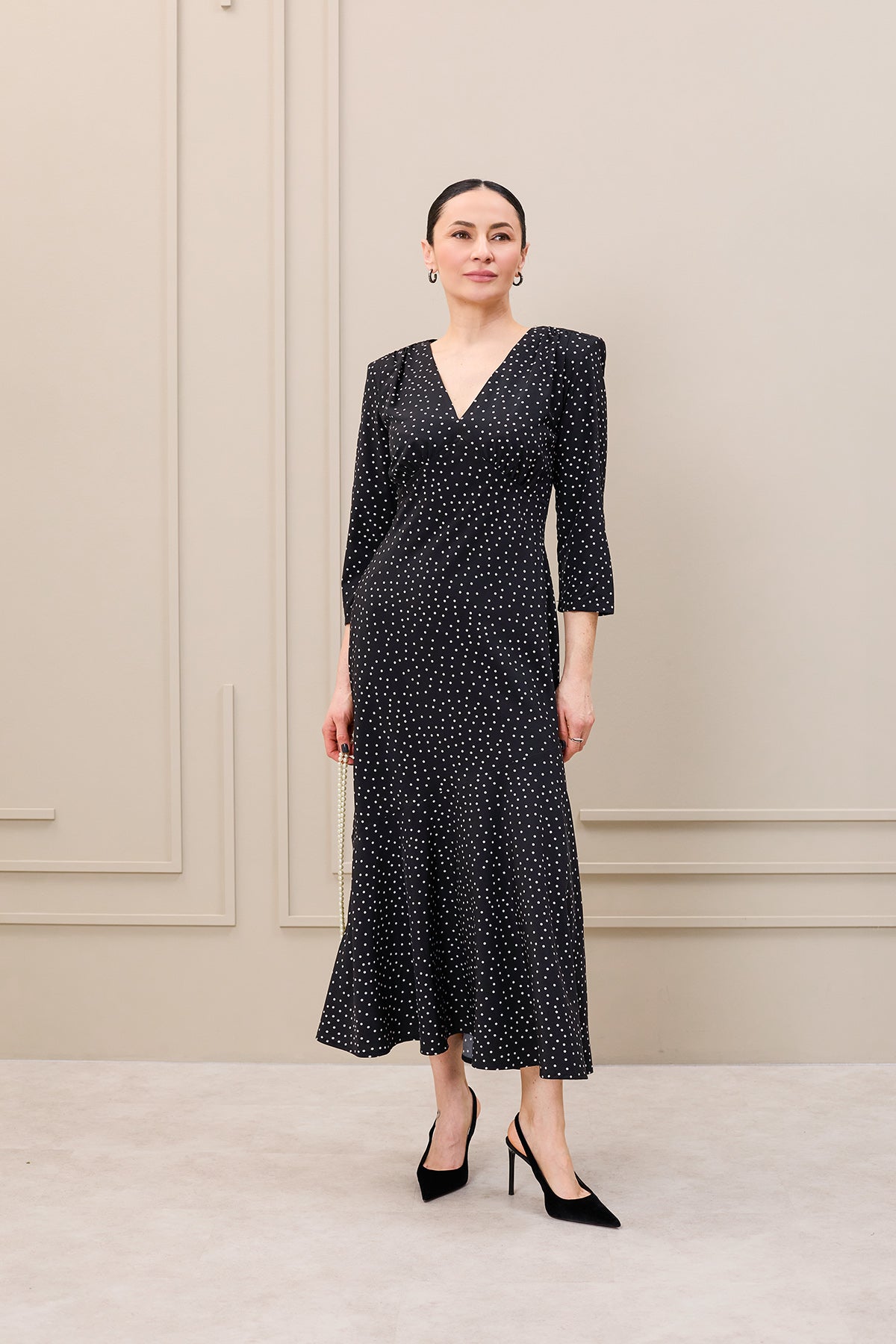 Сукня мідаксі напівприлеглого силуету, виготовлена з легкого та приємного на дотик матеріалу, стане перлиною вашого гардероба. Кожна деталь крою продумана так, щоб підкреслити фігуру, зберігаючи при цьому загадковість та витонченість.