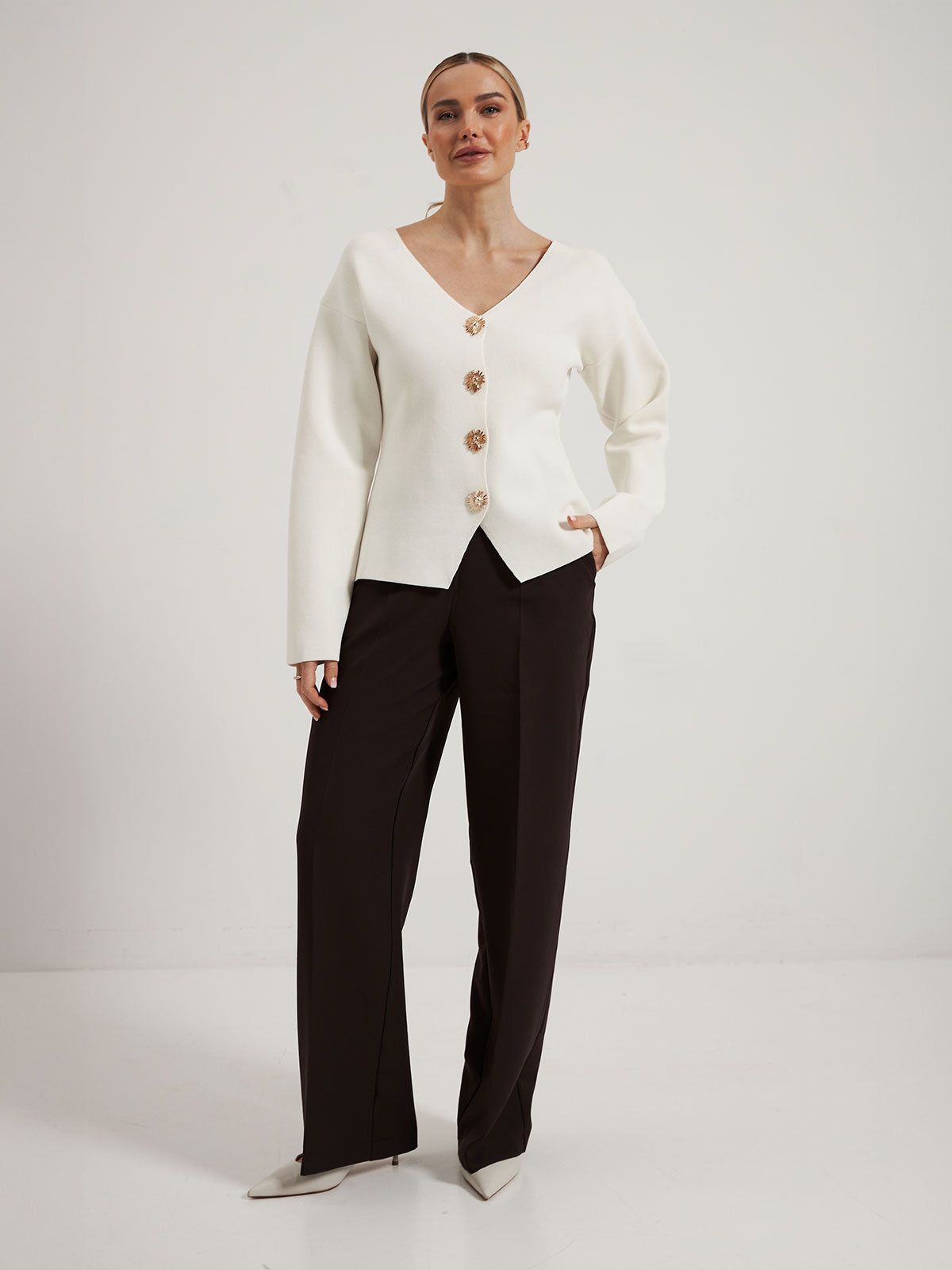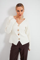 Кардиган із масивними ґудзиками — це втілення стриманої елегантності та комфорту, який відчувається з першого дотику. Модель підкреслює образ, а лаконічний крій чудово доповнює гардероб. Кардиган легко поєднуватися з джинсами або брюками палаццо, створюючи гармонійні монохромні образи.