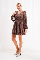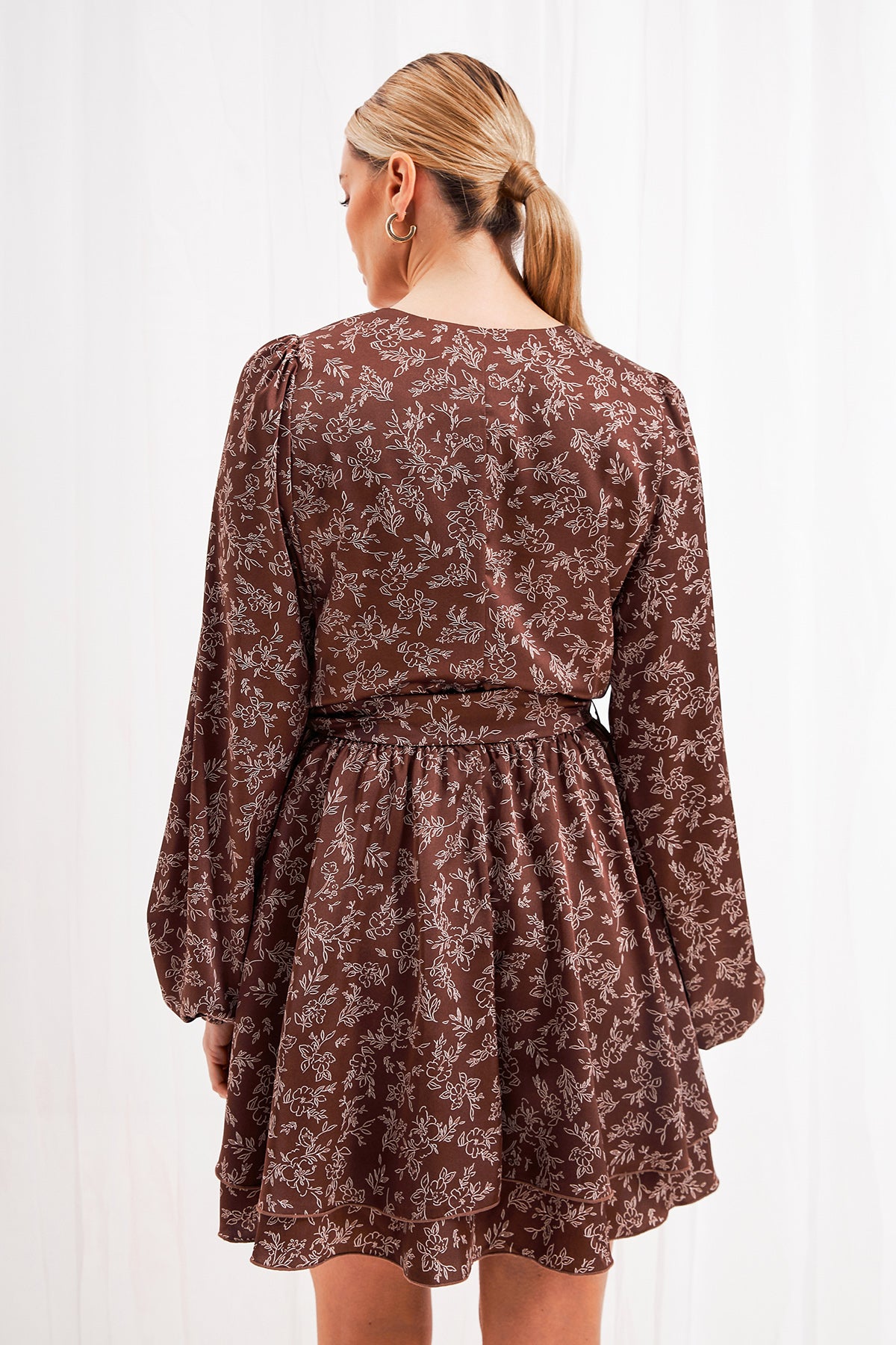 Міні-сукня напівприлеглого силуету поєднує глибокий, насичений шоколадний відтінок із ніжним квітковим принтом, створюючи вишуканий та романтичний образ.