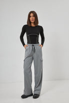 Головна перевага — функціональні накладні кишені, які не тільки додають образу характеру, а й підкреслюють актуальність кежуал-естетики. середня посадка акцентує талію, а пояс на резинці забезпечує зручну фіксацію.