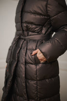 Жіноче довге пальто-пуховик із капюшоном та поясом