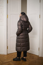 Жіноче довге пальто-пуховик з легким перламутровим блиском. Модель має подовжений фасон та об'ємний капюшон-комір для максимального захисту від холоду. Завдяки поясу в тон, пуховик гарно підкреслює талію, зберігаючи жіночний силует навіть у морози. Горизонтальна прошивка забезпечує рівномірний розподіл утеплювача, а глибокі кишені додають практичності. Ідеальне рішення для стильного та теплого зимового образу.