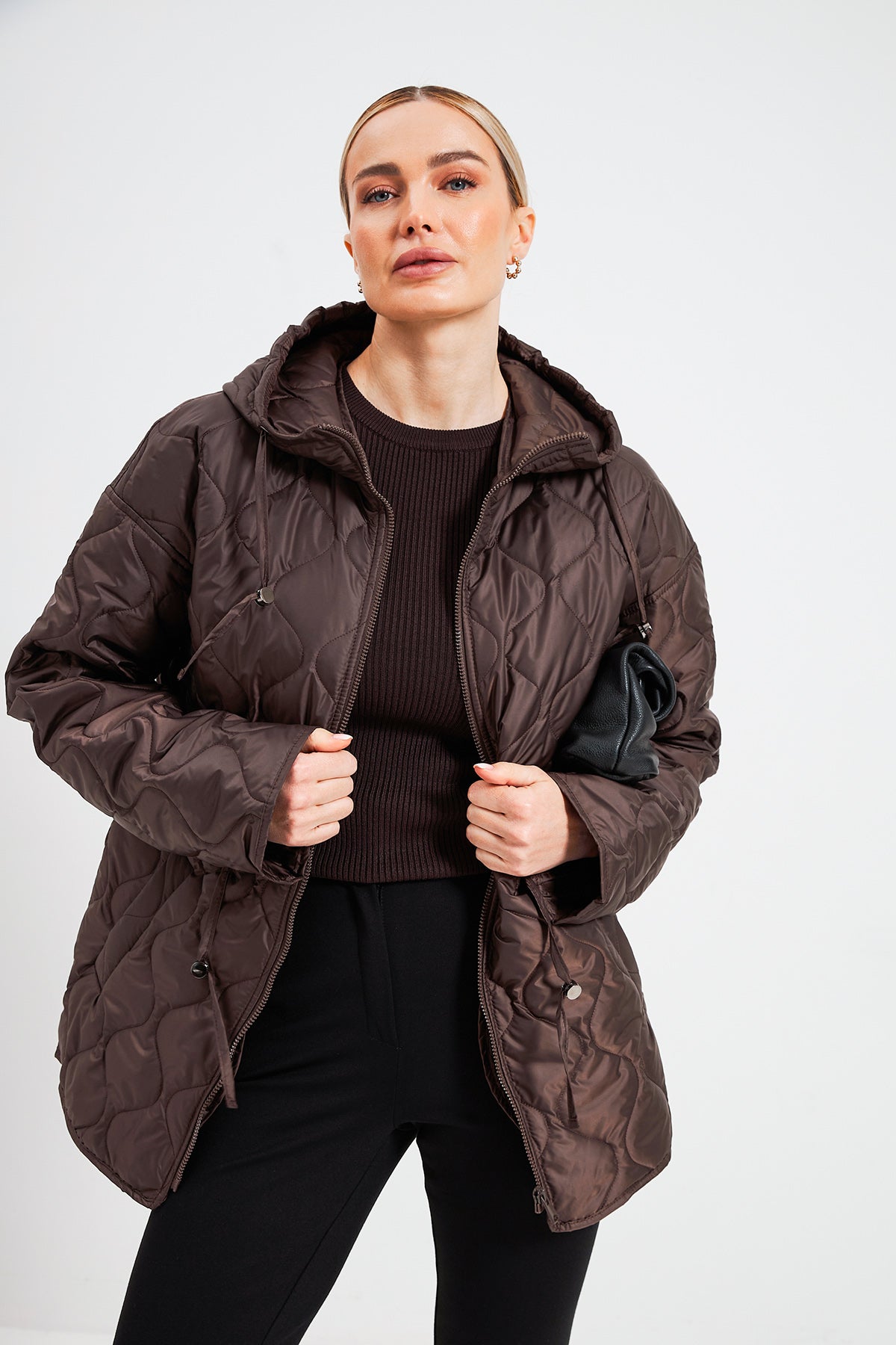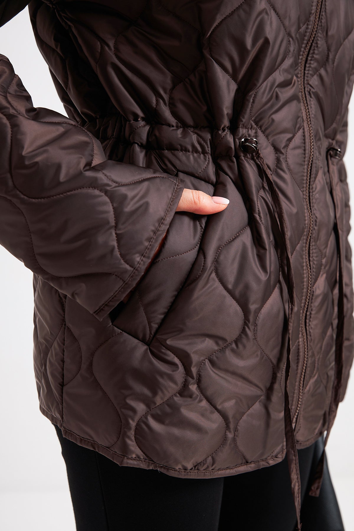 Куртка із куліскою ідеальне рішення для тих, хто шукає баланс між теплом та елегантністю. Головна особливість моделі — зміна силуету: від вільного прямого крою до приталеного жіночного фасону.