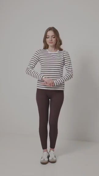 Лонгслів має втачний рукав — лінія плеча знаходиться точно на своєму місці, що візуально робить образ більш охайним.