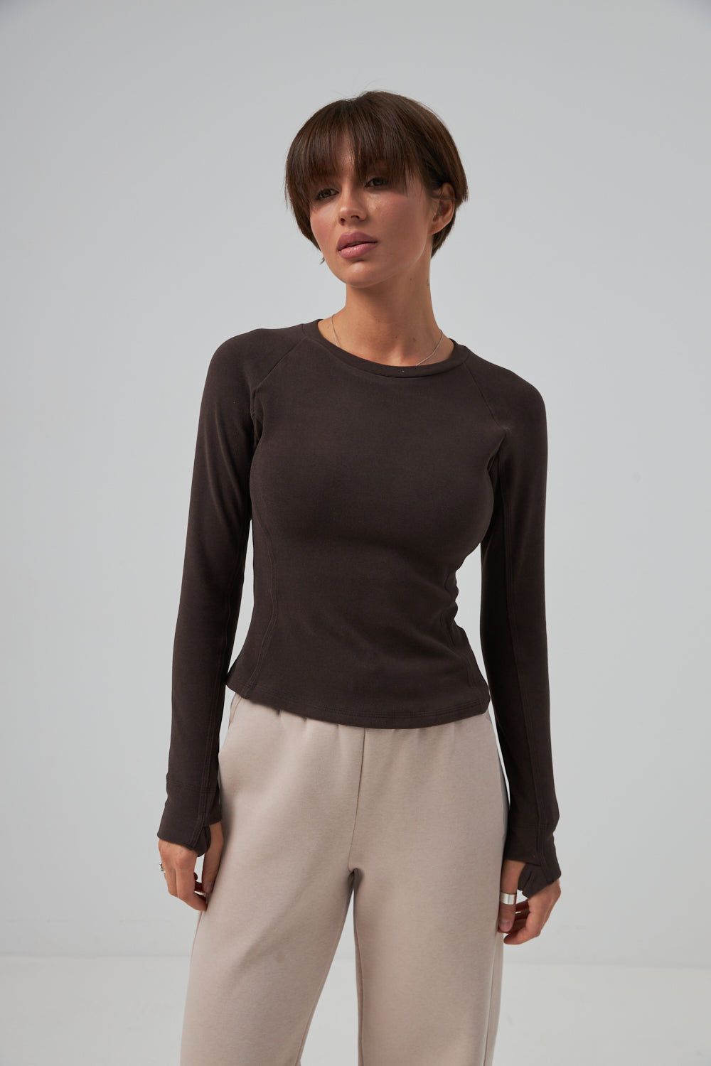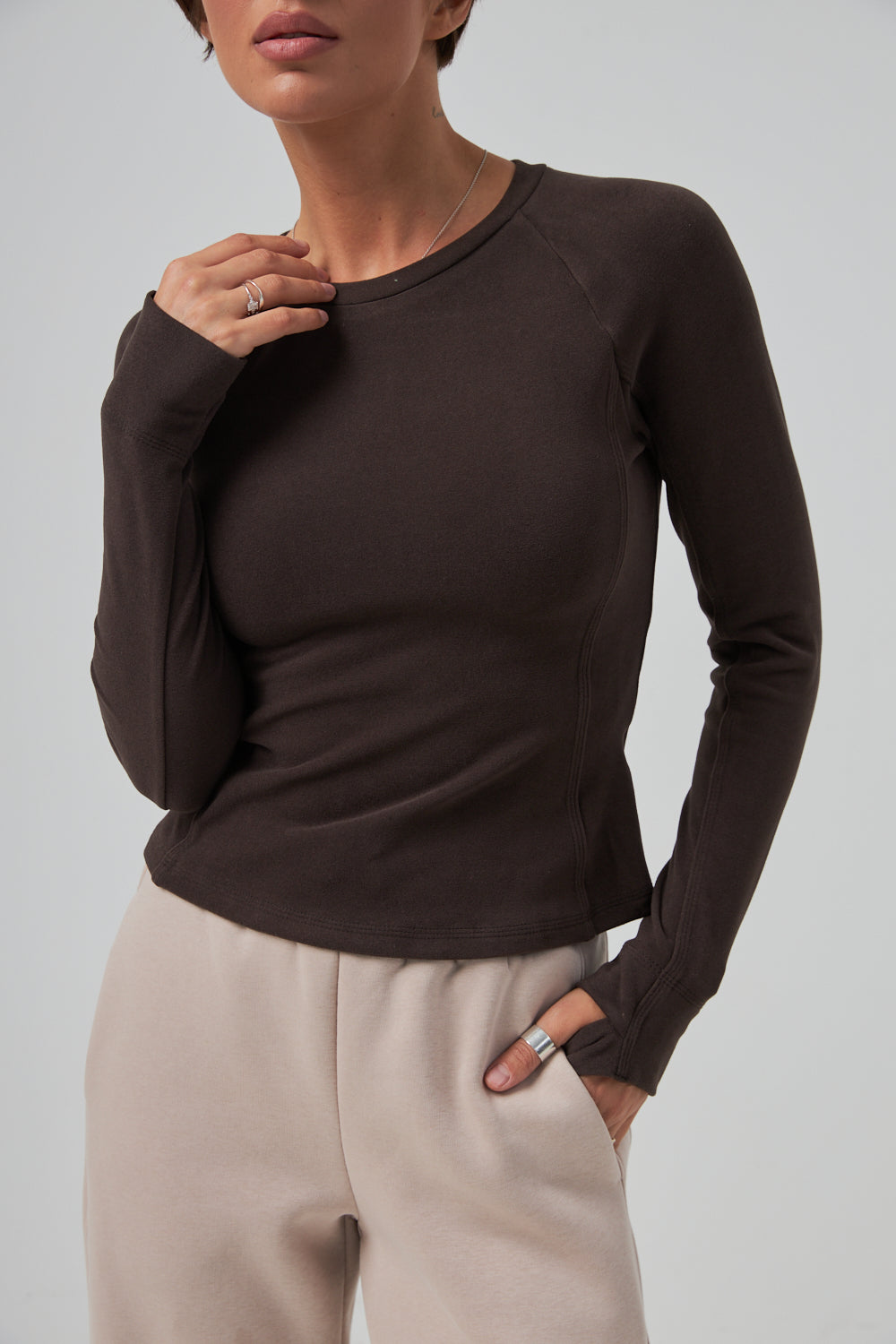 Виготовлений з еластичного трикотажного полотна. Завдяки такому складу матеріал є м'яким, приємним до тіла та дихаючим, забезпечуючи комфорт протягом усього дня. Він стійкий до зношування та добре тримає форму.Лонгслів має прямий, універсальний крій та класичний круглий виріз горловини, що пасує будь-якій фігурі. Він ідеально підходить для створення багатошарових (мультишарових) образів.