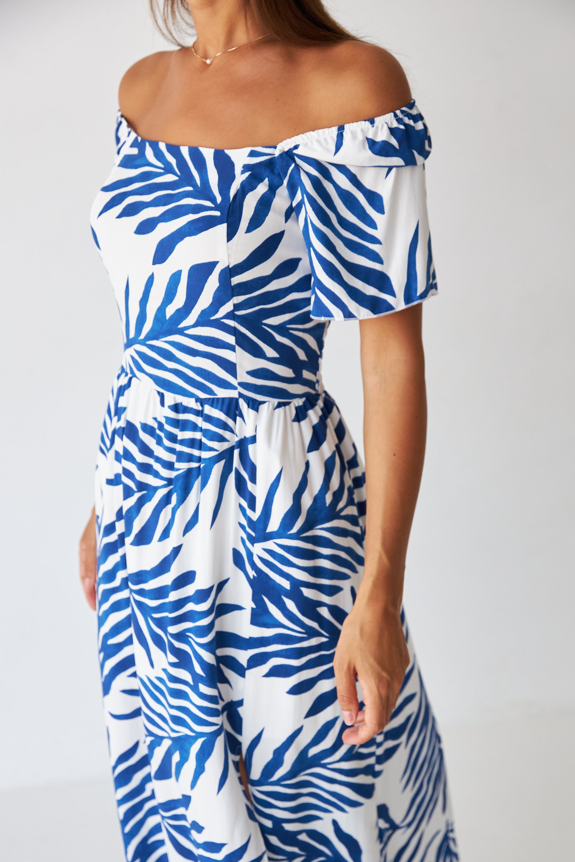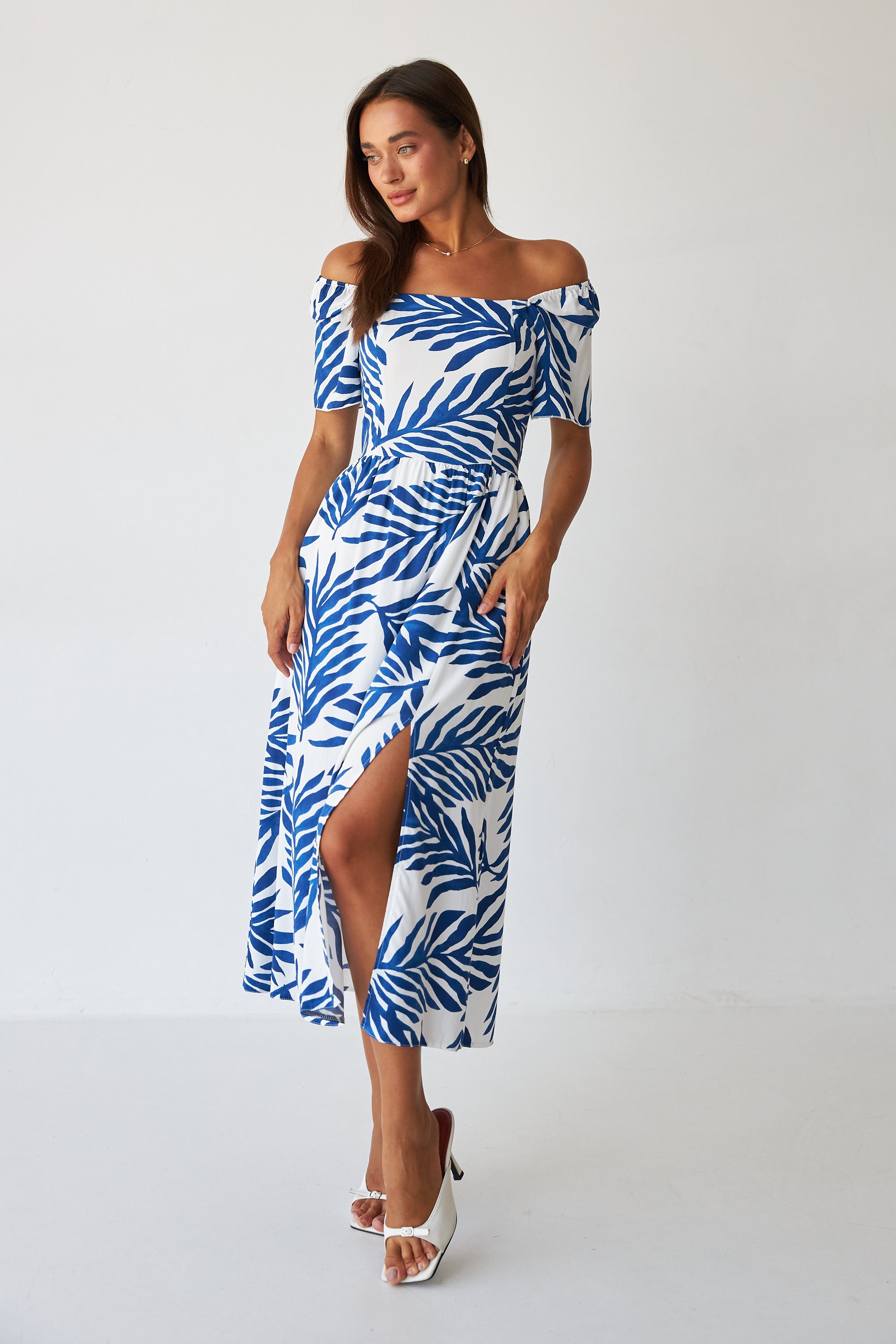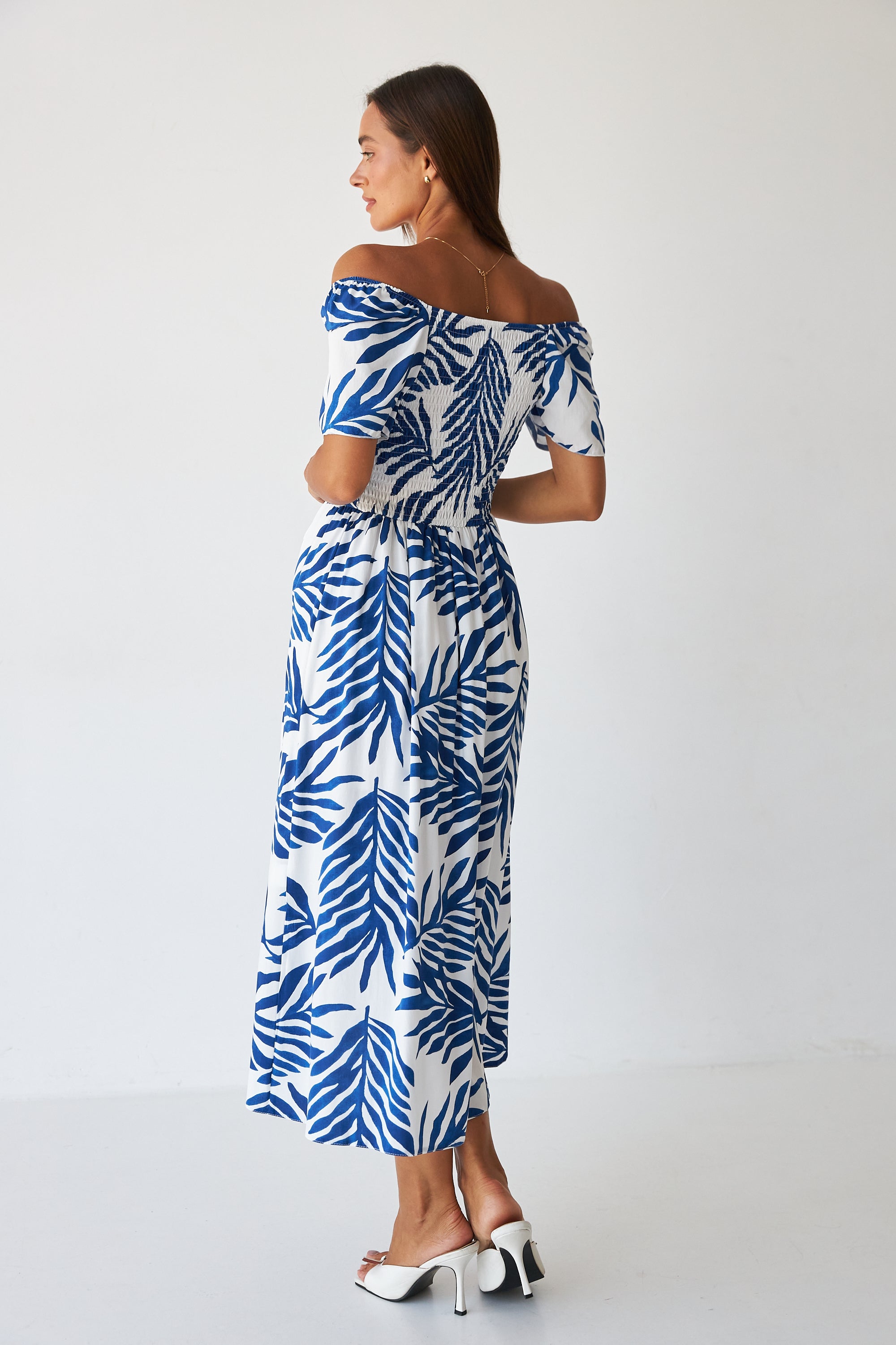 Посадка: вільна або злегка приталена верхня частина з чітко виокремленою талією, плавно переходить у розкльошений низ довжини максі — забезпечує свободу руху та легкість силуету