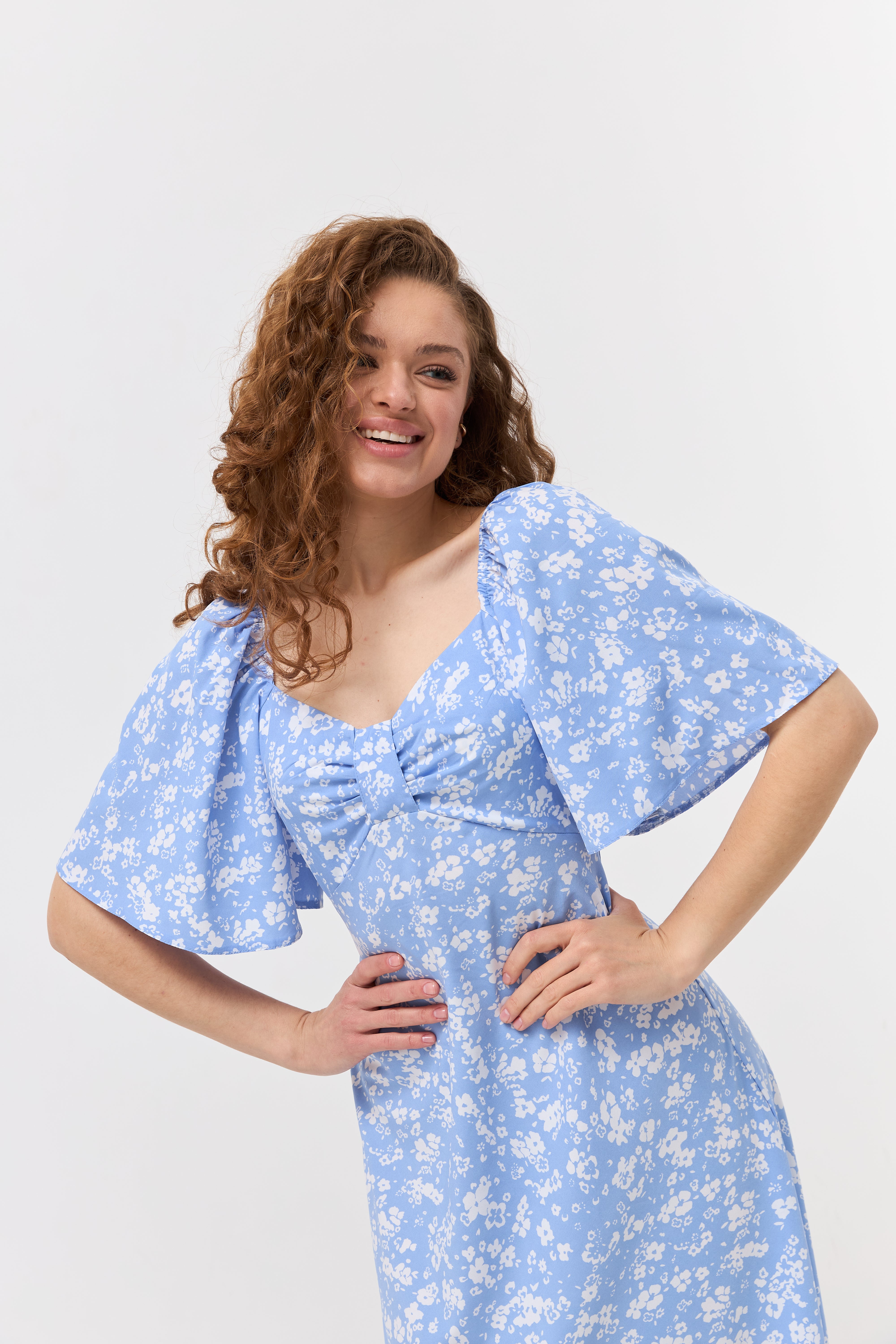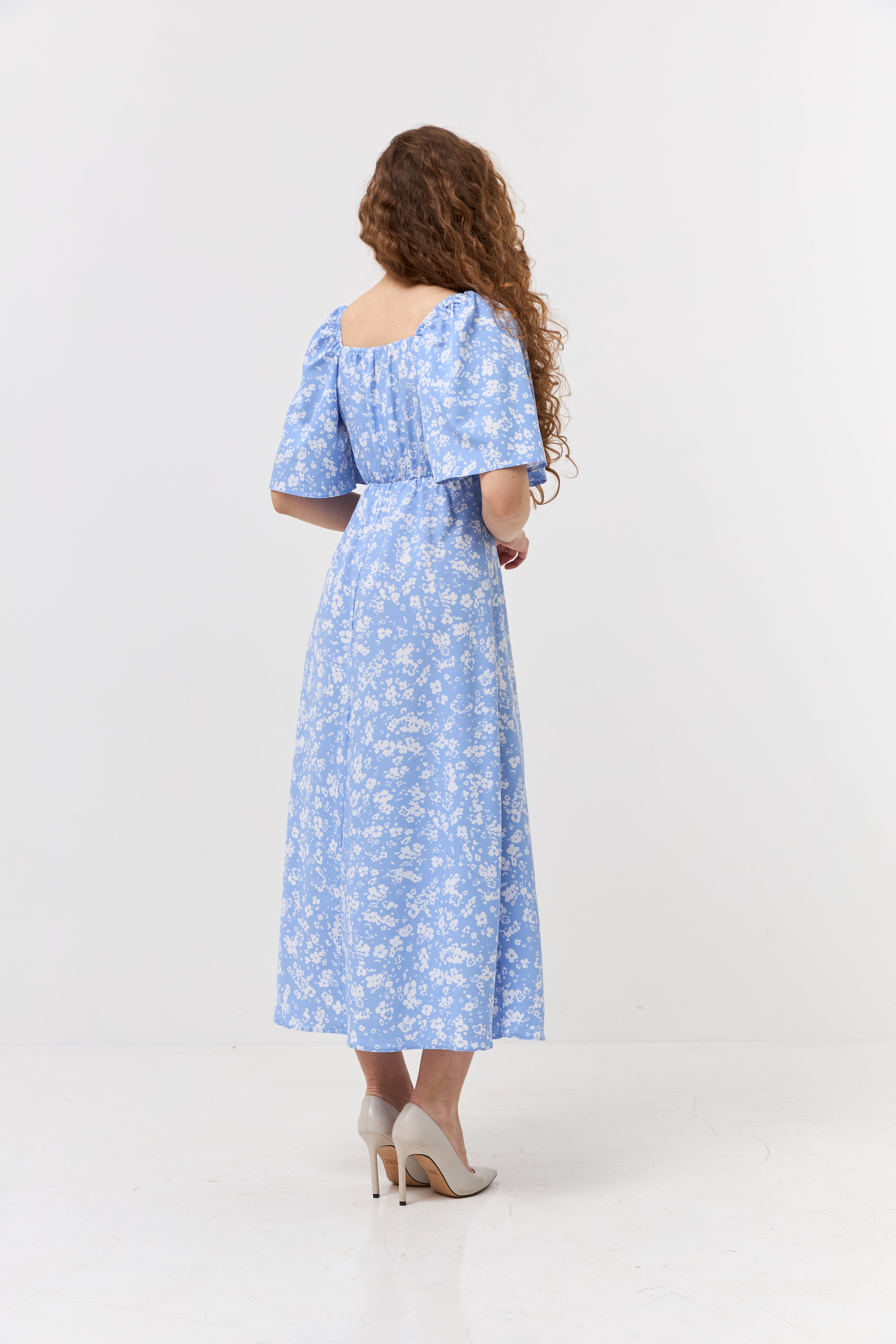 Сукня має витончений виріз "сердечко" та короткі рукави-крильця, які підкреслюють лінію плечей. Приталений силует у зоні талії елегантно переходить у легку розкльошену спідницю довжини міді, забезпечуючи свободу рухів та підкреслюючи жіночність фігури. Ця сукня стане чудовим вибором для прогулянок, побачень, літніх вечірок або створення невимушеного святкового образу.
