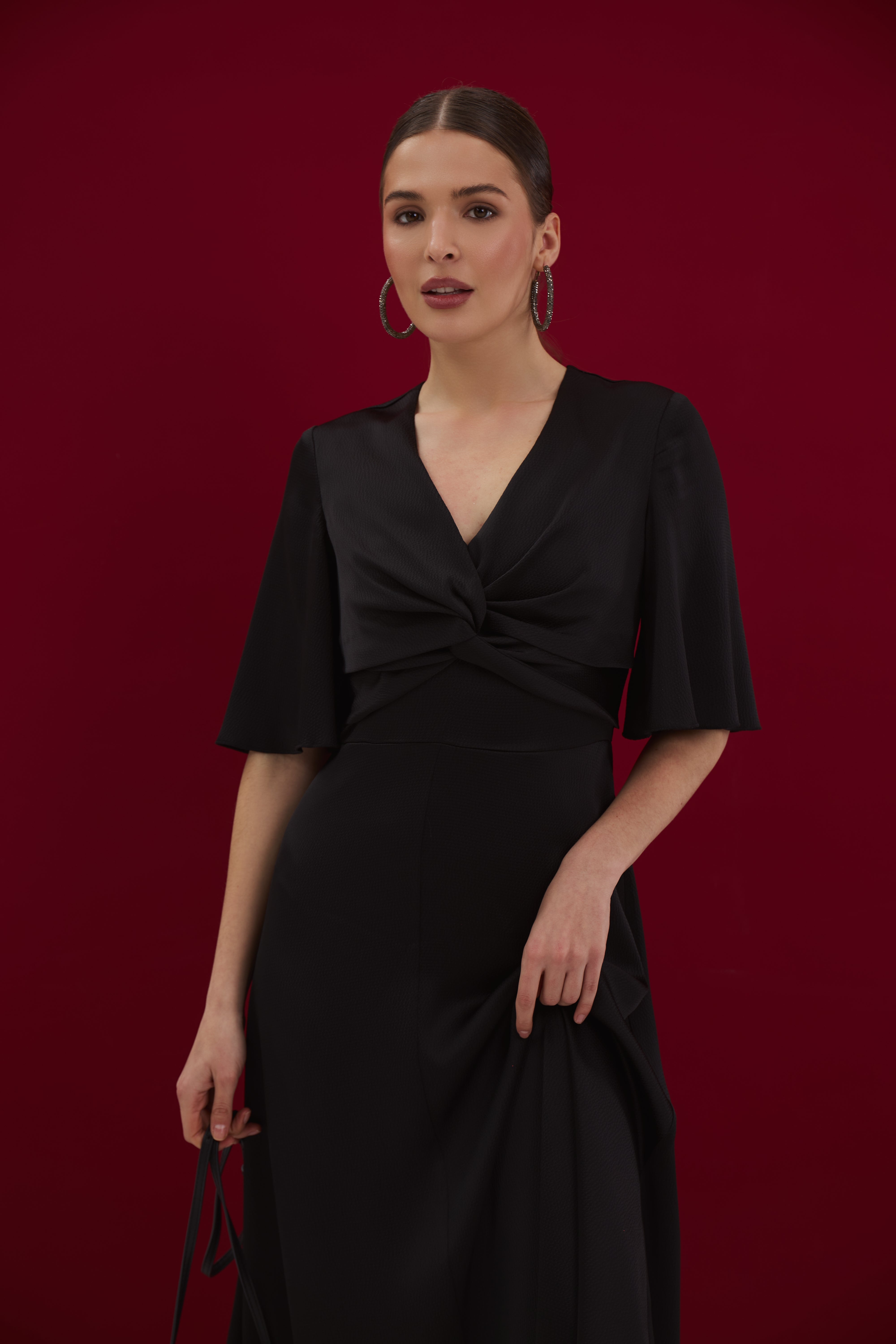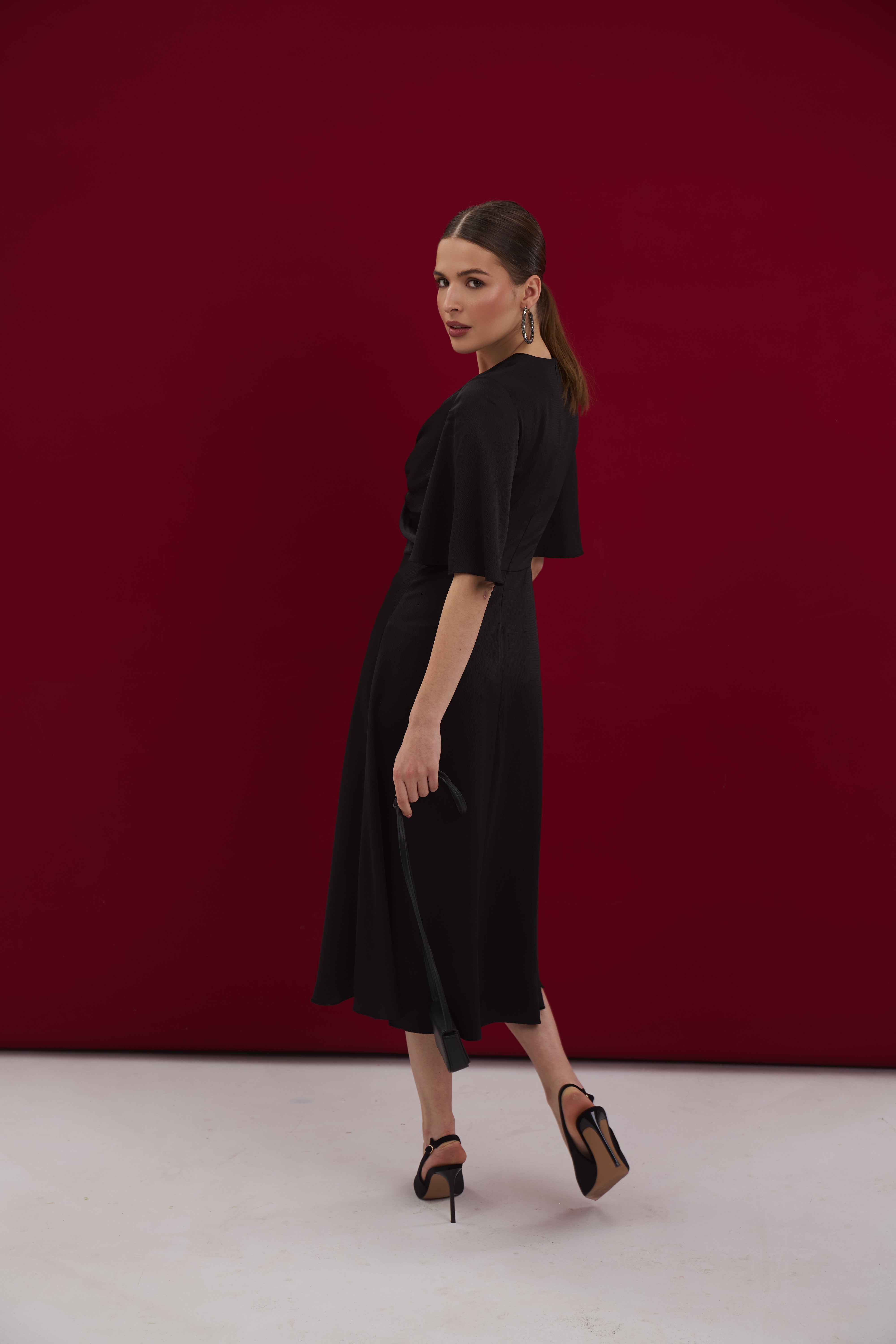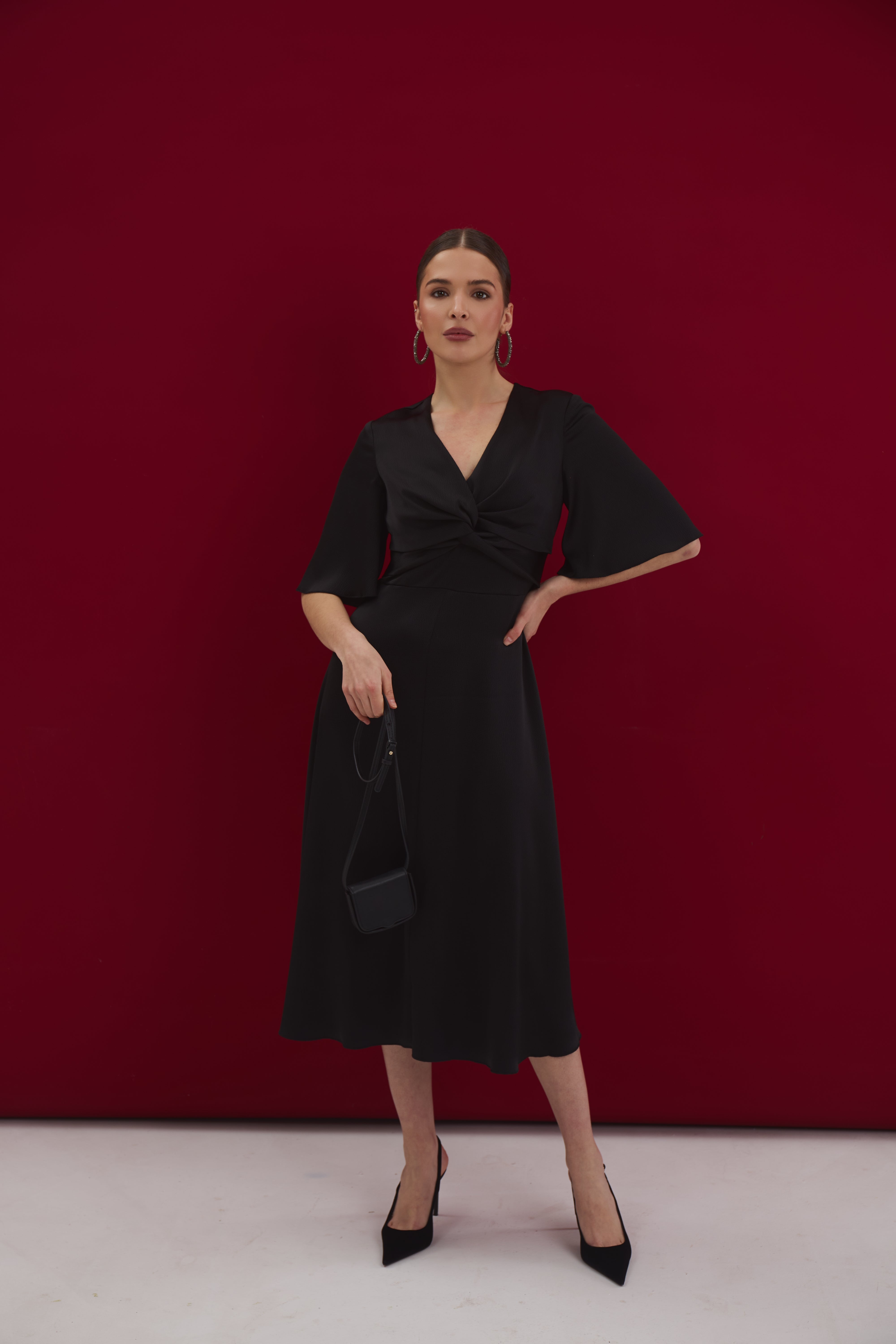 Розкішна атласна сукня міді. Головна особливість — стильне перекрут на грудях, що підкреслює декольте. V-подібний виріз та вільний крій спідниці створюють жіночний силует. Сукня чудово підійде для святкування Нового року, корпоративу або урочистої події.