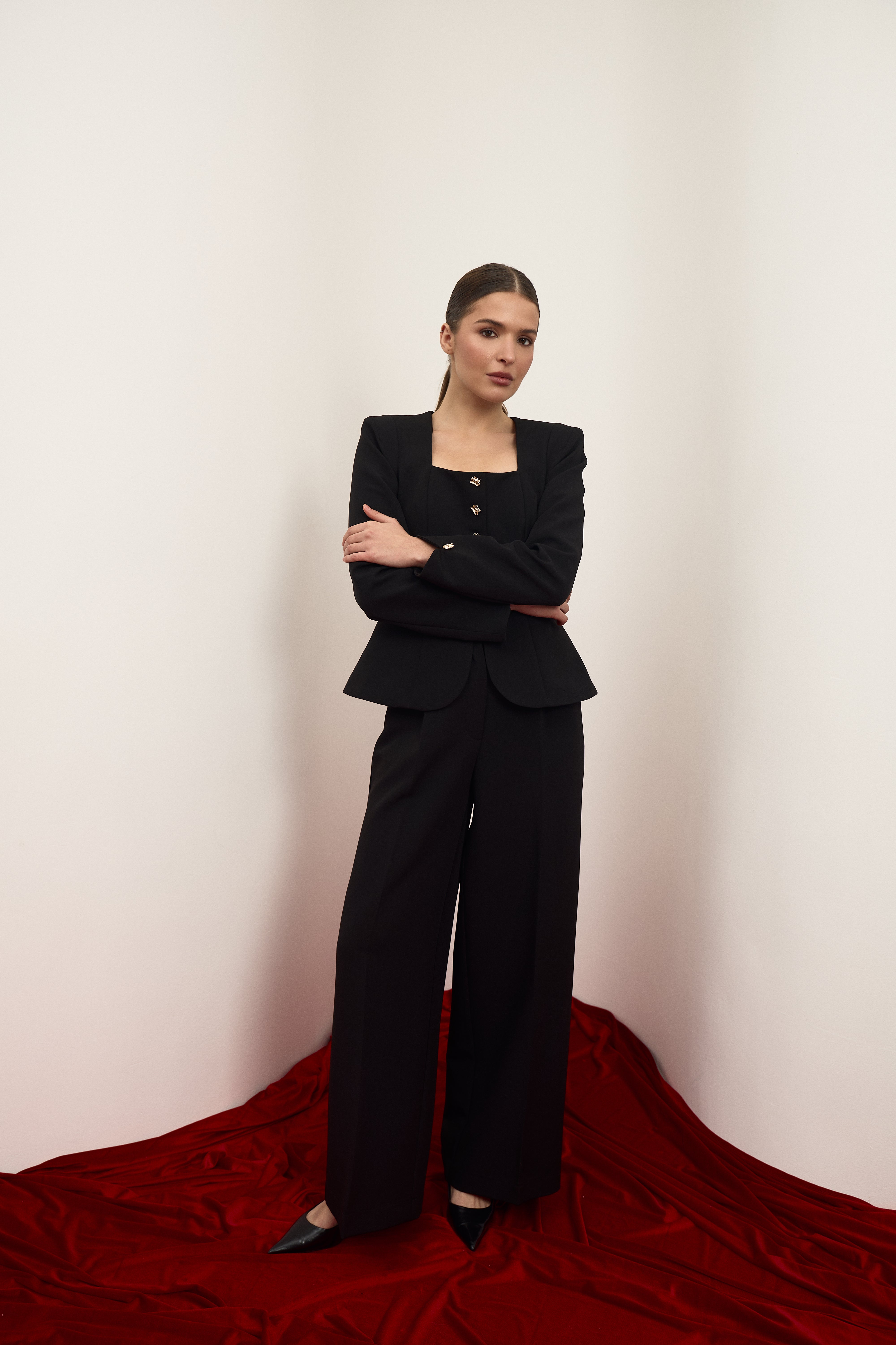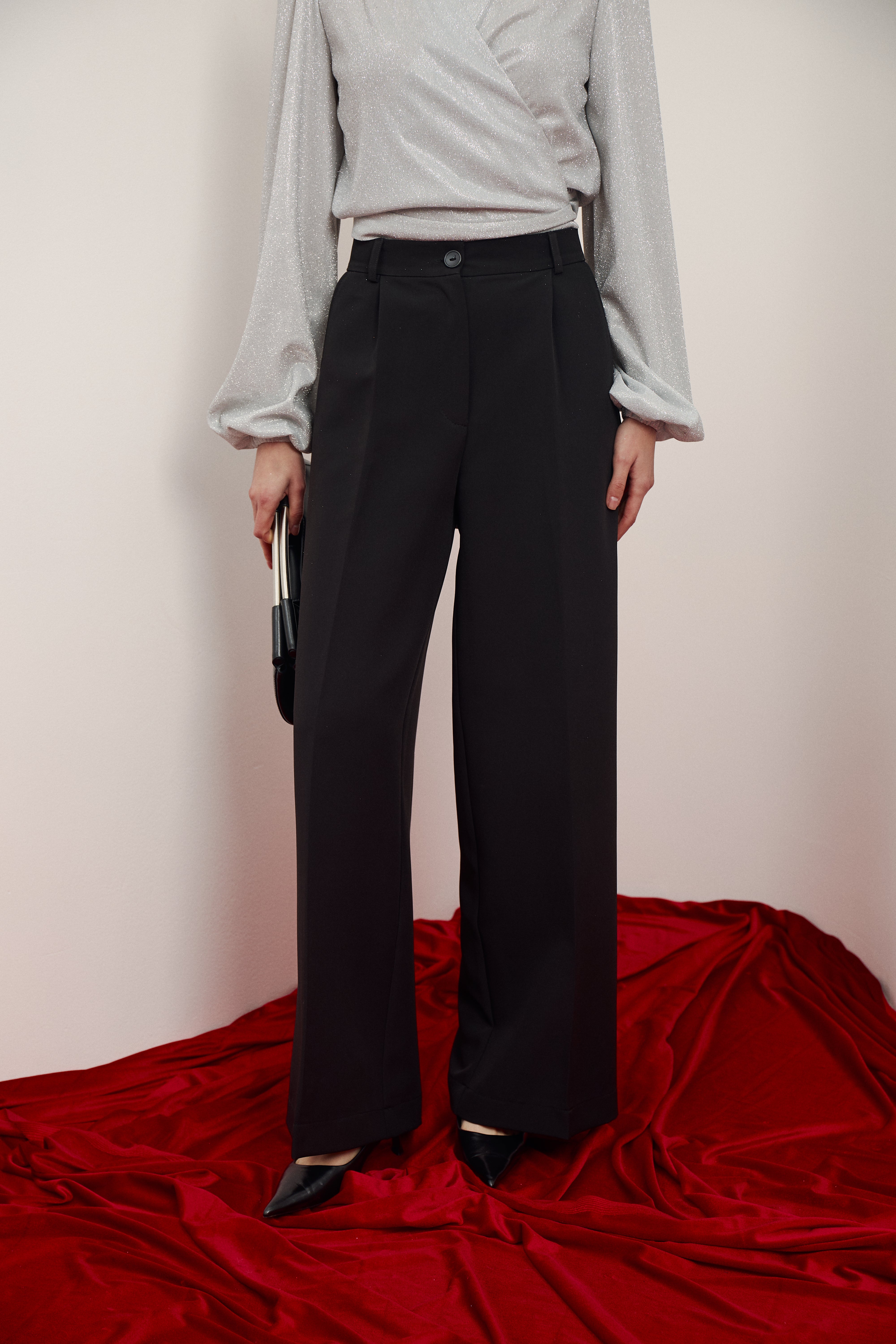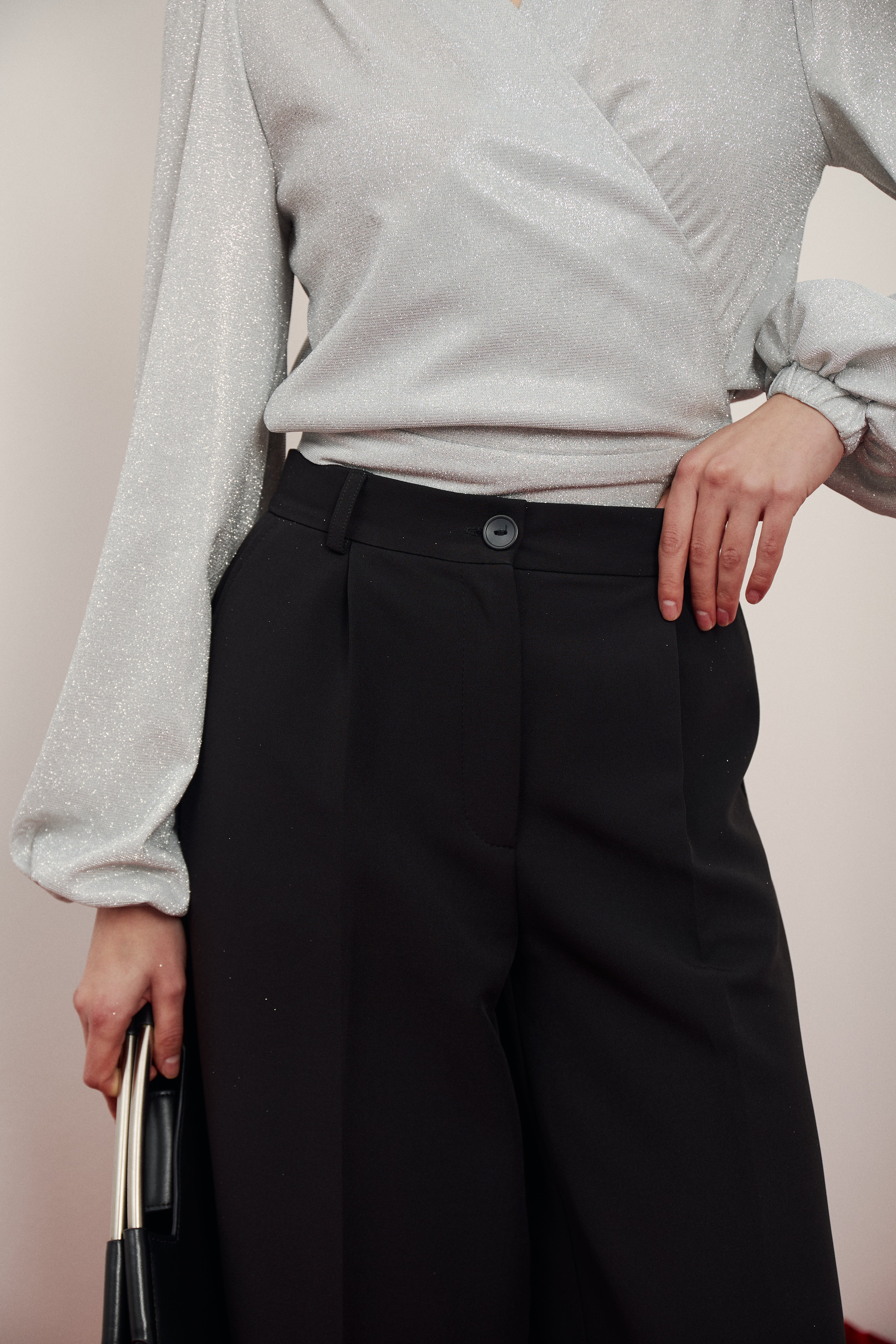 Стильні чорні широкі штани зі стрілками — ідеальна основа для будь-якого образу. Висока посадка та чіткі вертикальні захипи візуально подовжують силует. Штани виконані із костюмної тканини, що добре тримає форму. Це універсальна модель, яка підійде як для офісу, так і для вечірнього виходу. Must-have у гардеробі!