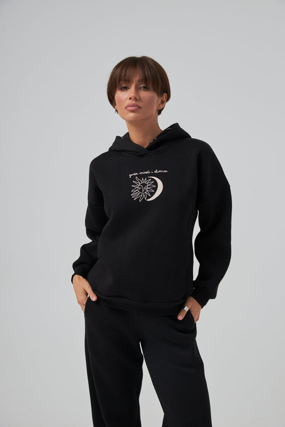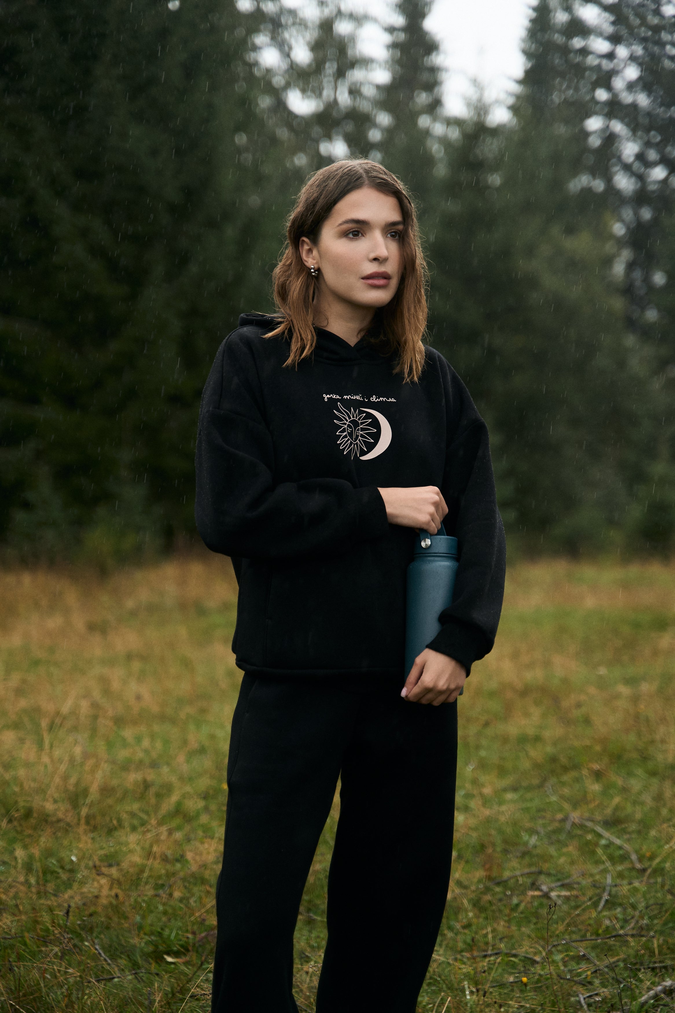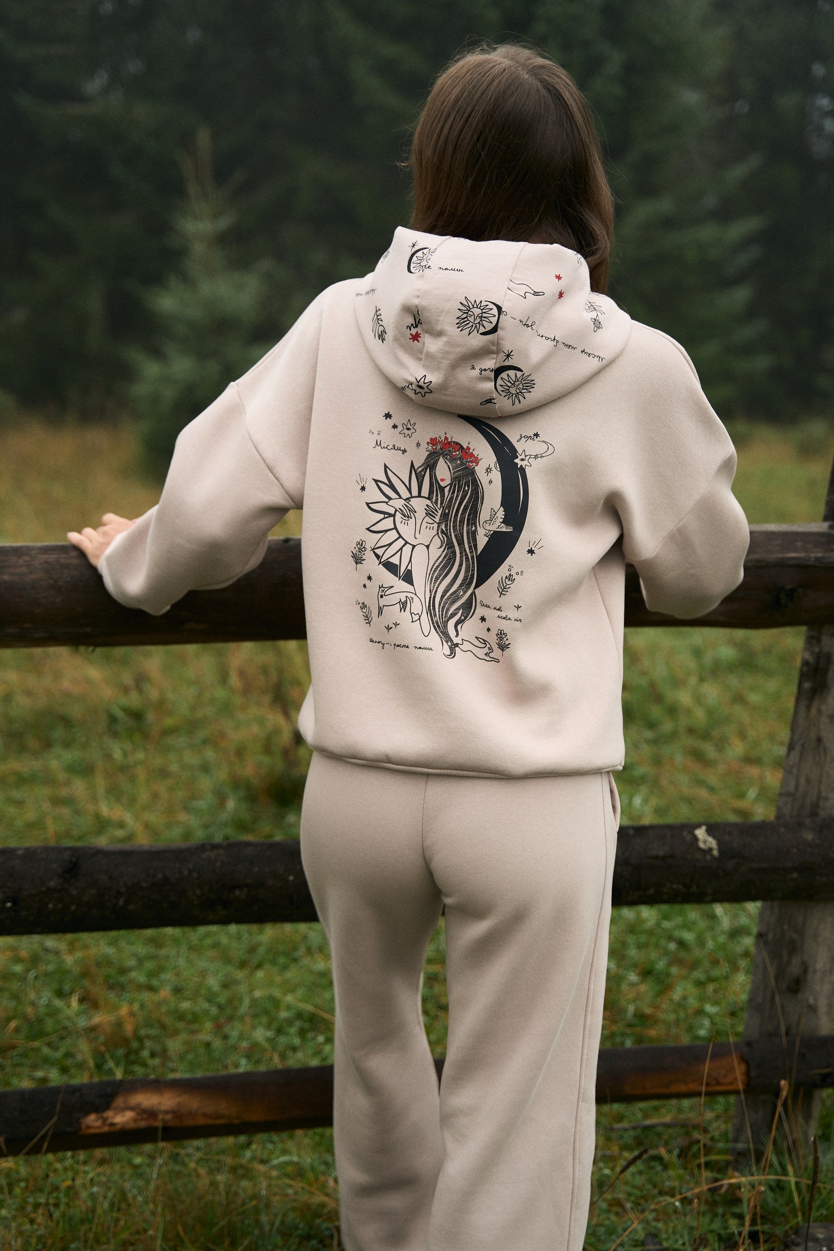 Це комфортне та стильне Худі жіноче з принтом "Лісова казка" стане Вашою улюбленою річчю для створення затишних і водночас акцентних образів у холодну пору. Виготовлене з теплої та якісної тканини, воно забезпечує максимальний комфорт та тепло, будучи ідеальним для зими.Худі має класичний для стилю оверсайз крій, а також практичний капюшон та довгі рукава на манжетах.