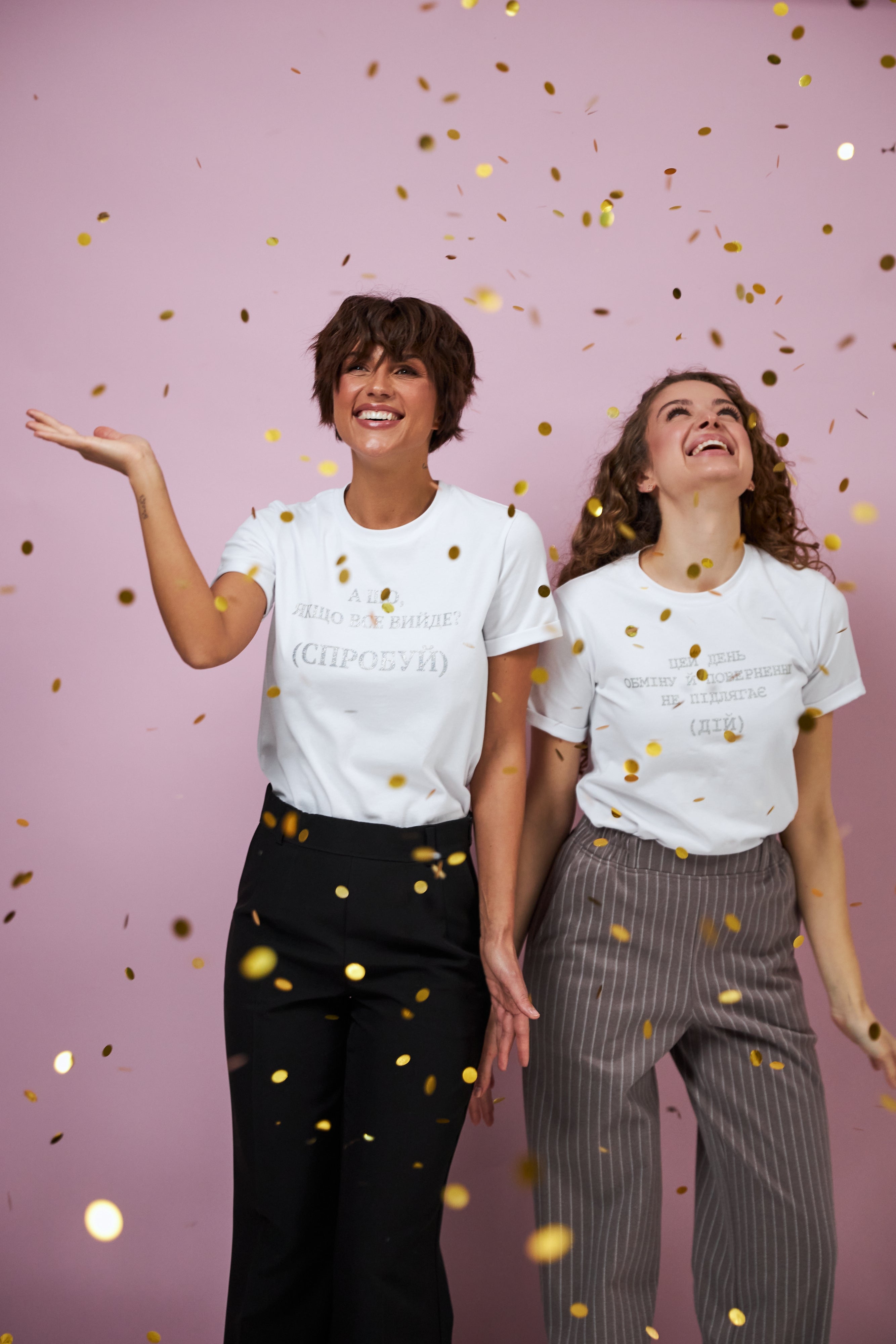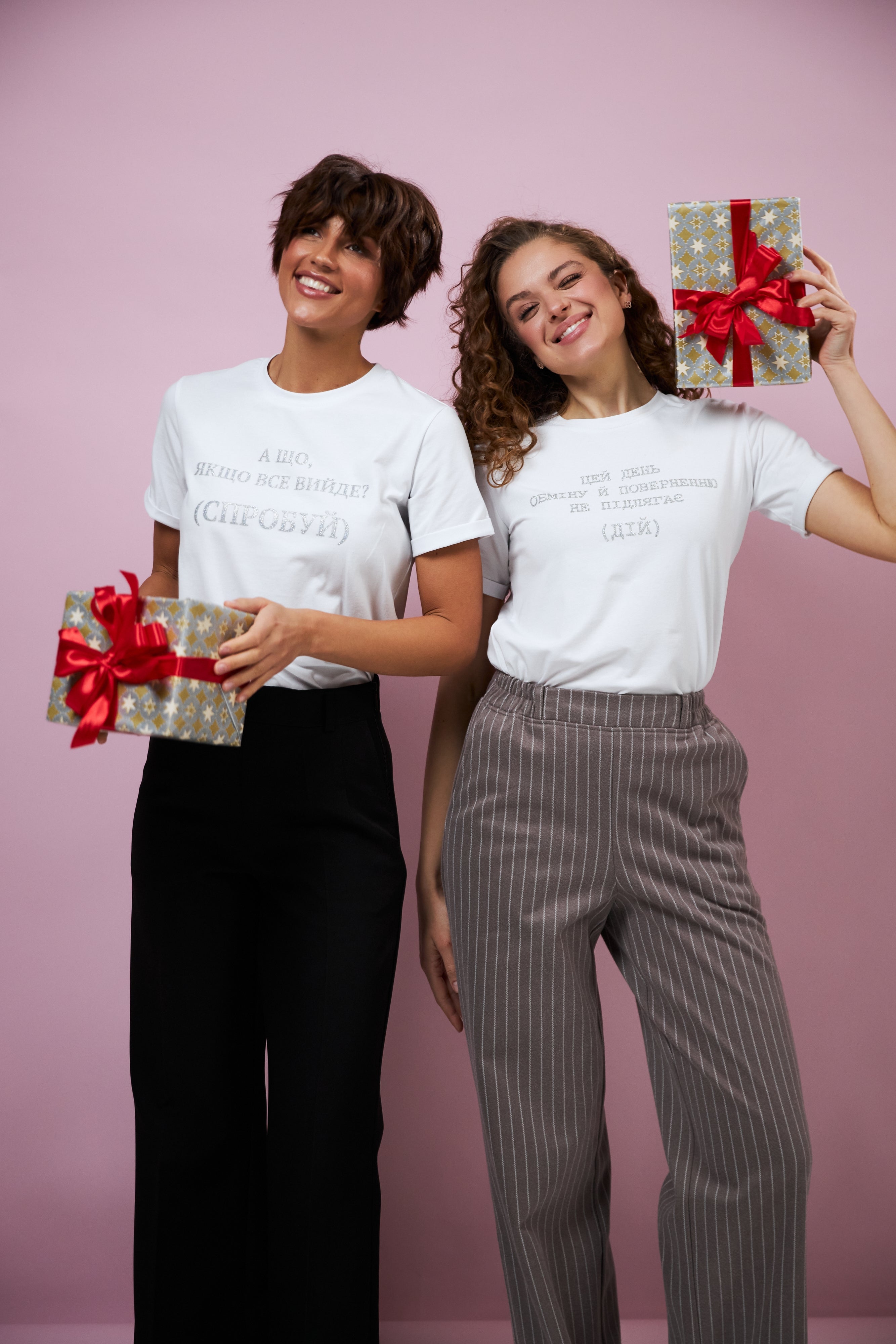 Надихаюча біла футболка з мотивуючою фразою "А ЩО, ЯКЩО ВСЕ ВИЙДЕ? (СПРОБУЙ)". Напис виконаний блискучим сріблястим глітером. Класичний крій, Це не просто одяг, а стильний заклик до дії, ідеальний для повсякденного носіння та створення яскравих образів.