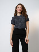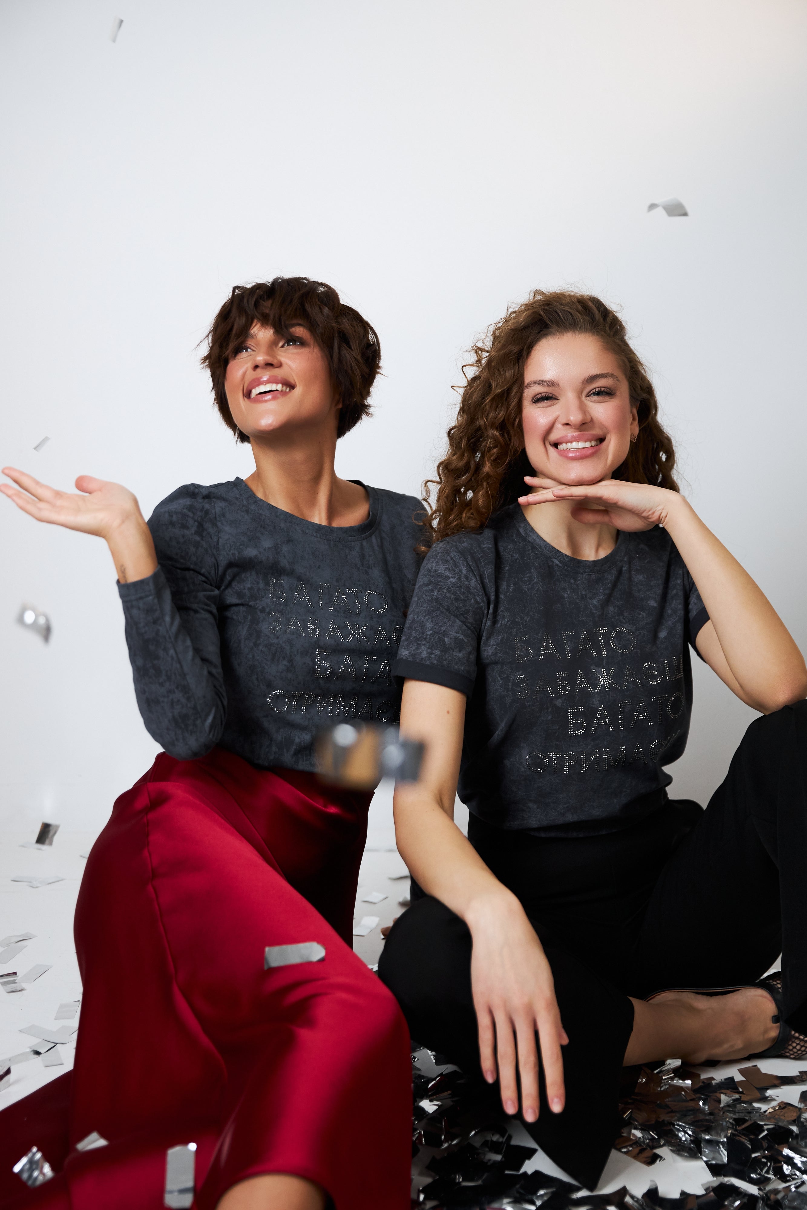 Ефектна графітова футболка з унікальним ефектом "варенки". Оригінальний принт-напис зі стразів "МАЛО БАЖАЄШ – БАГАТО ОТРИМАЄШ" додає блиску. Крій унісекс. Ідеальний вибір для сміливого street-style образу.