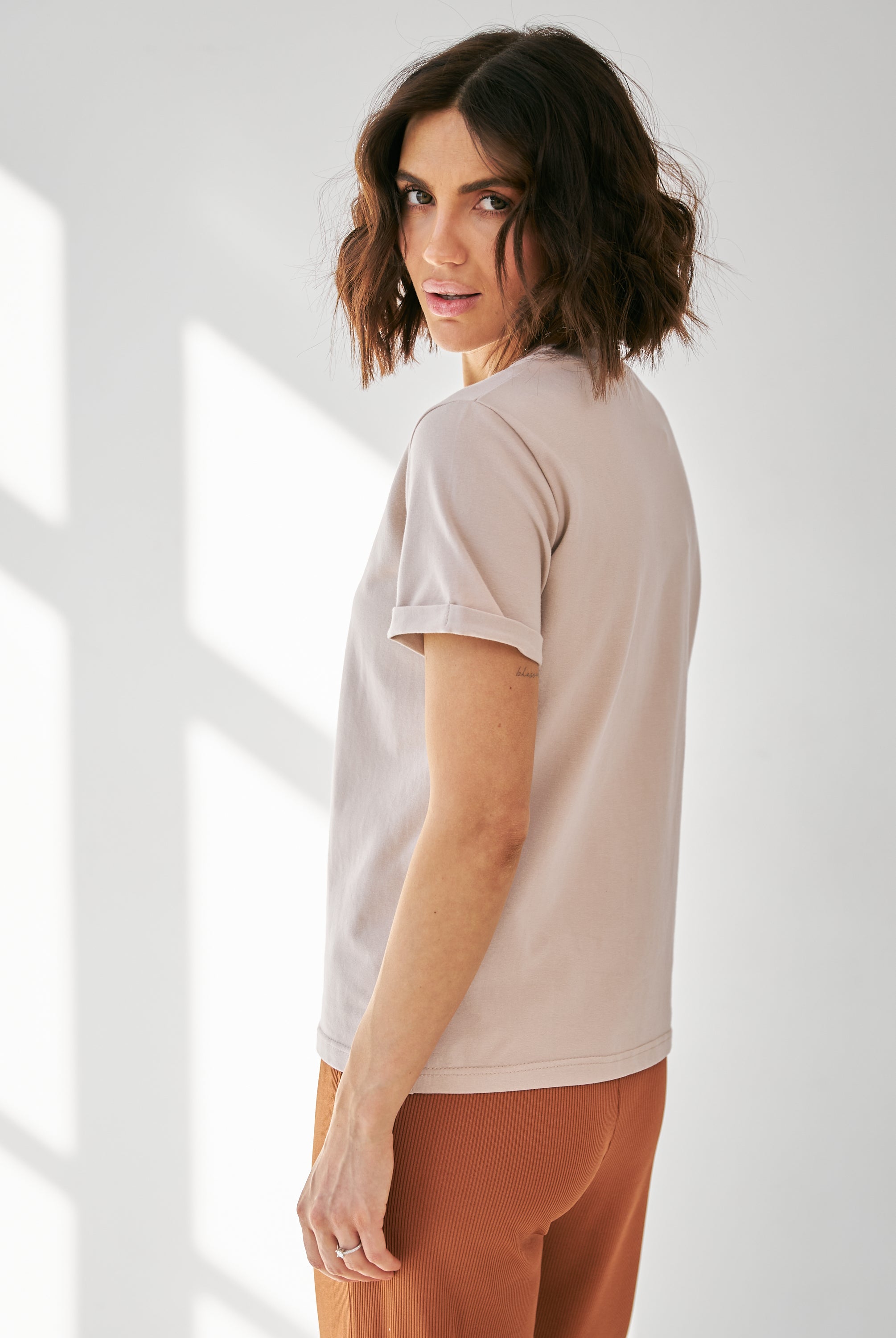 Стильна та комфортна жіноча футболка, виготовлена з м'якої та дихаючої кулірної гладі. Цей легкий матеріал ідеально підходить для повсякденного носіння, забезпечуючи зручність та свободу рухів. Особливістю цієї моделі є лаконічний, але ефектний декор на грудях, який додає футболці оригінальності та стилю.
