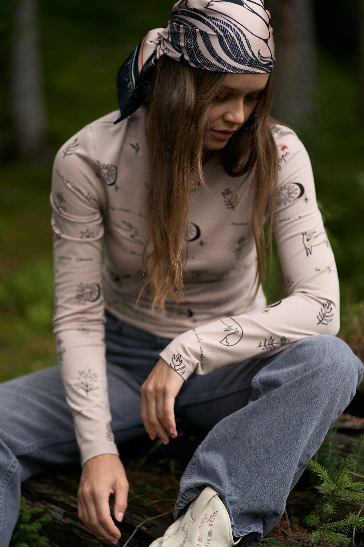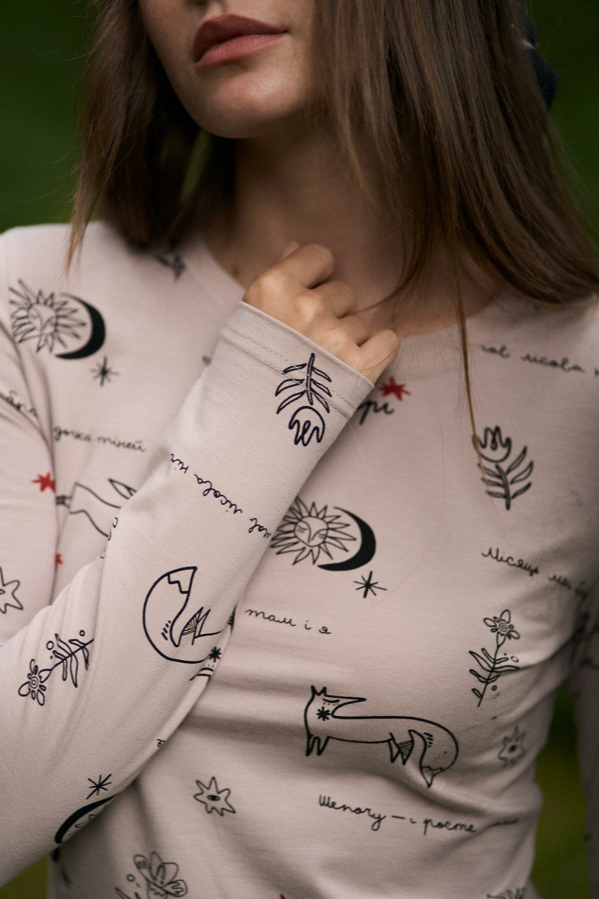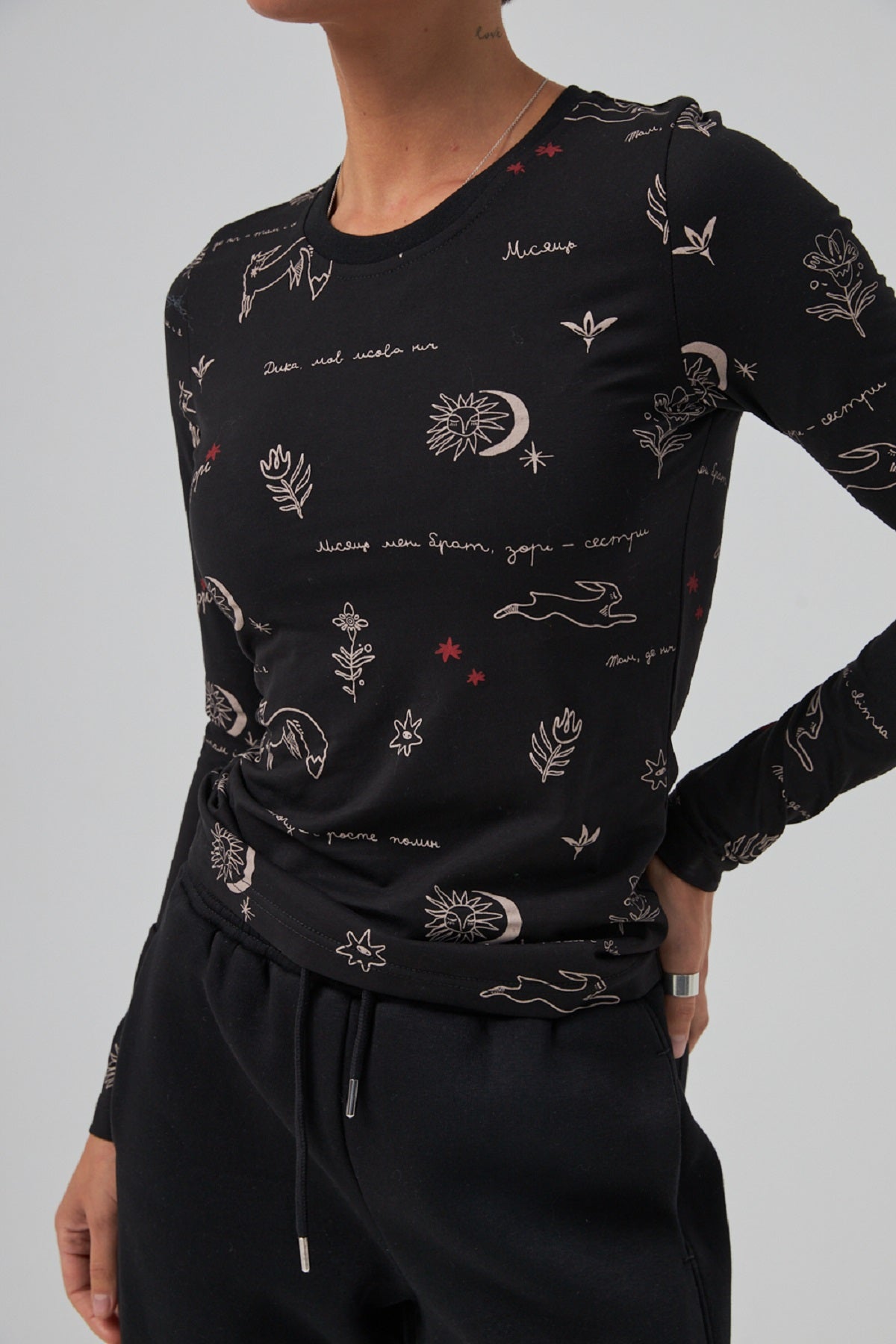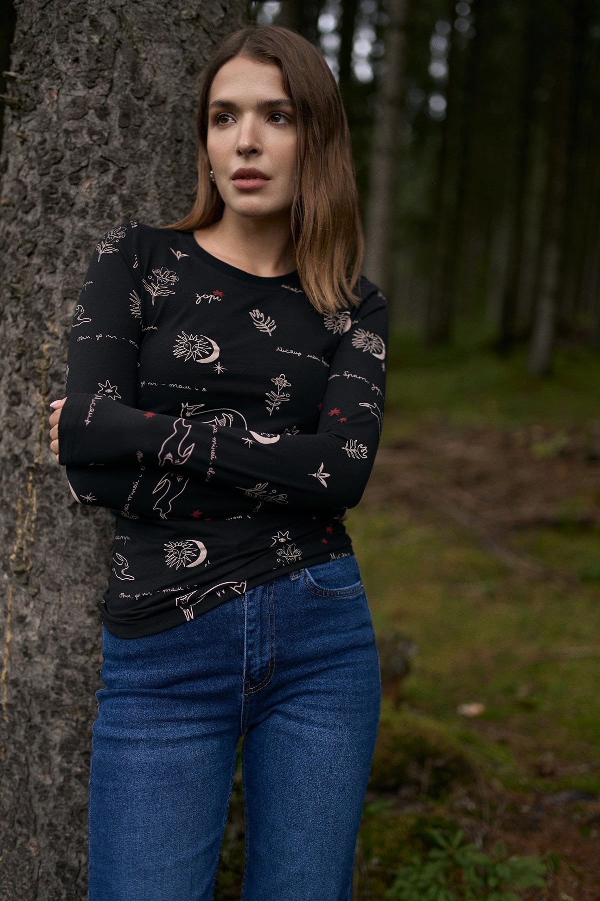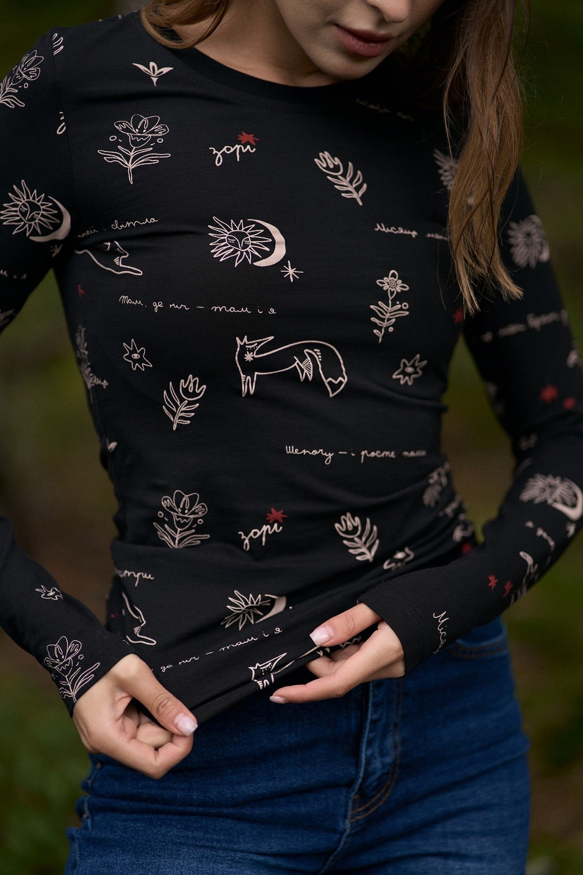 Головна особливість — ексклюзивний авторський принт "Лісова казка" та класичний прямий крій, що робить його ідеальним для створення виразного, але комфортного кежуал-стилю.лонгслів є чудовою основою для стильних образів: поєднуйте його з базовими джинсами чи брюками-карго, зі спідницею міді або шкіряними легінсами для контрасту, доповнюючи образ жакетом, тренчем або об'ємним кардиганом.