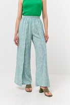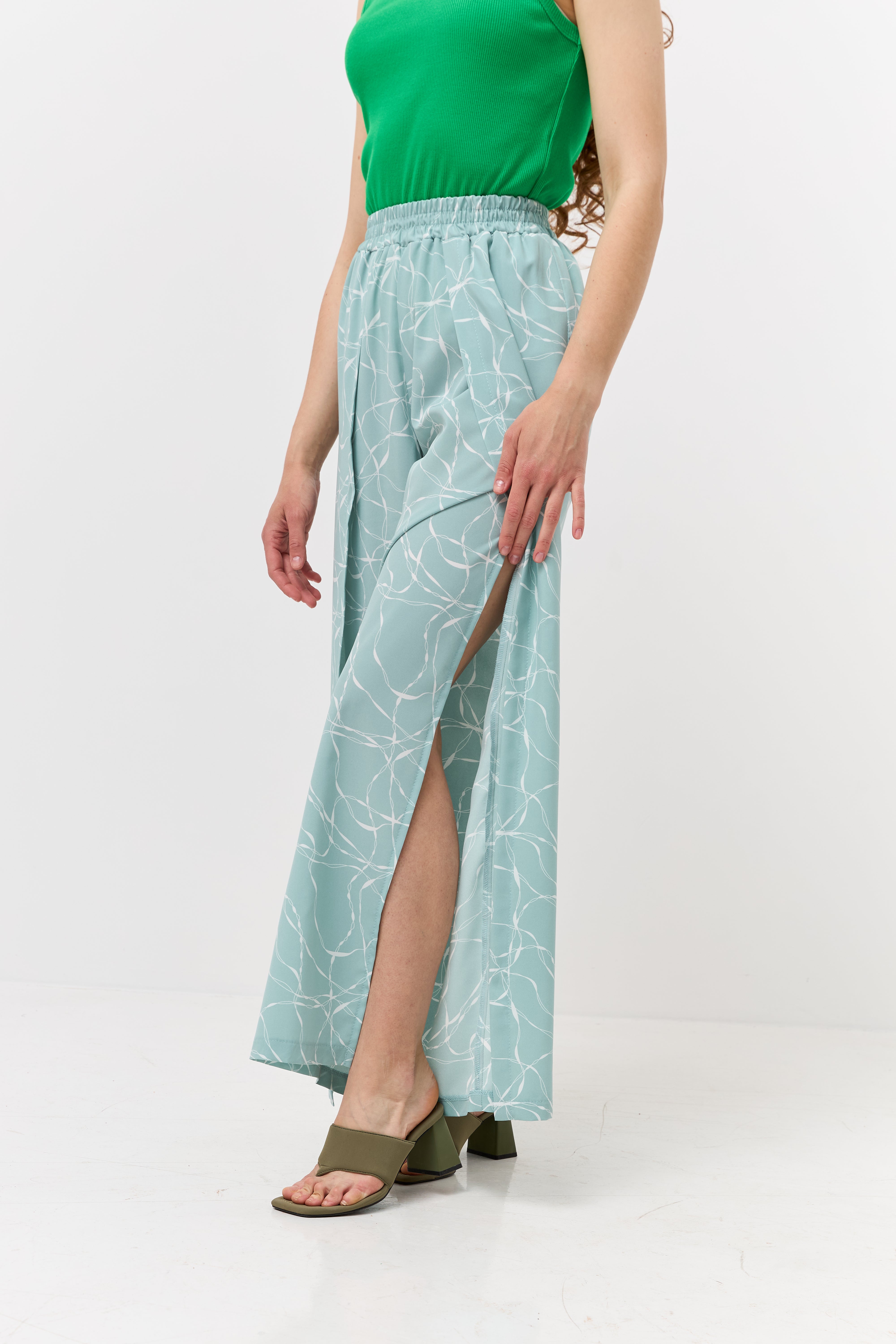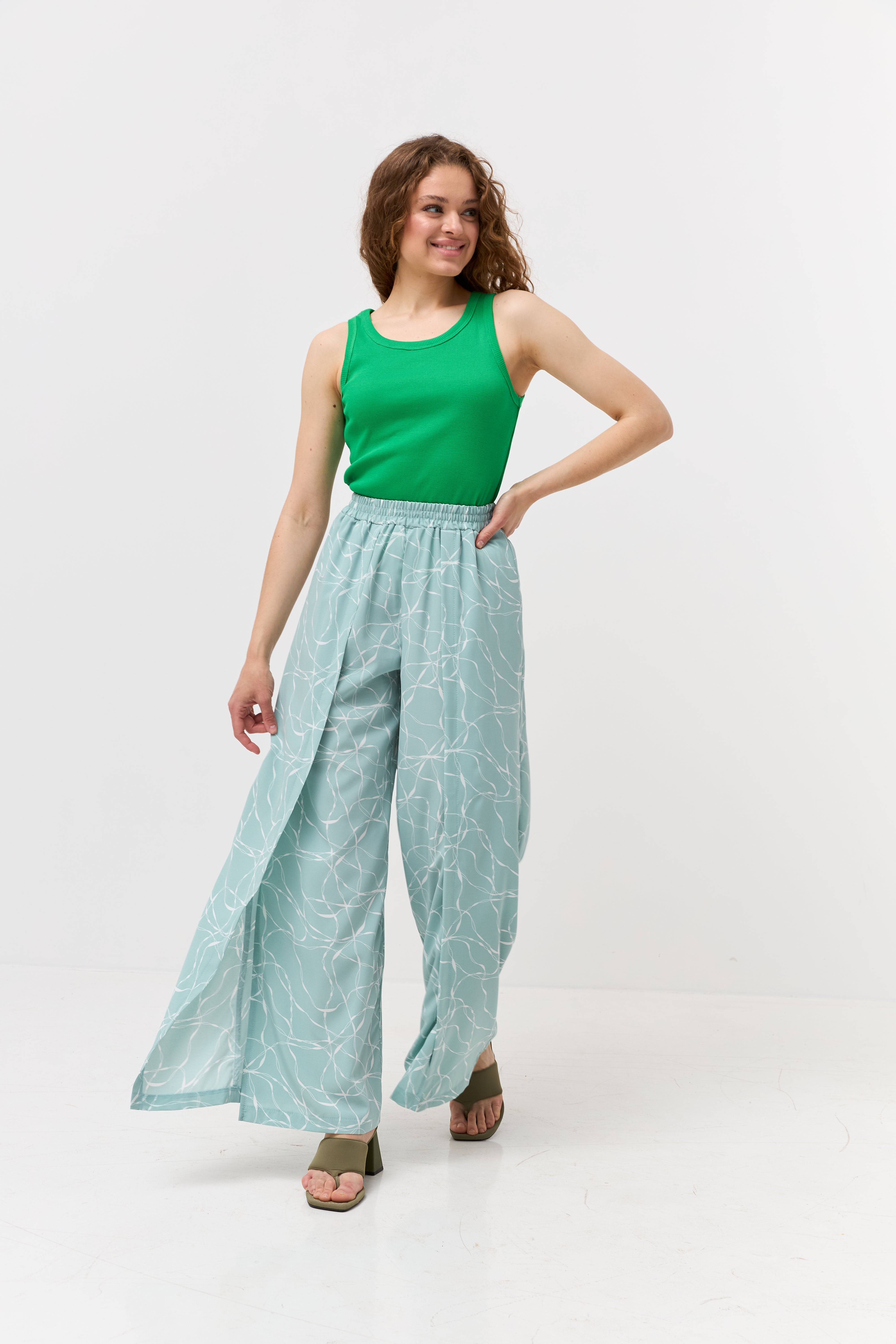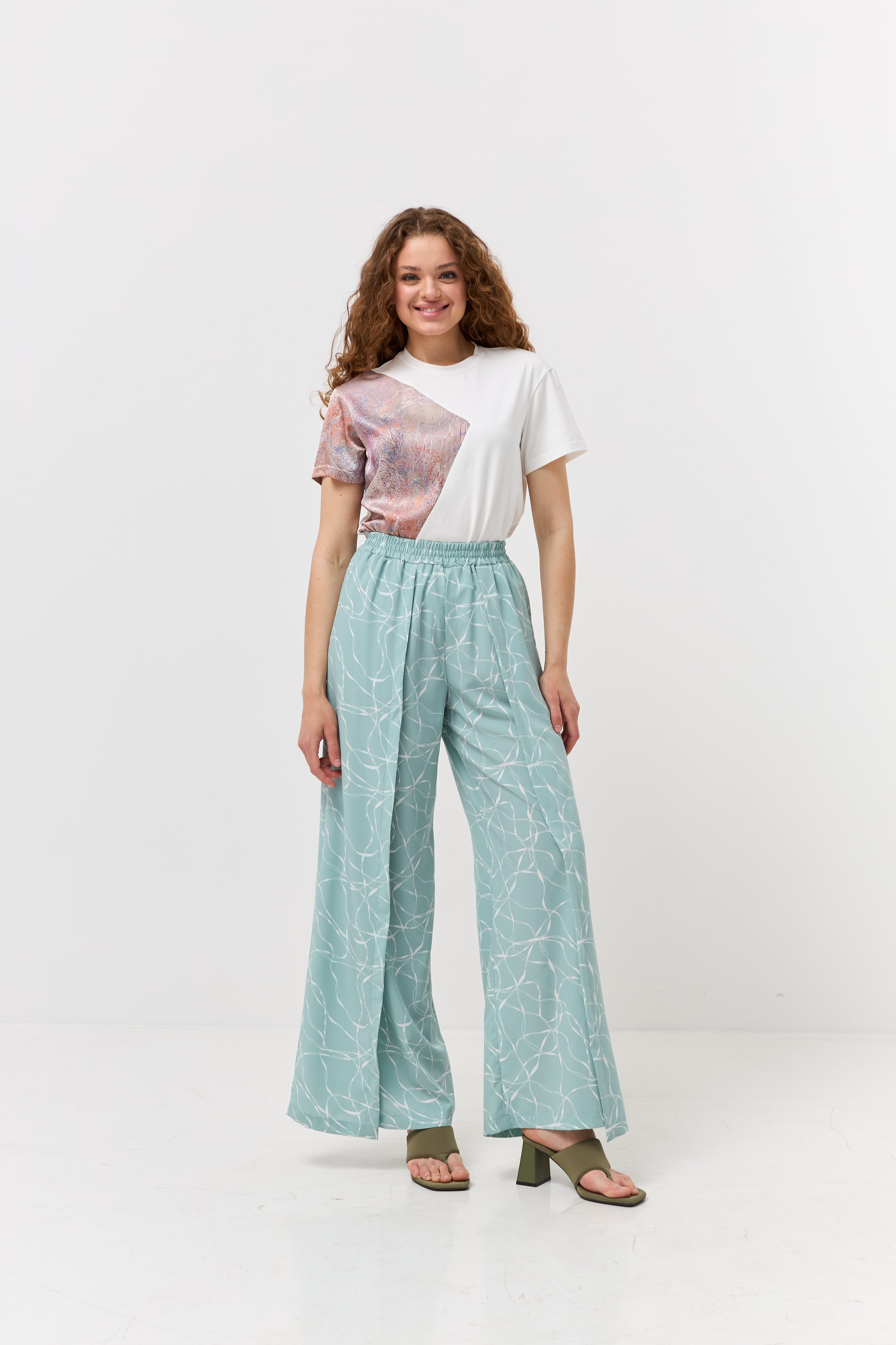 Оригінальний абстрактний принт у ніжних блакитних відтінках додає цим брюкам особливої витонченості та стилю. Вони стануть яскравим акцентом у вашому літньому гардеробі. Брюки ідеально поєднуються з різноманітними топами, блузами та футболками, дозволяючи створювати безліч модних образів для прогулянок, відпочинку або особливих випадків.