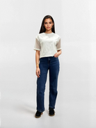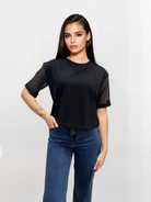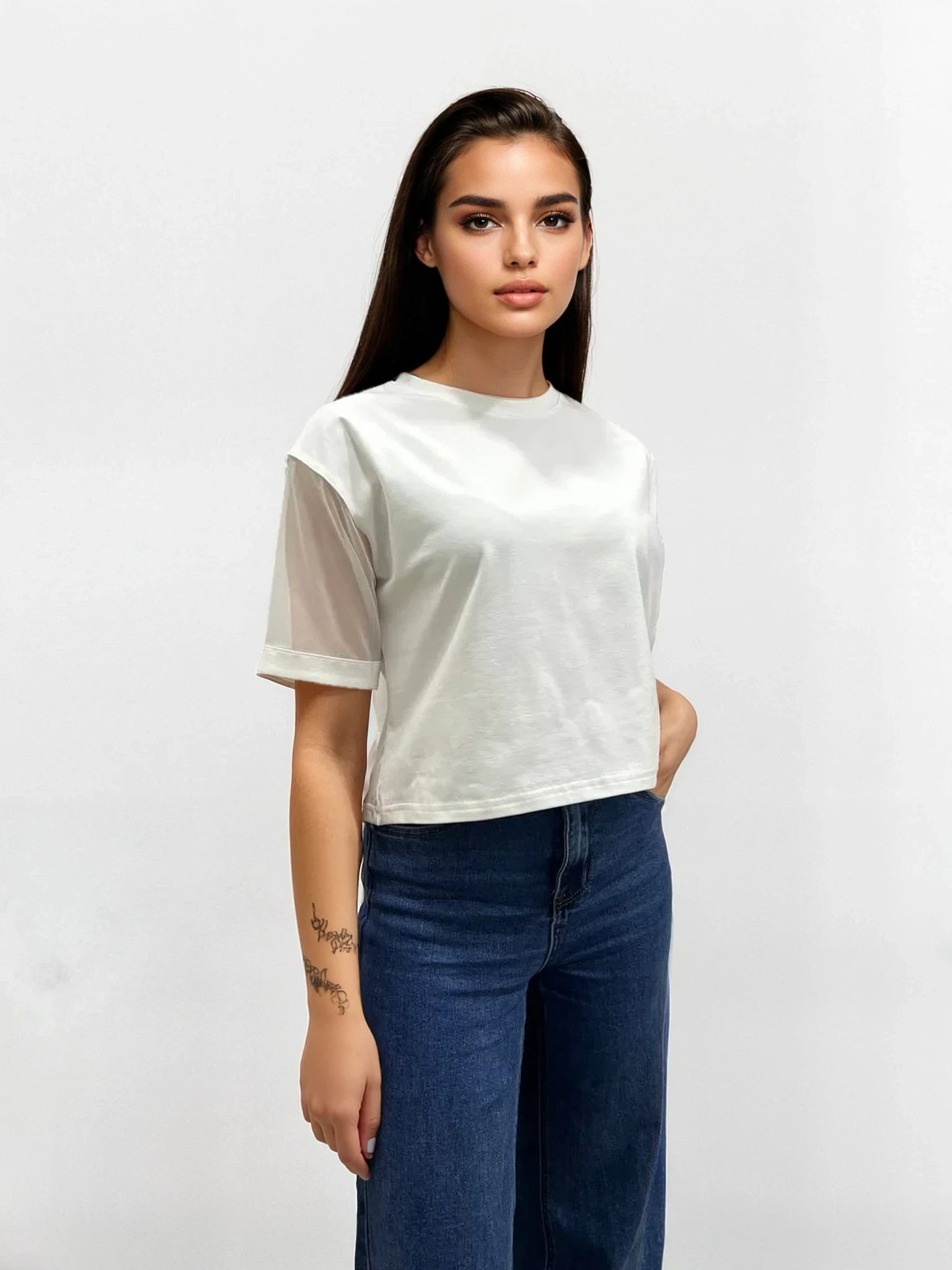 Стильна жіноча футболка з комбінованим дизайном: основа з якісного трикотажу та рукави з легкої сіточки.