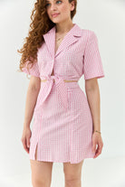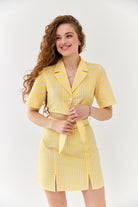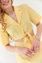 Модель із коротким рукавом, трендовою довжиною та елегантним коміром легко поєднується з джинсами, шортами чи спідницями. Зав’язка під грудьми додає акценту та підкреслює талію.