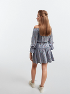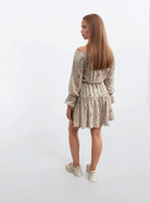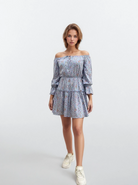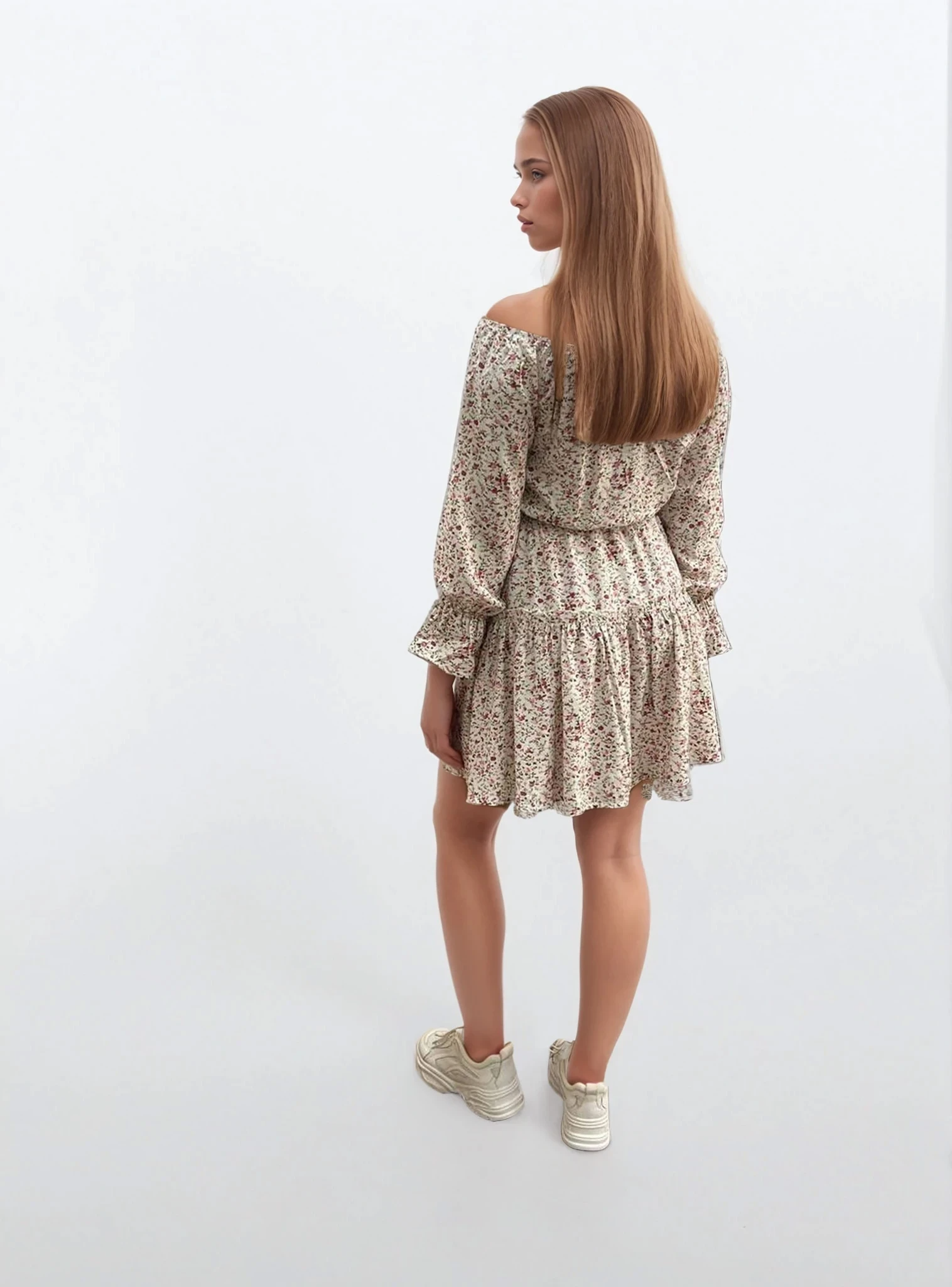 Легка міні-сукня з відкритими плечима та квітковим принтом зі штапелю.
