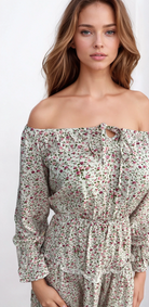 Особливістю цієї моделі є відкриті плечі та еластична вставка по лінії декольте, яку можна носити як на плечах, так і опустивши. Довгі рукави з еластичними манжетами та ніжними рюшами додають образу витонченості. Відрізна лінія талії з еластичною вставкою підкреслює фігуру, а легка ярусна спідниця створює кокетливий та грайливий силует. Ця сукня стане чудовим вибором для прогулянок, побачень або літніх вечірок.