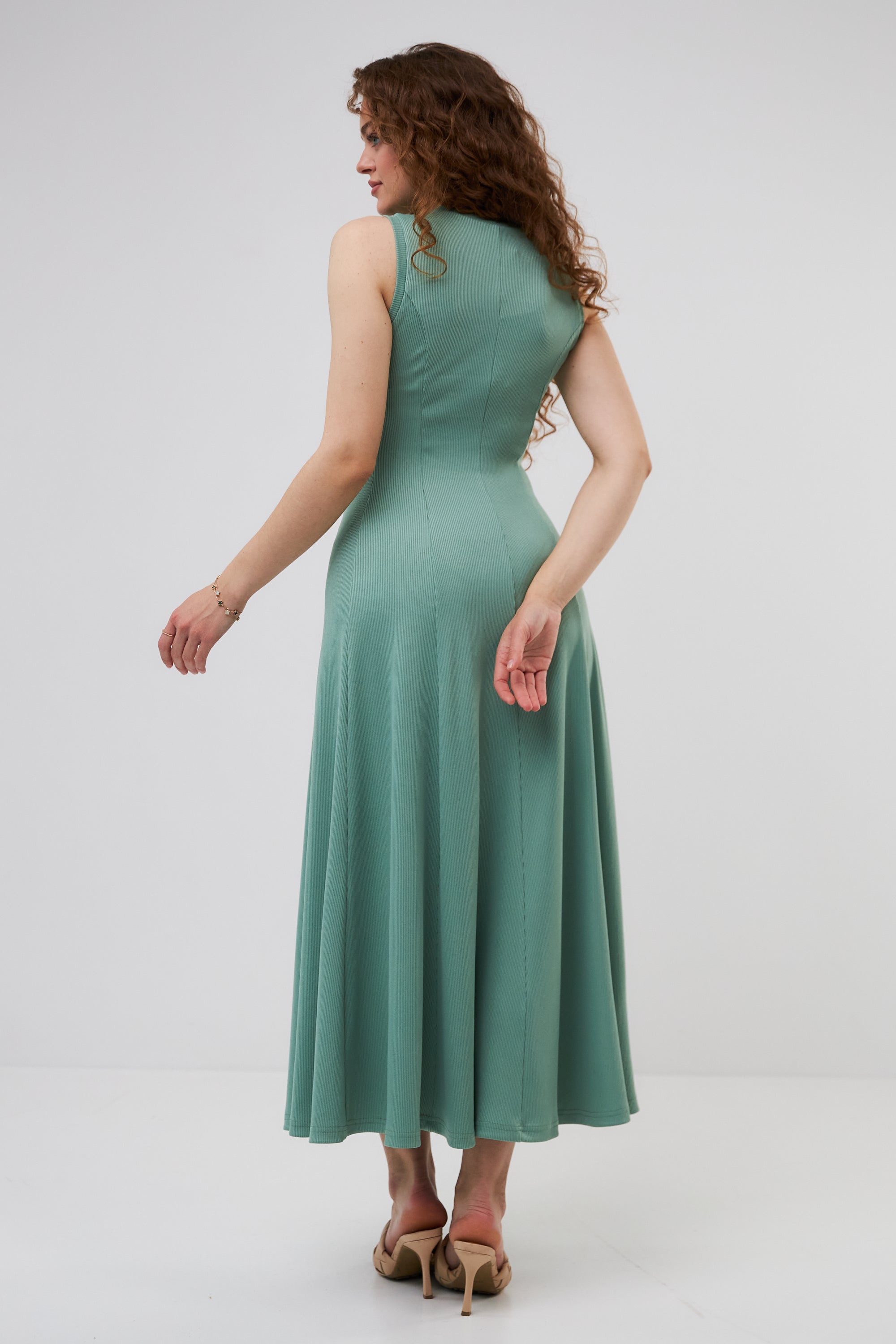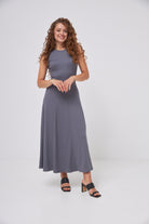 Модель має приталений ліф та розкльошену до низу спідницю, що надає образу легкості та жіночності. Круглий виріз горловини та відсутність рукавів роблять сукню ідеальною для теплої пори року, підкреслюючи витонченість плечей.