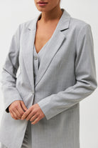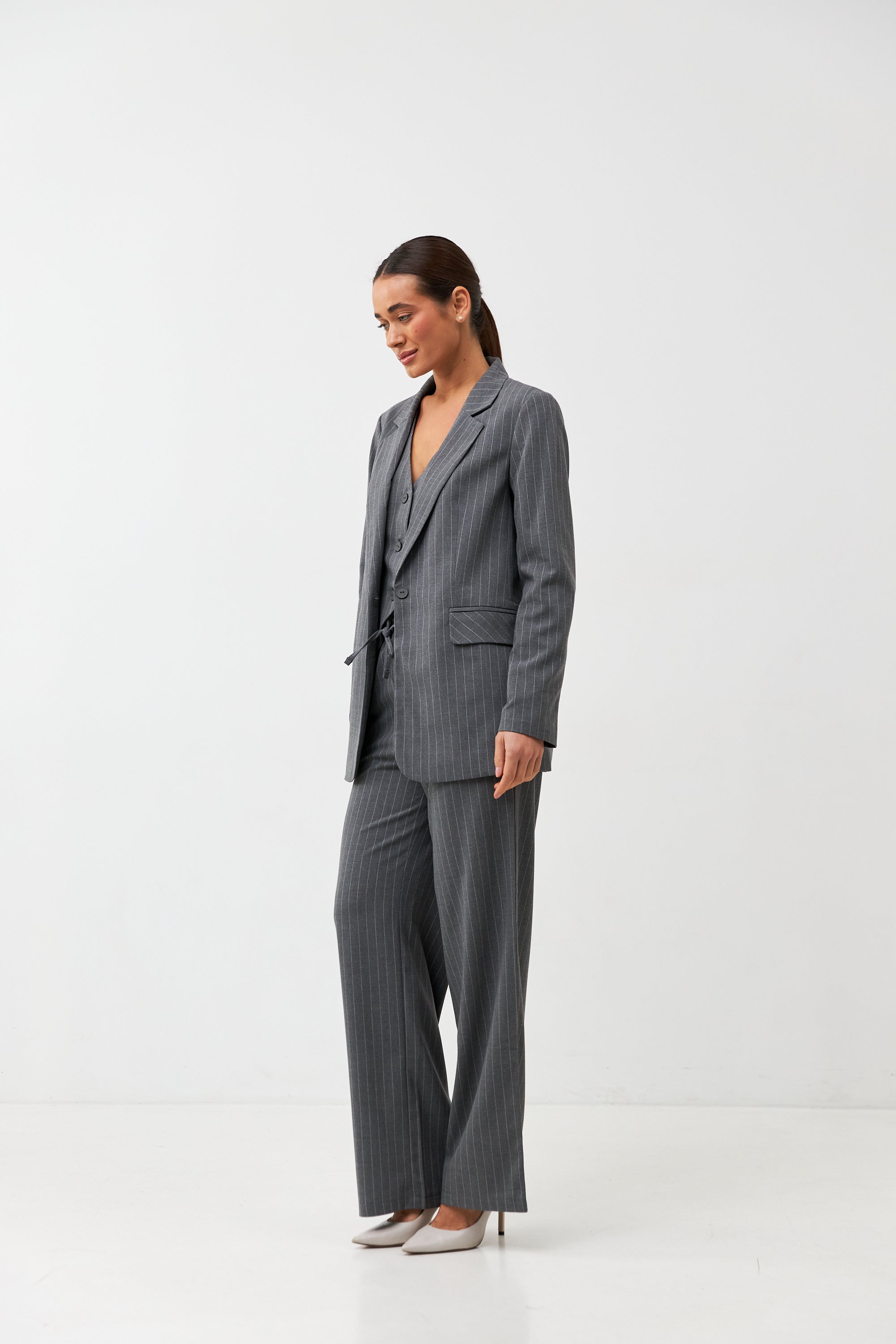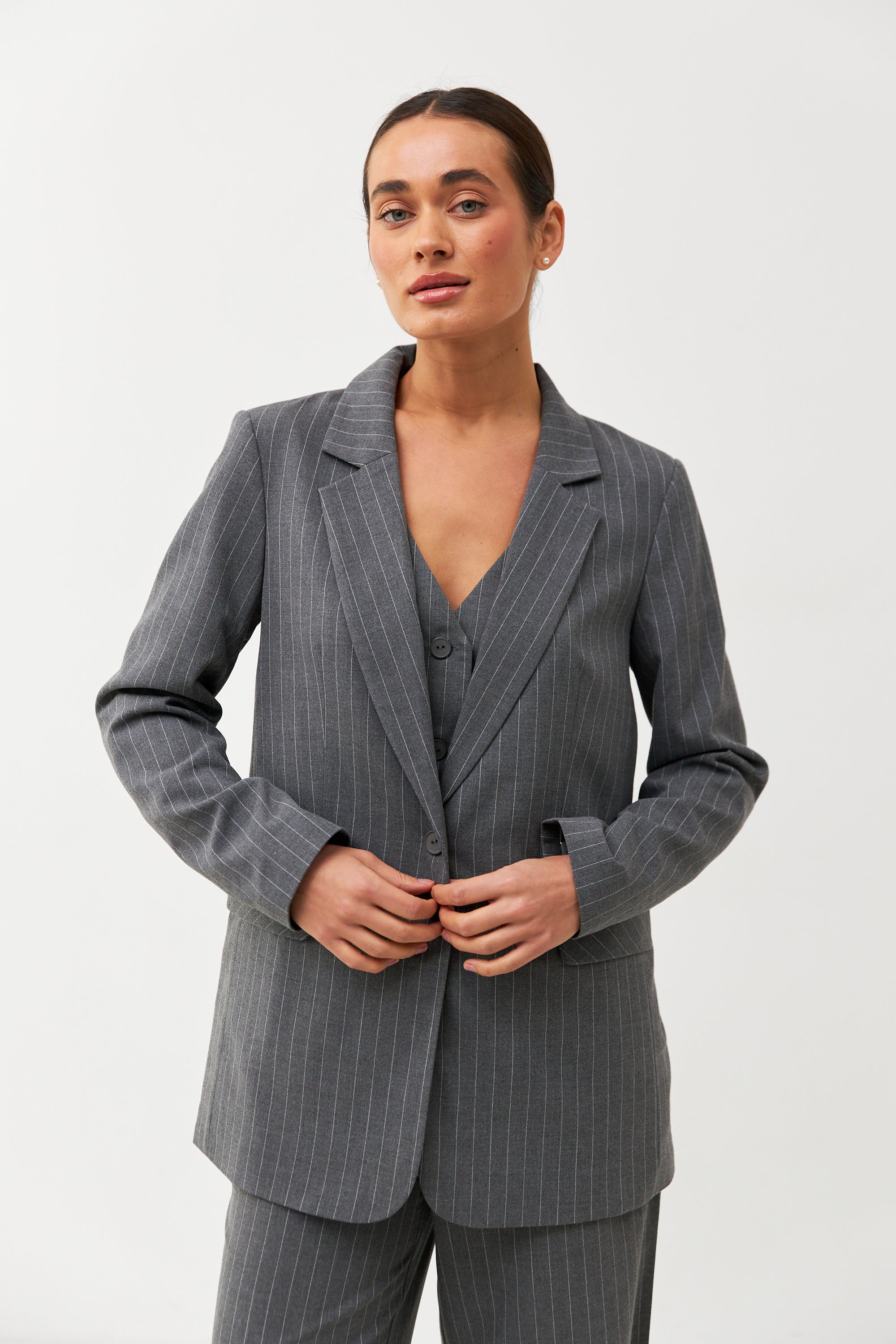 Безпрограшна класика, яка завжди в моді. Сірий жакет у тонку світлу смужку — ідеальний вибір для ділового або smart casual образу. Завдяки вивіреному крою та стриманому дизайну, він легко поєднується з брюками, спідницями чи навіть джинсами.