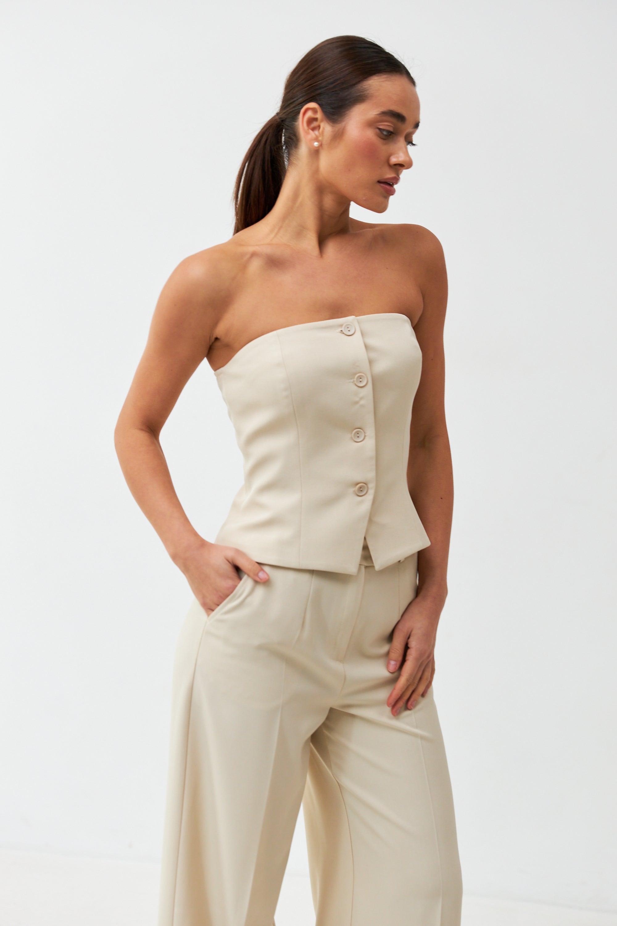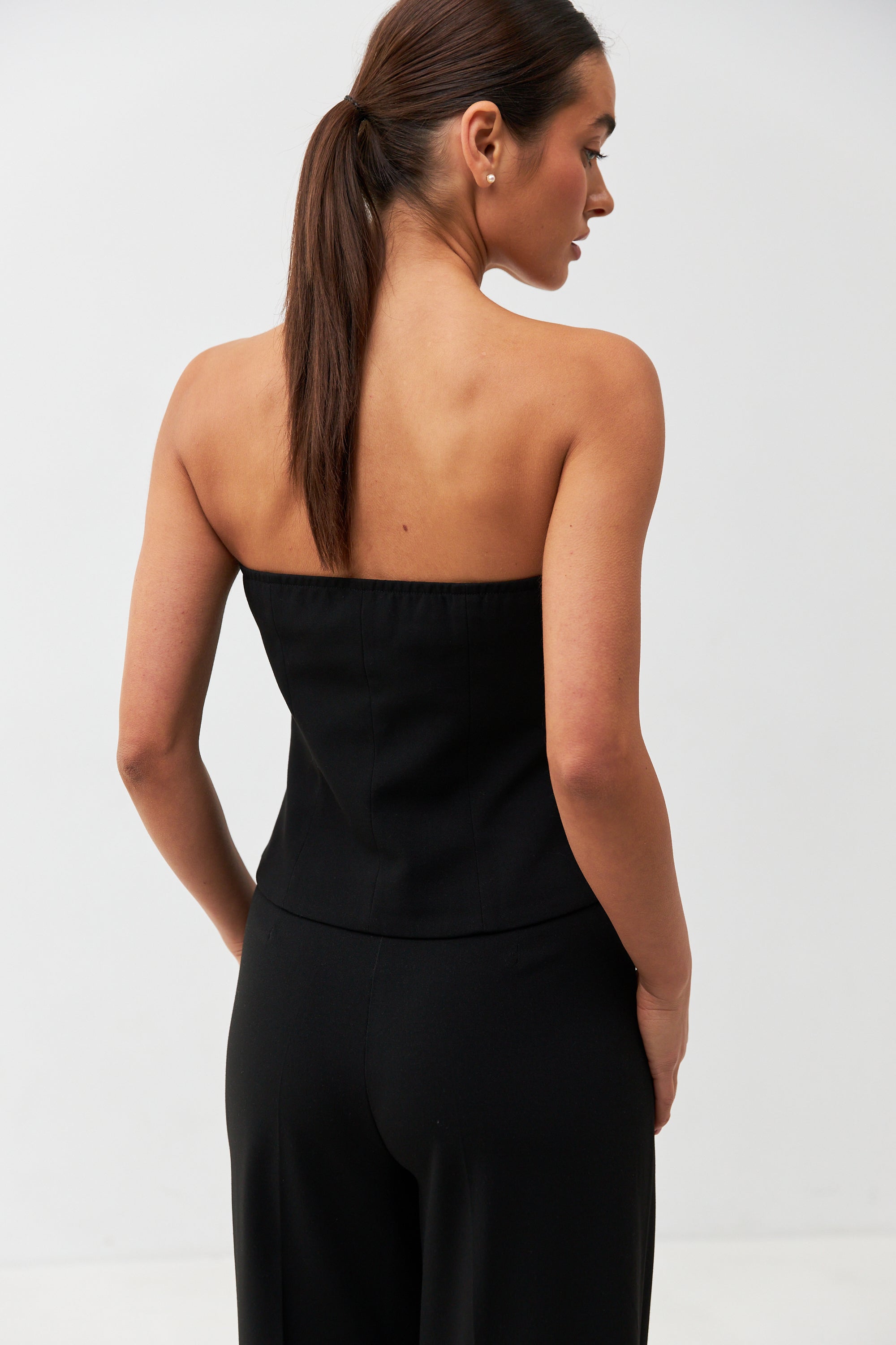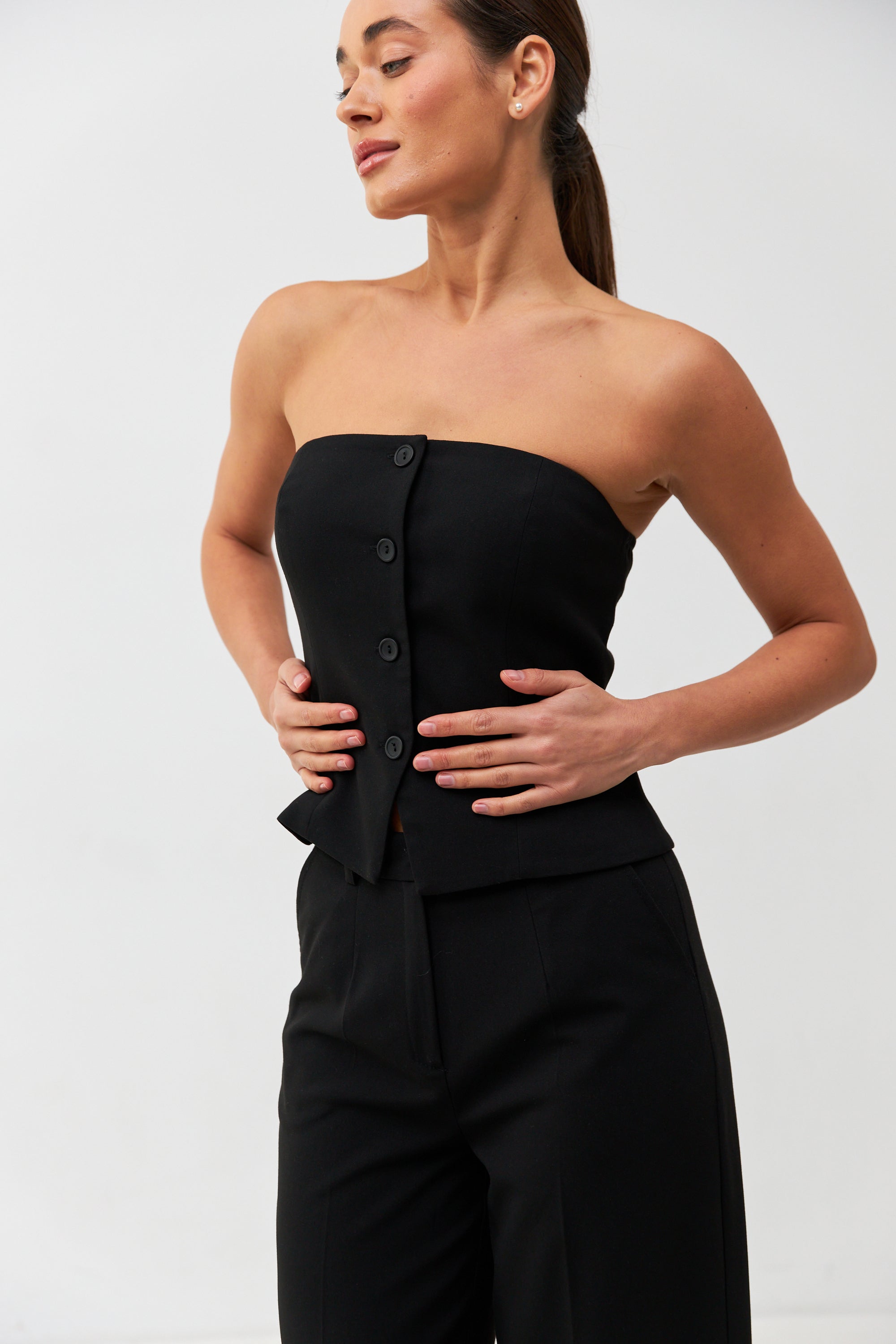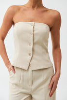 Елегантний жилет без бретелей — стильне та сміливе доповнення до вашого гардеробу. Завдяки відкритим плечам і приталеному силуету, він ідеально підкреслює фігуру та додає образу вишуканості й жіночності.