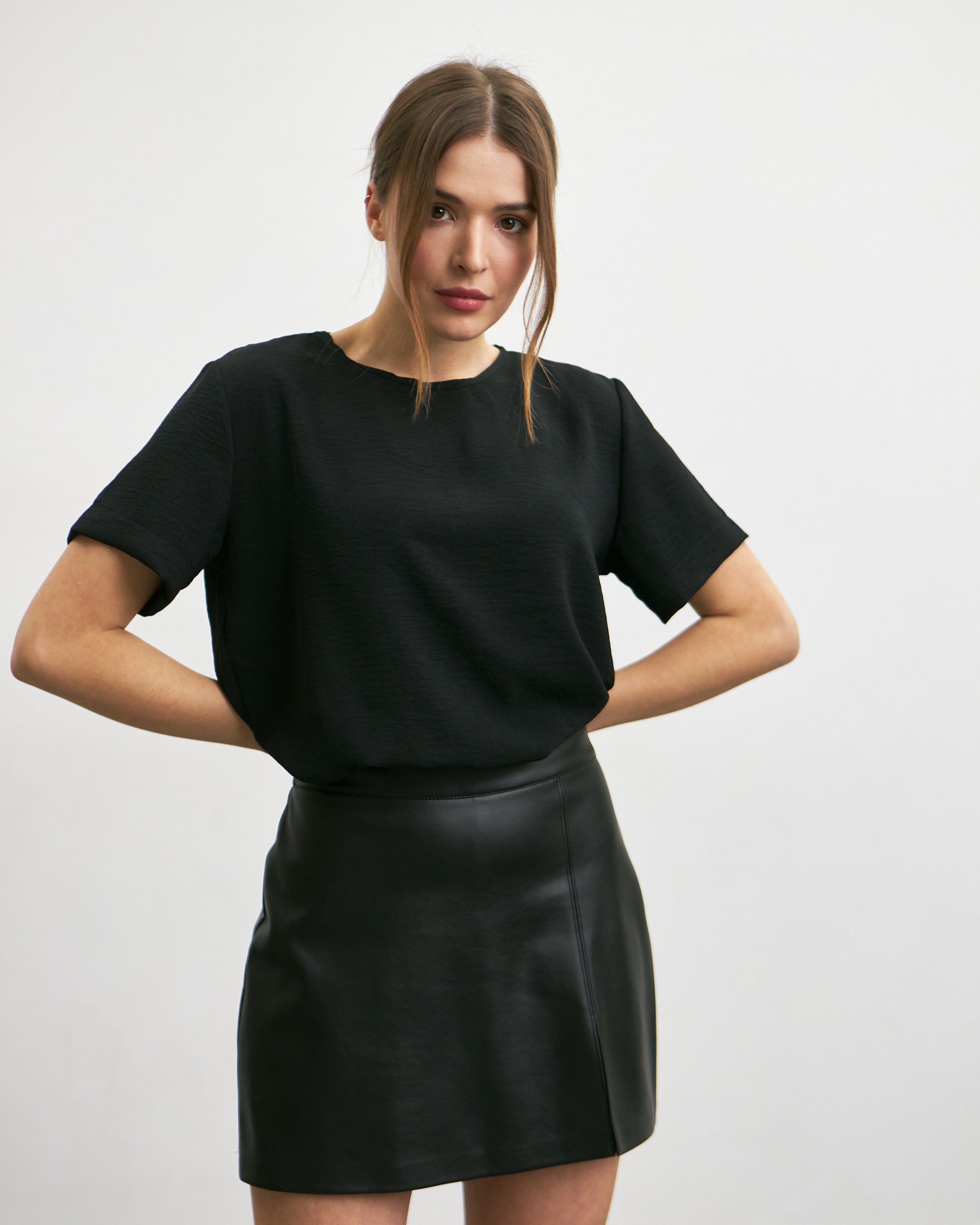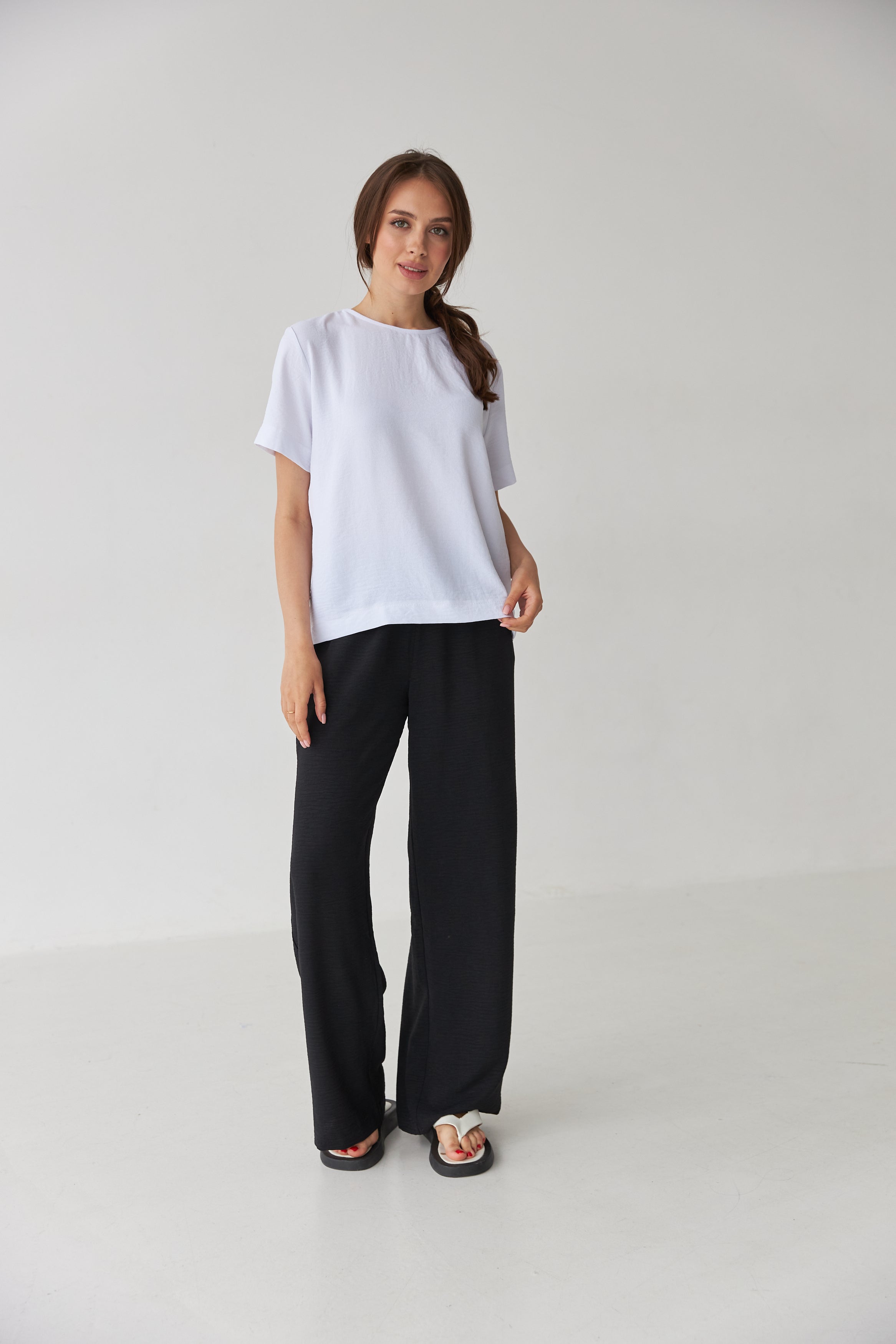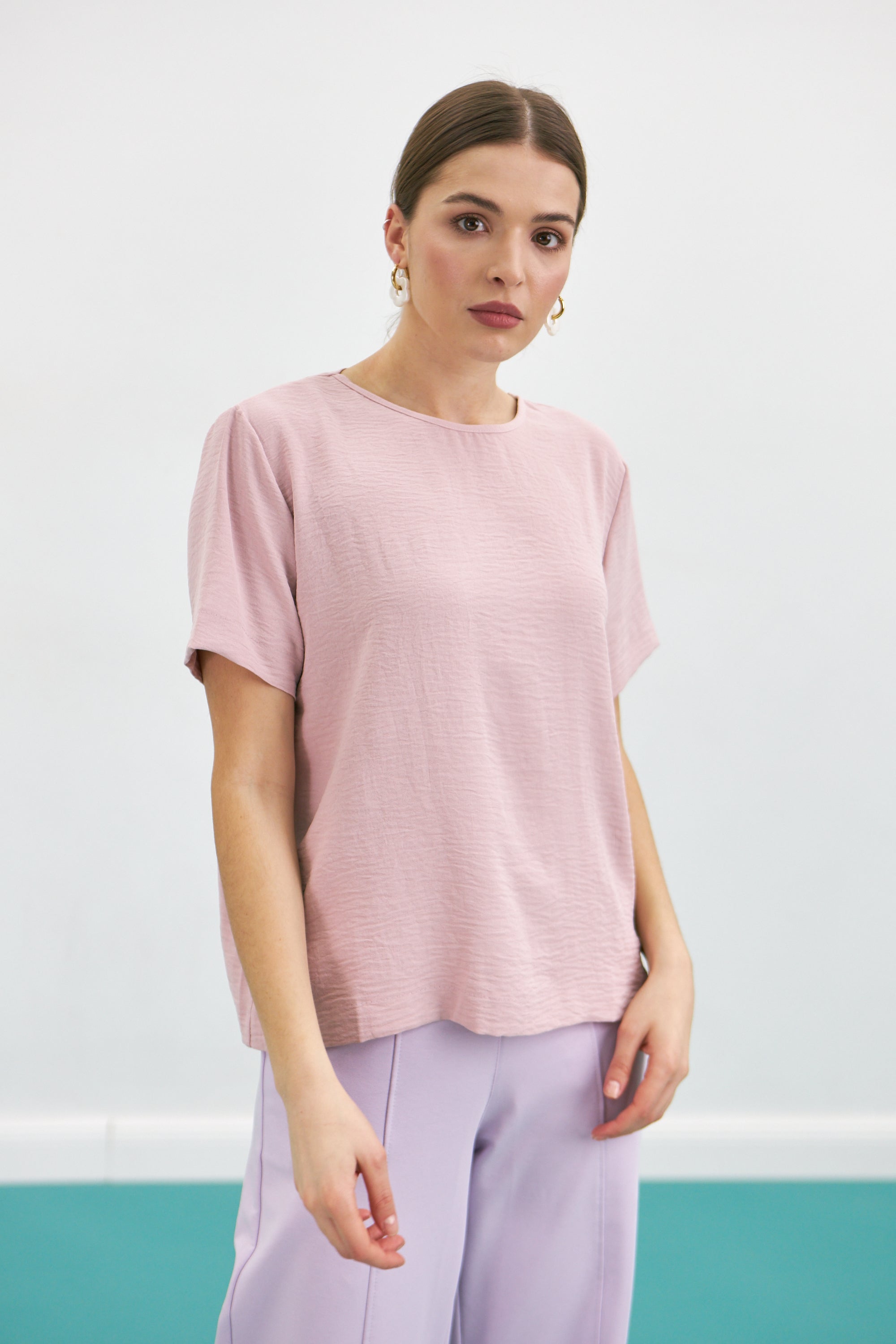 егка та елегантна блуза-футболка з американського крепу — ідеальний вибір для щоденного комфорту з ноткою вишуканості. Модель поєднує у собі простий крій та приємну на дотик тканину, що не мнеться, добре тримає форму й дарує відчуття легкості протягом усього дня.