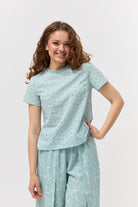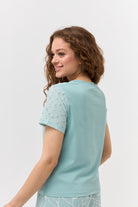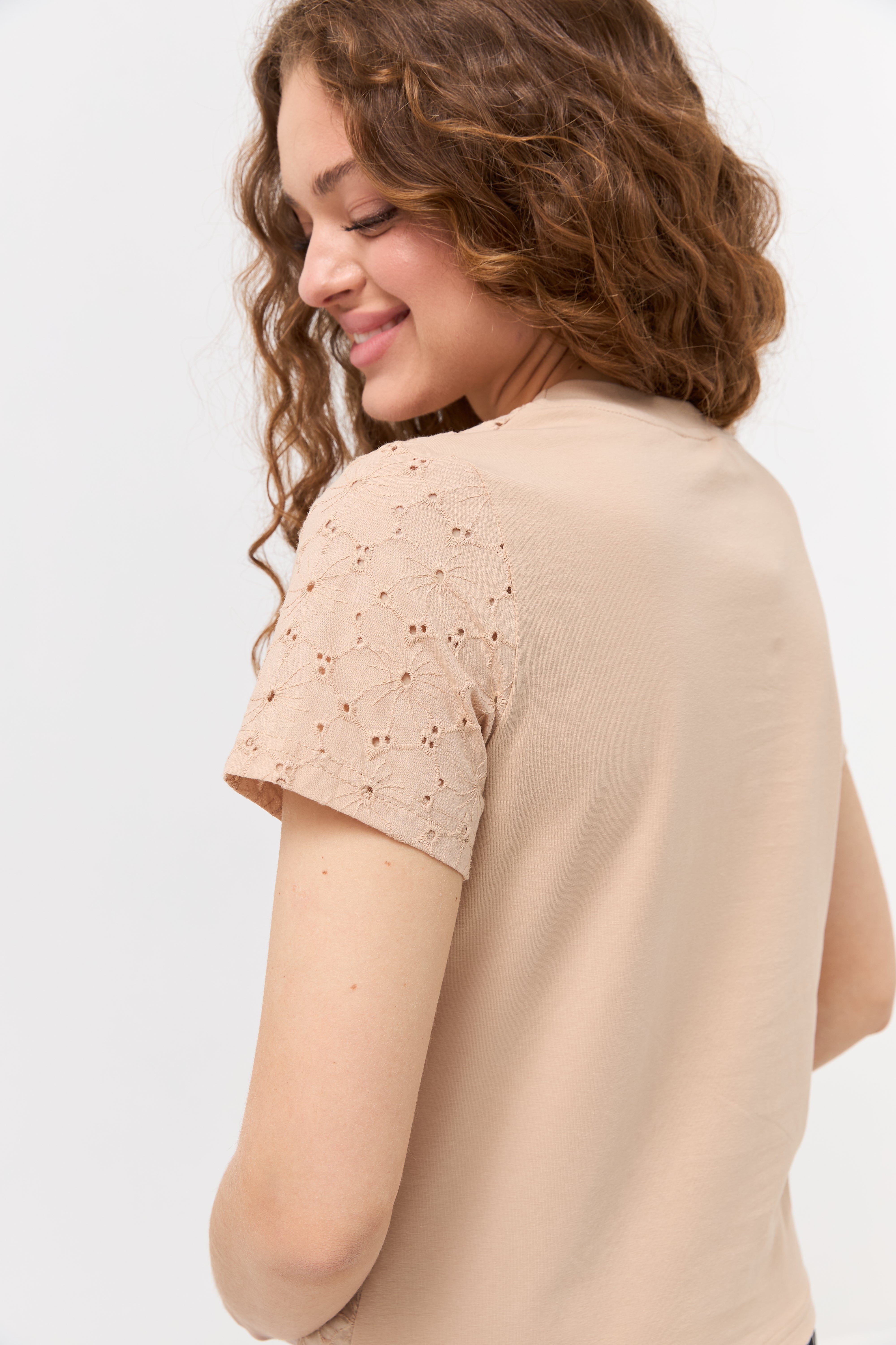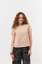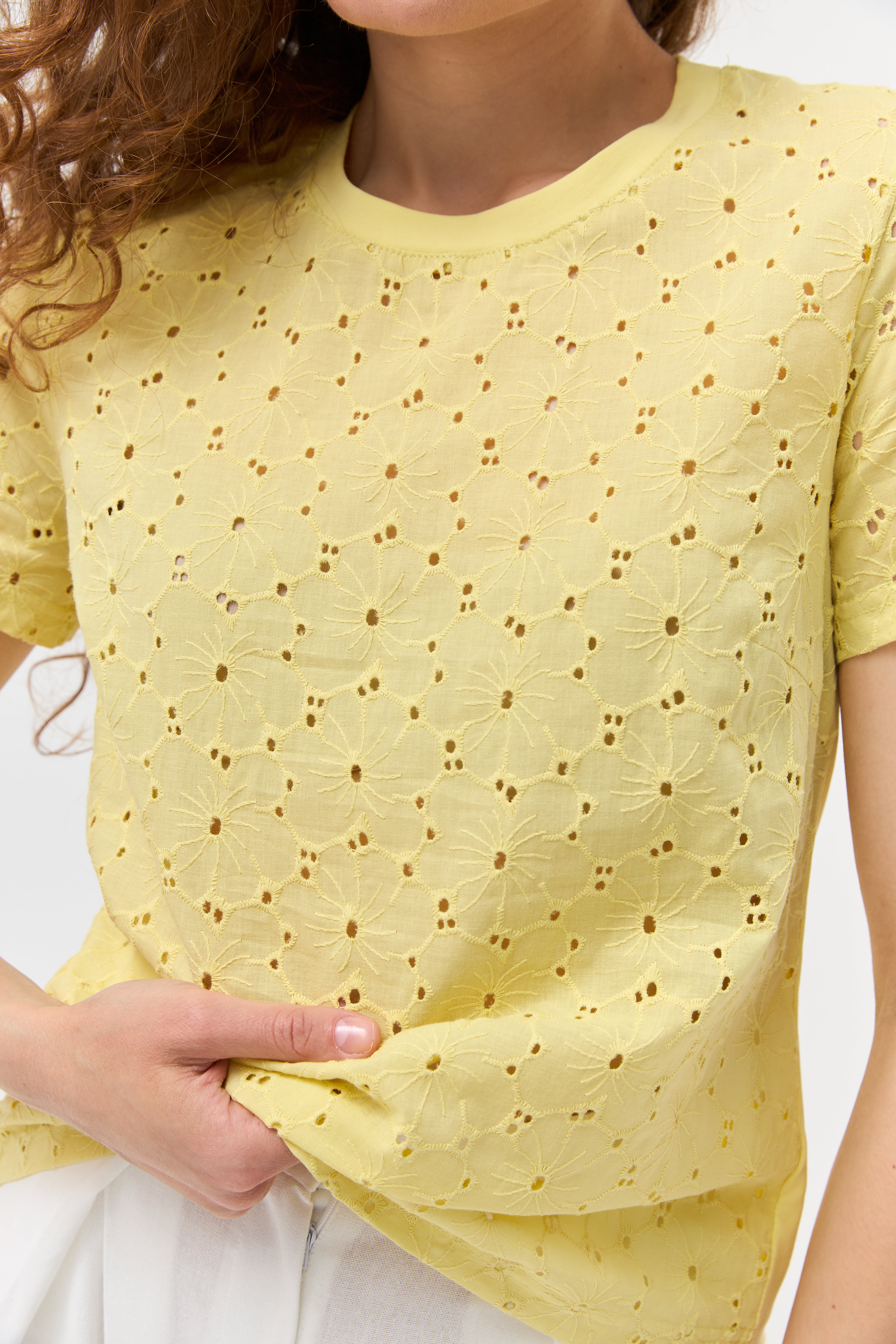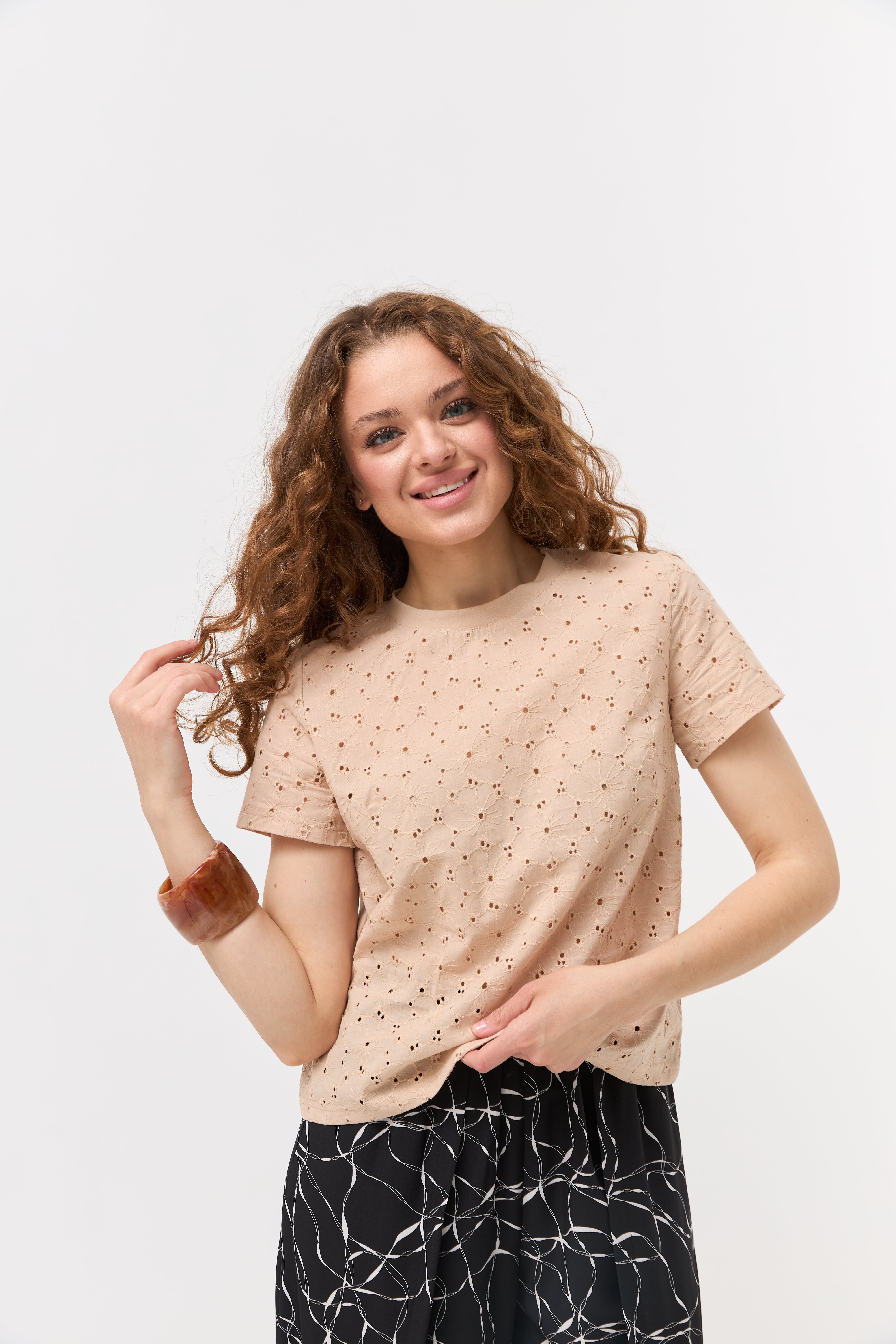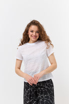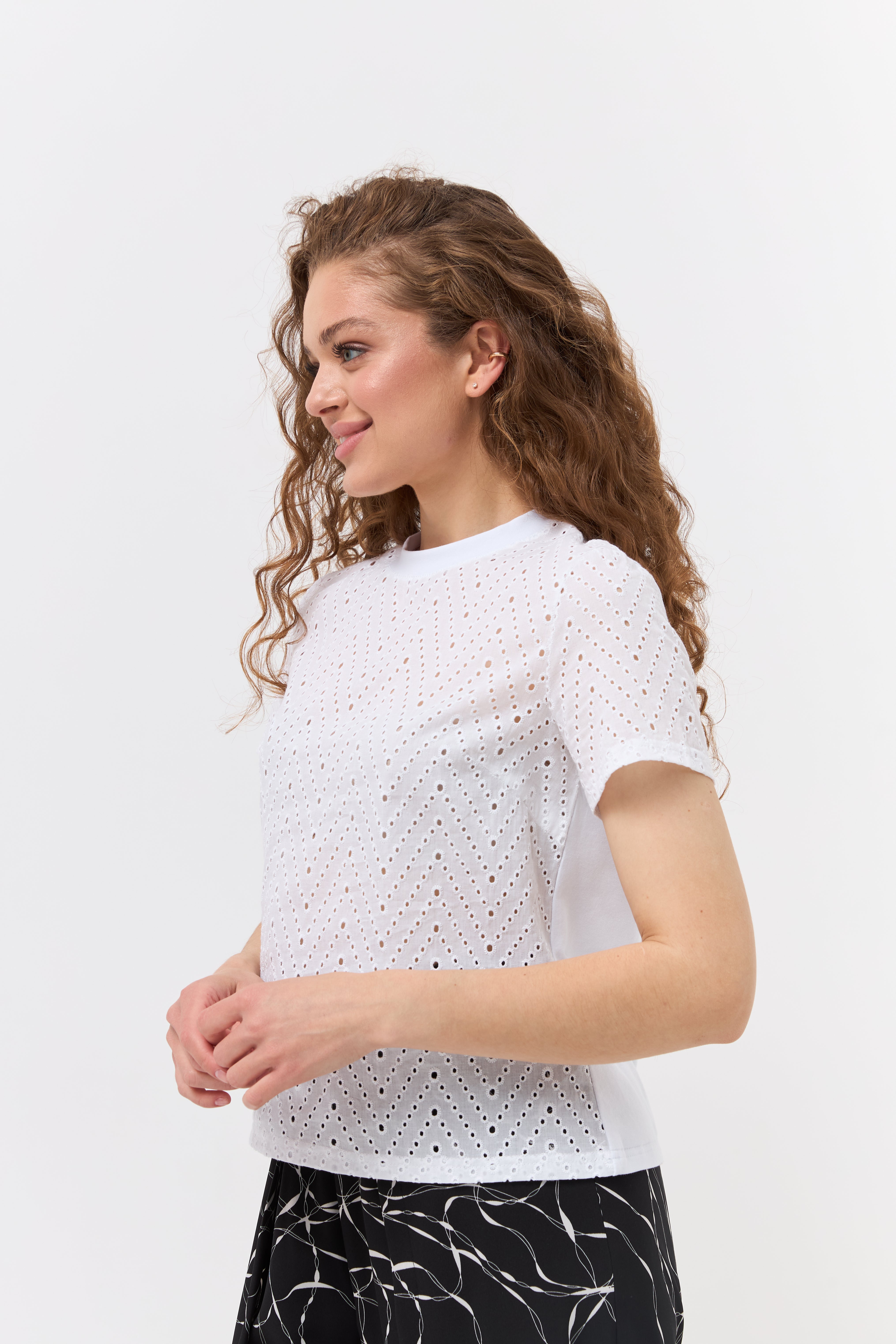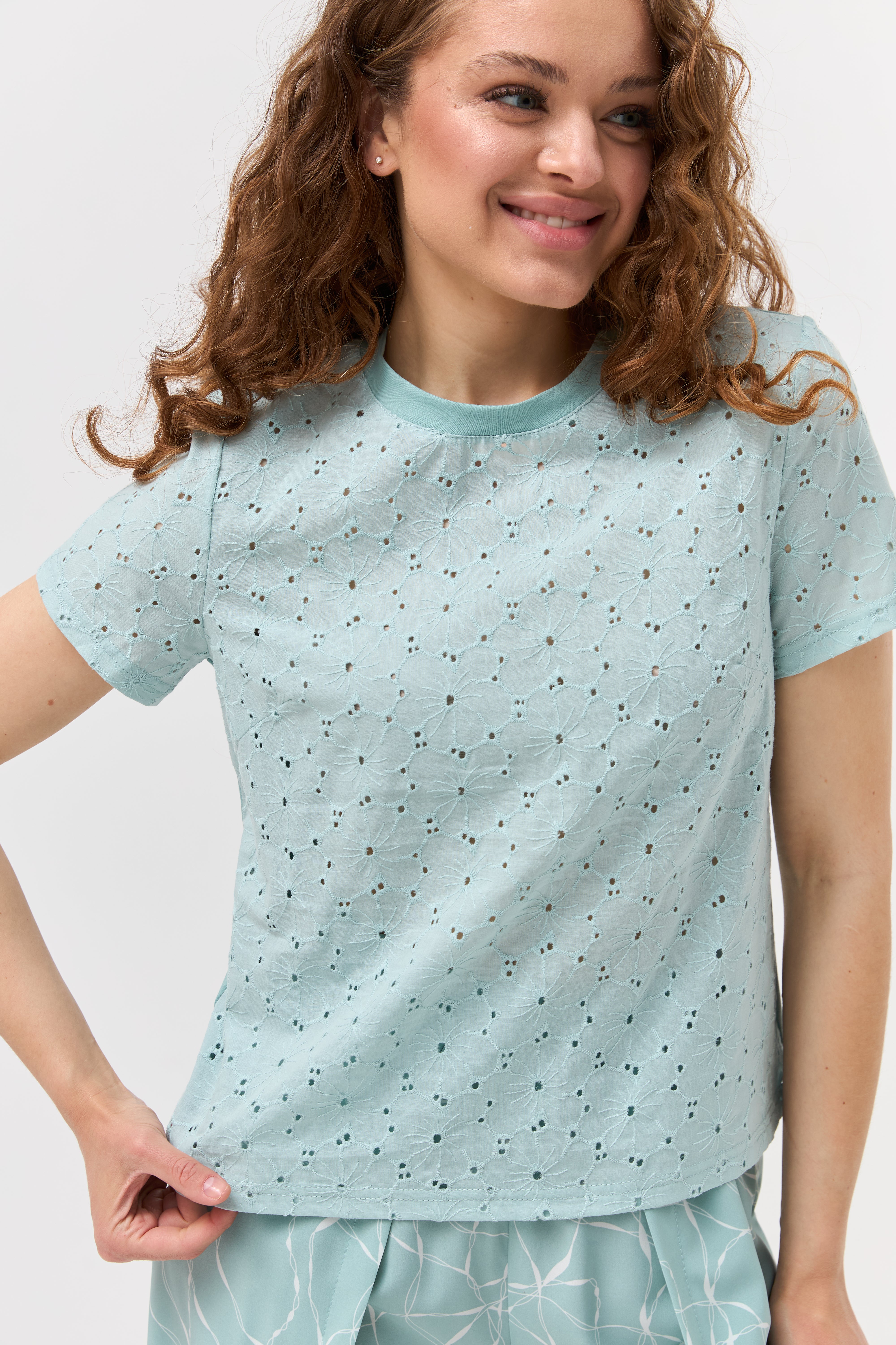 Насолоджуйтесь легкістю та комфортом у спекотні дні з нашою жіночою футболкою, виготовленою з натуральної тканини батист. Цей дихаючий матеріал ідеально підходить для літа. Витончений ажурний візерунок по всій футболці додає їй ніжності та оригінальності. Короткі рукави та зручний круглий виріз роблять цю модель практичною та стильною для повсякденного носіння. Поєднуйте з улюбленими джинсами, шортами чи спідницями для створення легких та елегантних образів.