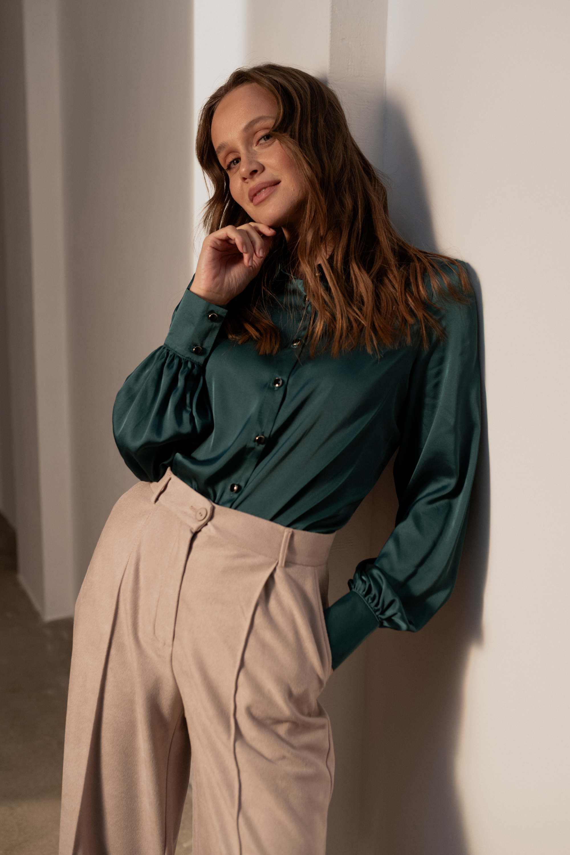 Вишукана блуза з делікатного шовку стане ідеальним доповненням до вашого гардеробу. Модель має прямий крій, класичний комір і застібається на витончені ґудзики по всій довжині. Рукави зі збірками на манжетах додають жіночності та елегантності. Тканина приємна до тіла, має м’який блиск та створює відчуття легкості й комфорту протягом усього дня.