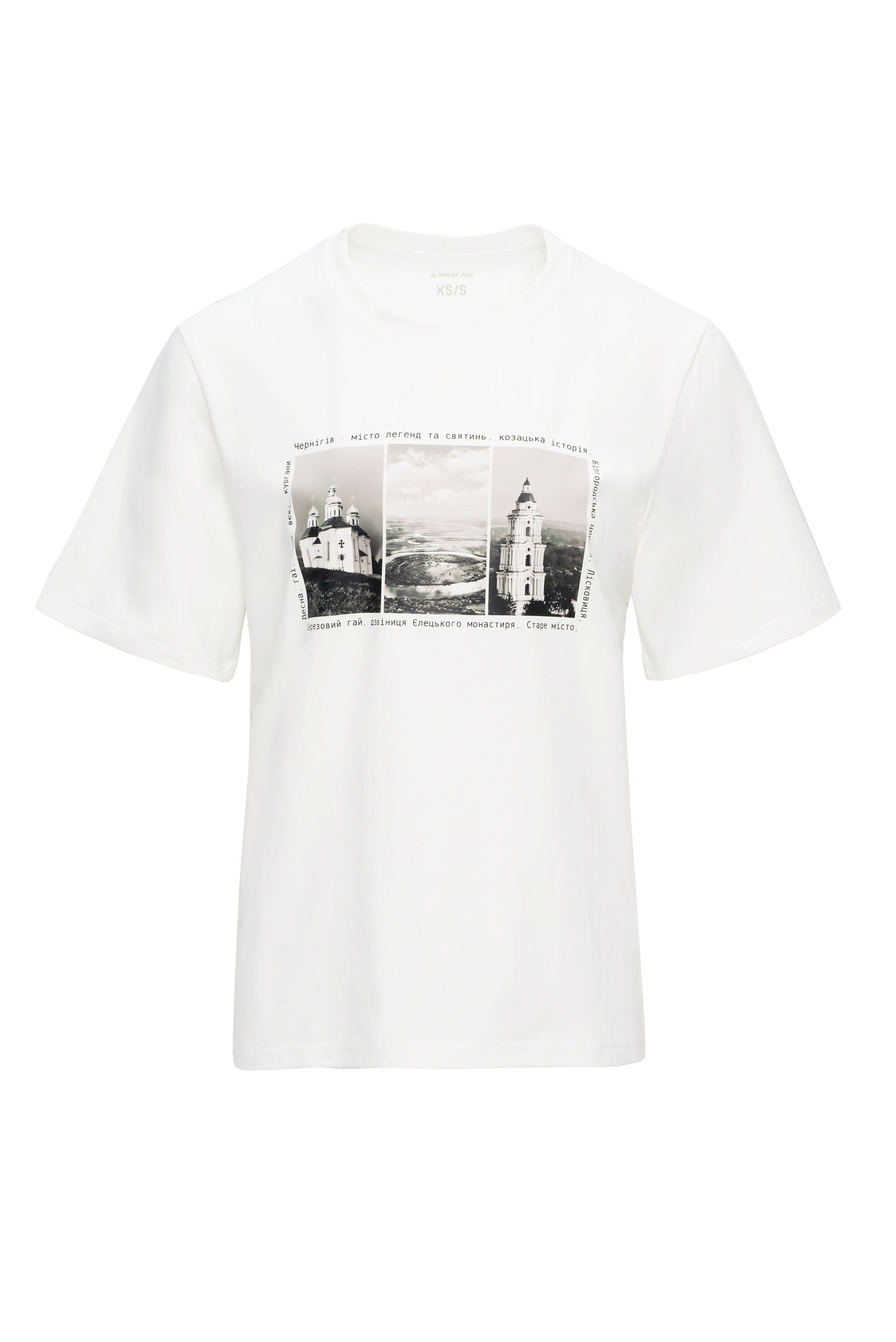 Жіноча футболка з лінійки "Вдома" з авторським принтом, присвяченим Чернігову — місту легенд, святинь та козацької історії.