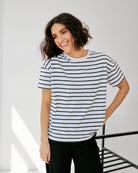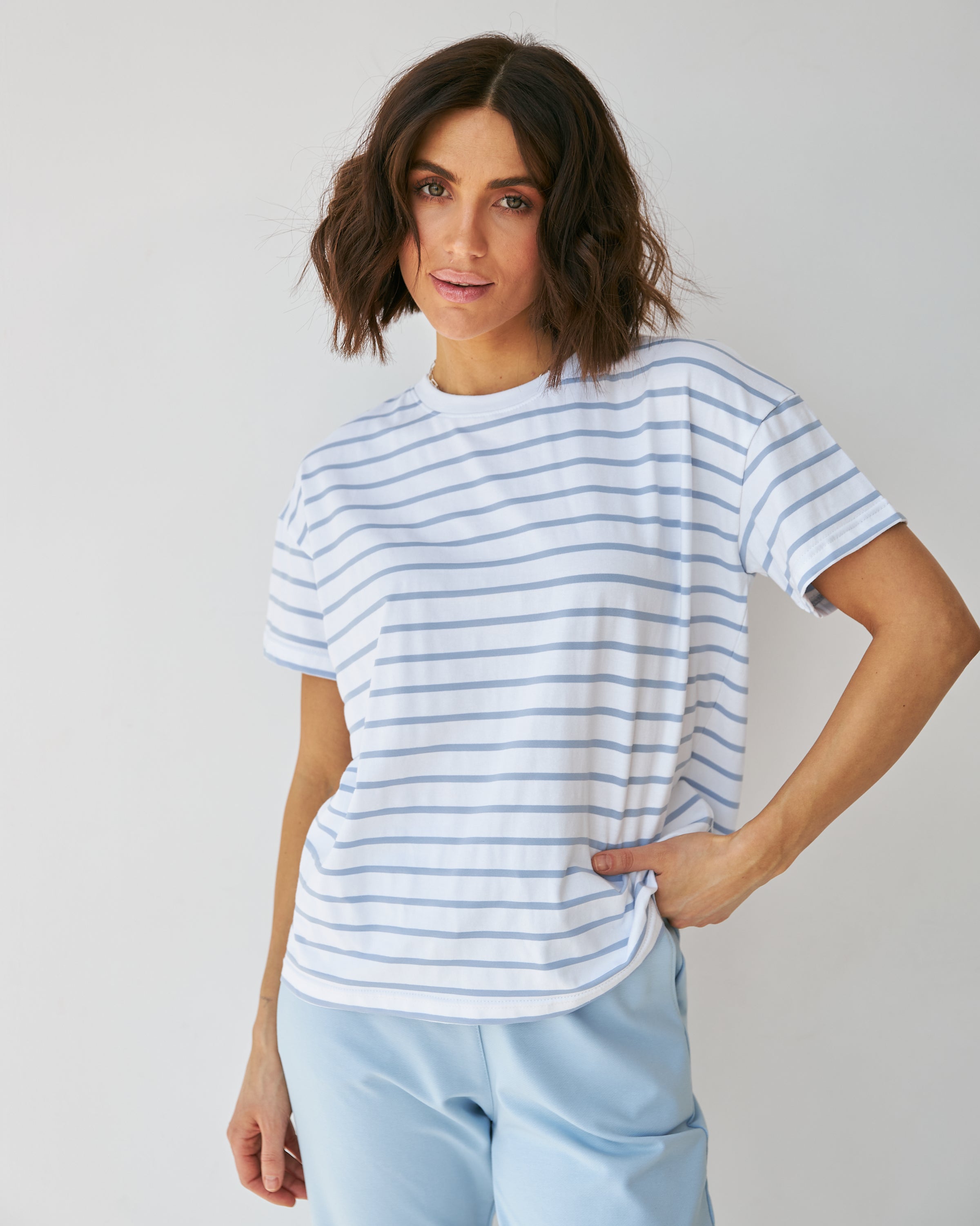 Футболка вільного крою з полоскою — класика, що не виходить з моди. Її стильний смужковий принт додає свіжості образу, а вільний крій забезпечує комфорт і свободу рухів. Легка тканина і нейтральний дизайн роблять цю футболку універсальним вибором для будь-якої пори року та різних стилів.