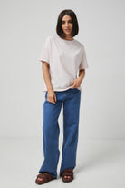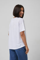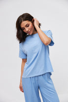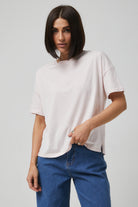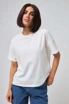 Жіноча футболка з подовженою спинкою та розрізами з боків, виготовлена з м'якої бавовняної тканини. Класичний круглий виріз та короткі рукави забезпечують комфорт, а асиметричний крій додає сучасного вигляду. Ідеально поєднується з вузькими джинсами або легінсами для створення стильного повсякденного образу.