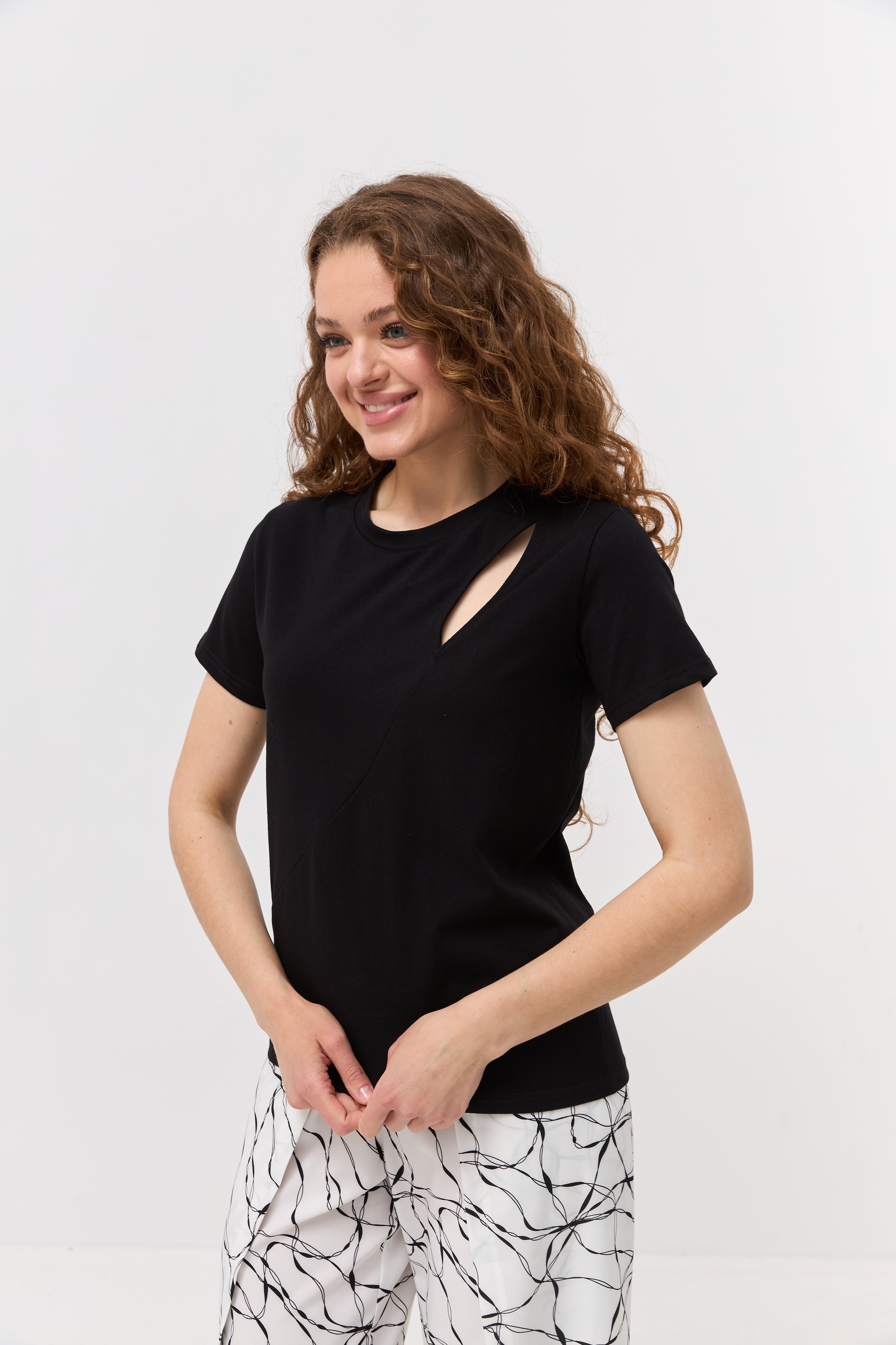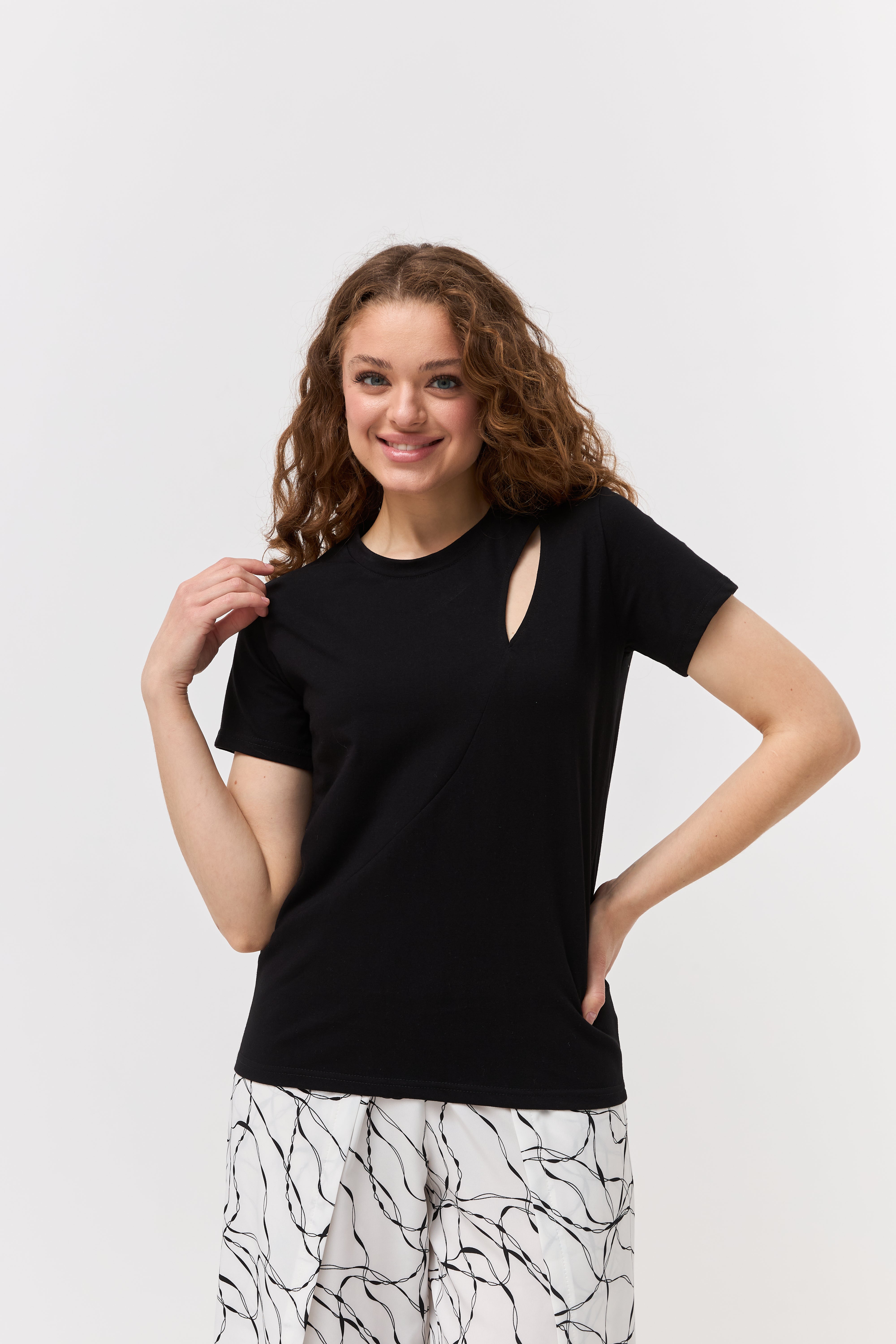 Стильна та жіночна футболка, виготовлена з м'якої та приємної на дотик кулірної гладі. Цей легкий та дихаючий матеріал ідеально підходить для повсякденного носіння, забезпечуючи комфорт протягом усього дня. Оригінальний асиметричний розріз на плечі додає цій футболці особливої модної нотки та привертає увагу.