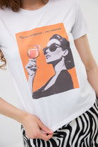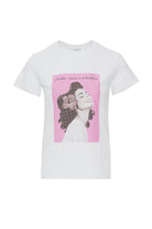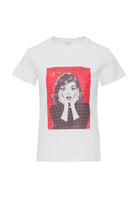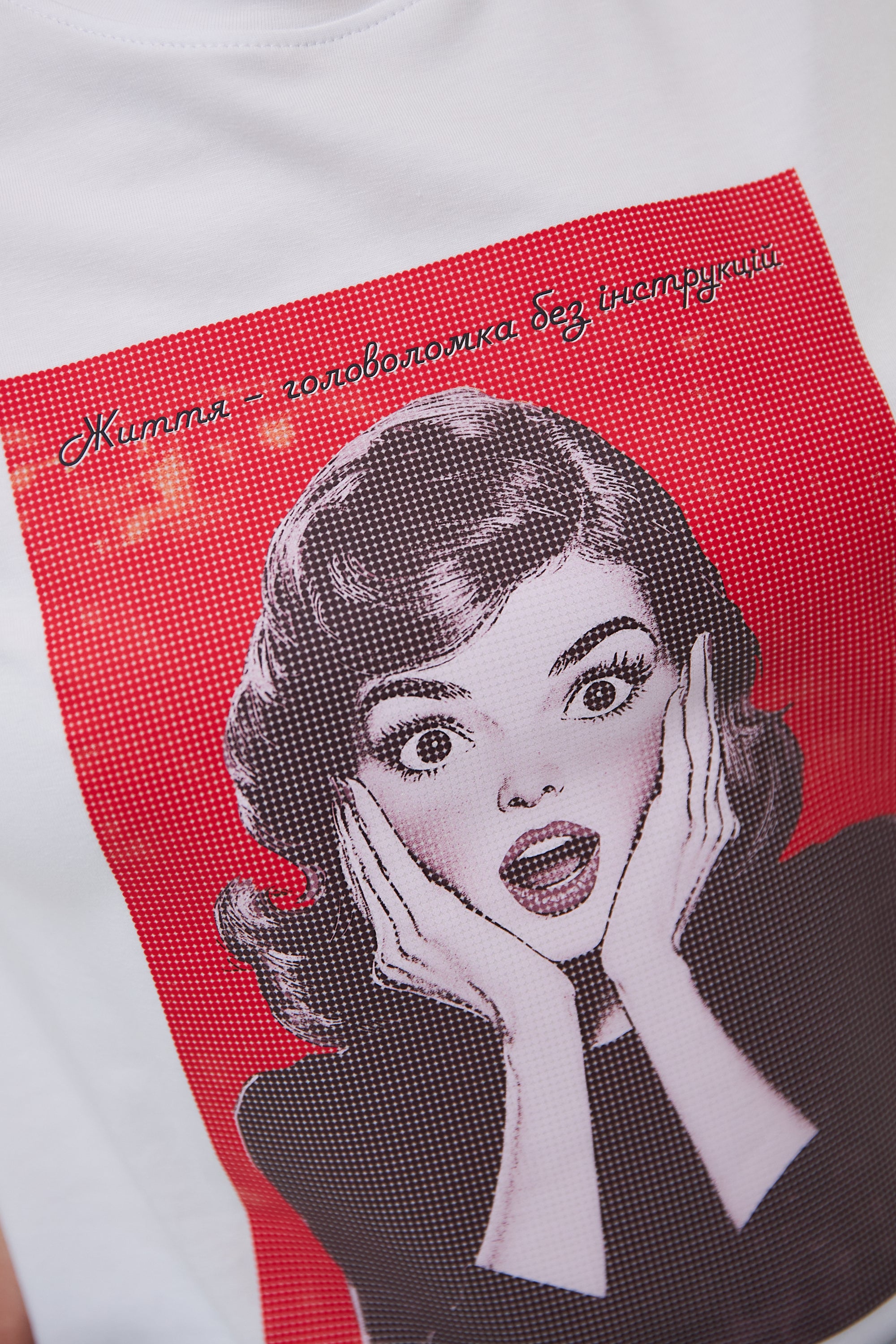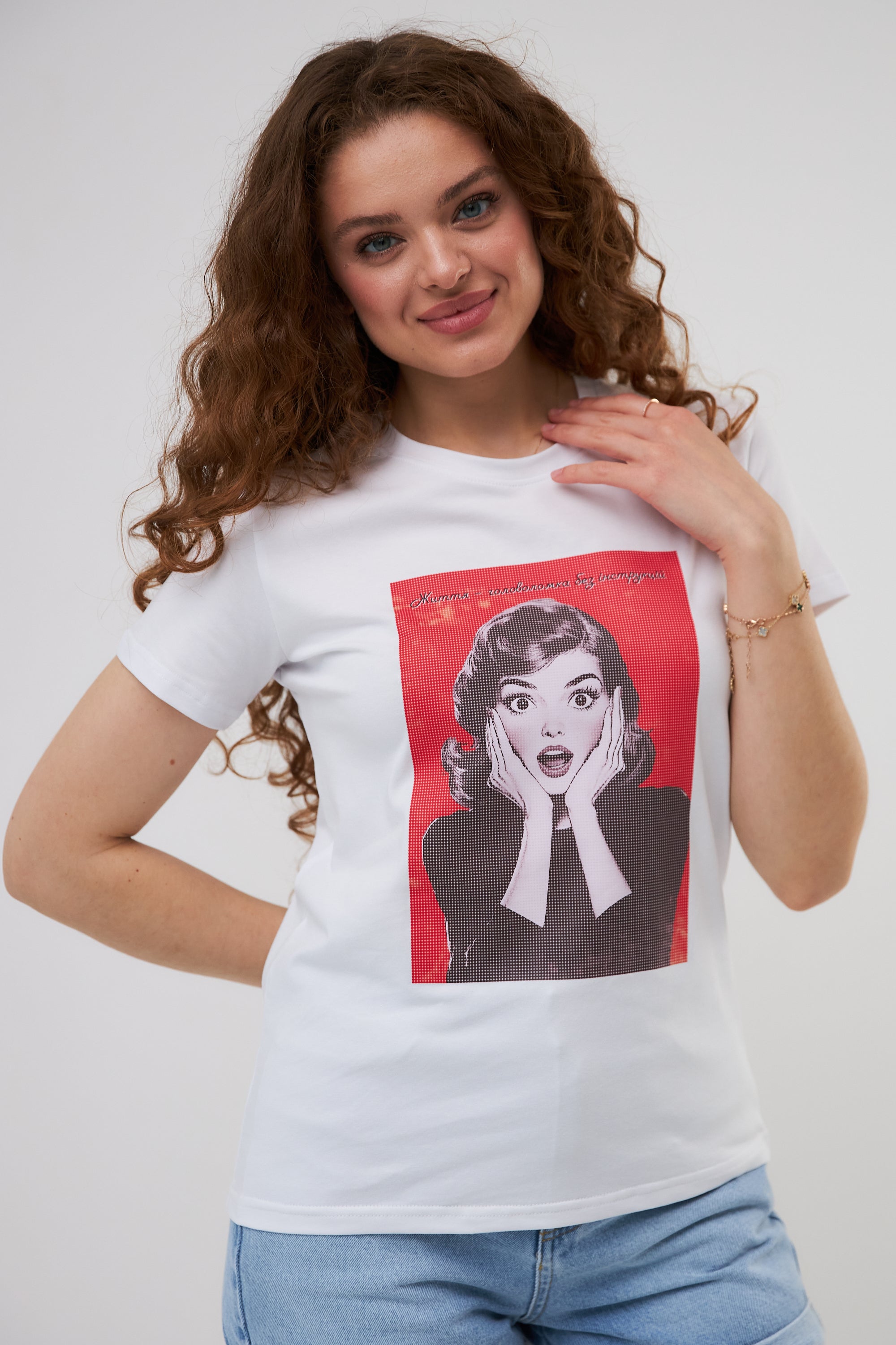 Додайте нотку вишуканості та жіночності до свого гардеробу з цією стильною білою футболкою. Її прикрашає оригінальний принт із зображенням жіночого обличчяі. Фон підкреслює елегантність композиції.
