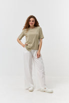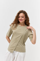 Оновіть свій повсякденний гардероб за допомогою цієї модної футболки, виготовленої з м'якої та приємної на дотик кулірної гладі (куліру). Цей легкий бавовняний трикотаж забезпечує відмінну повітропроникність та комфорт у теплу пору року. Особливістю цієї моделі є оригінальне асиметричне драпірування спереду, яке додає образу вишуканості та індивідуальності.Футболка має короткі рукави та круглий виріз горловини, що робить її універсальною для поєднання з різноманітним низом – від джинсів та шортів до спідниць та брюк. Спокійний оливковий колір легко впишеться у ваш гардероб та дозволить створювати безліч стильних образів.